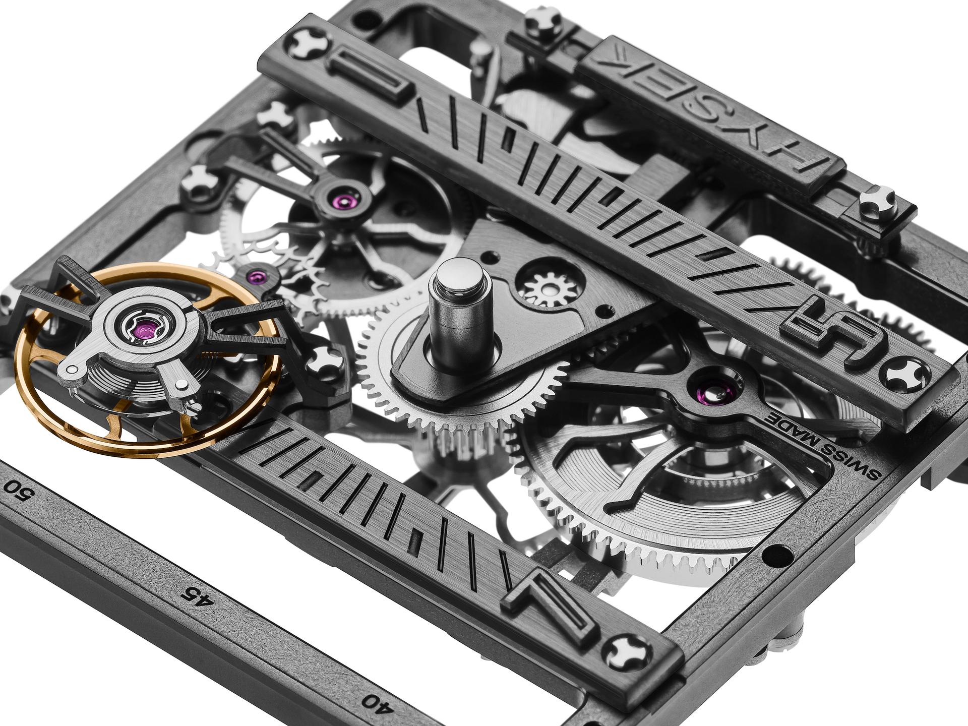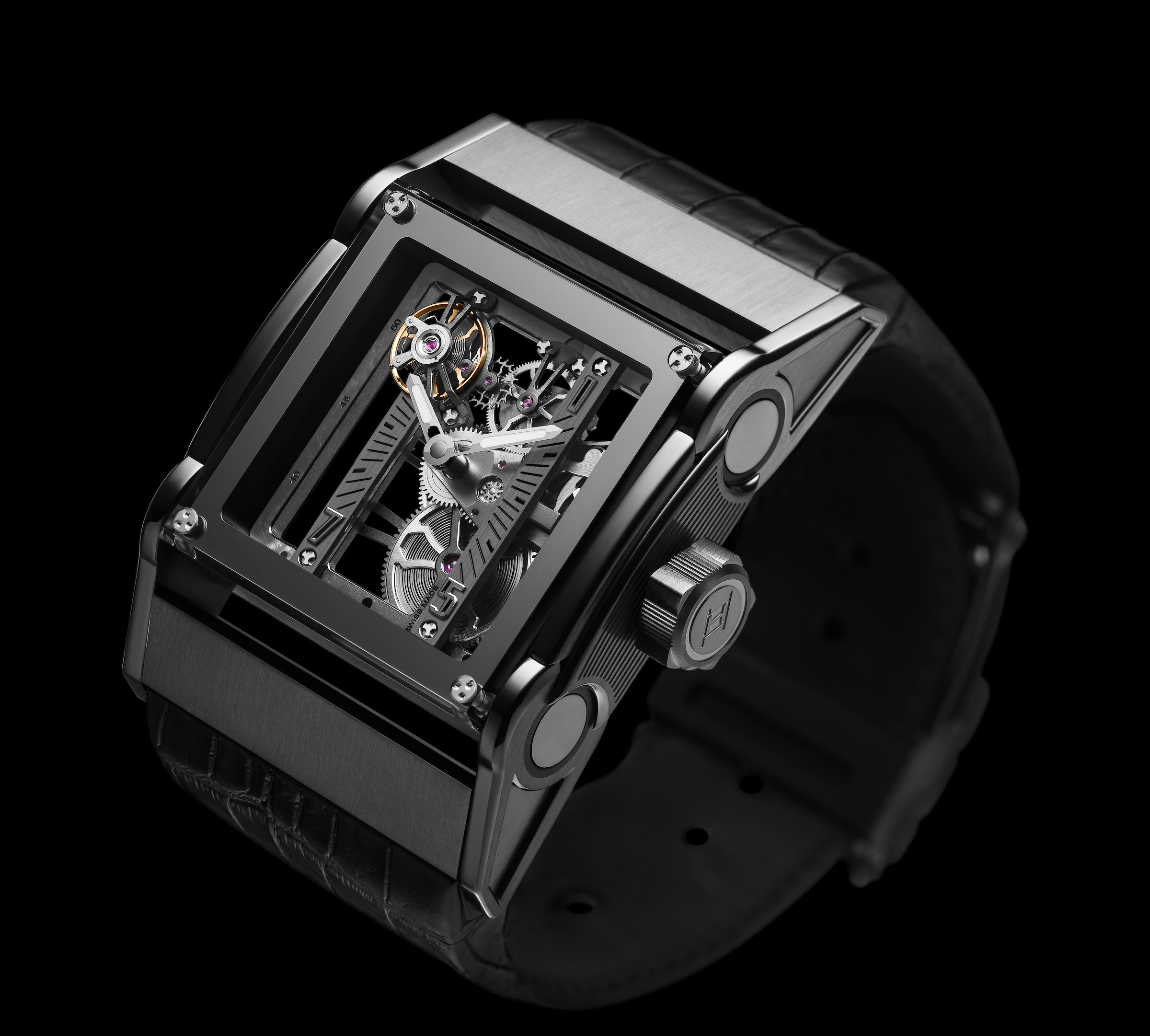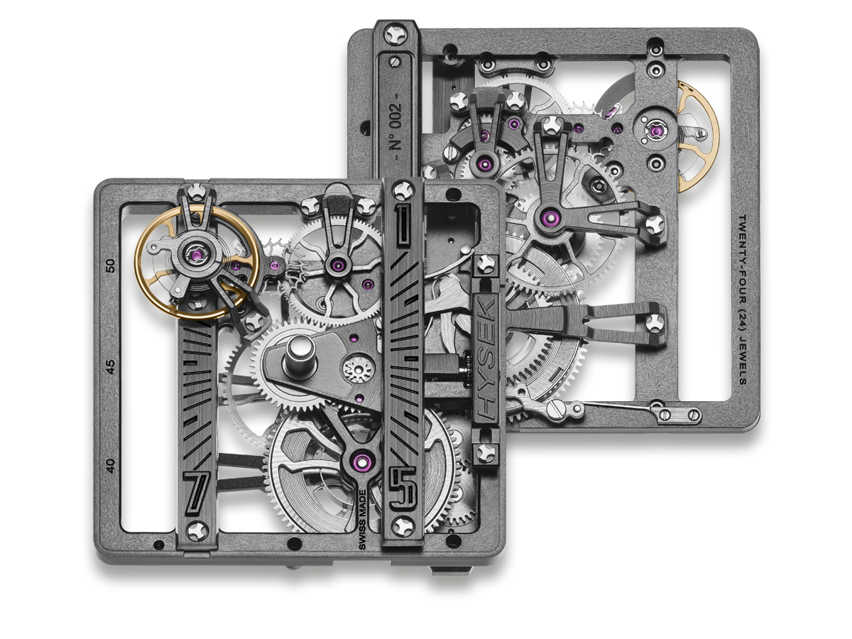 The most distinctive feature is visible on the movement’s square chassis, running all around the case: a ‘charcoaled’ finish. The charbonnage technique in question is hardly ever used in watchmaking, but Hysek has chosen to give it pride of place here. It involves applying a stick of a specific type of charcoal, by hand, leaving a unique pattern and forming an extremely soft, gentle abrasion that brings out all the highlights of the surface.