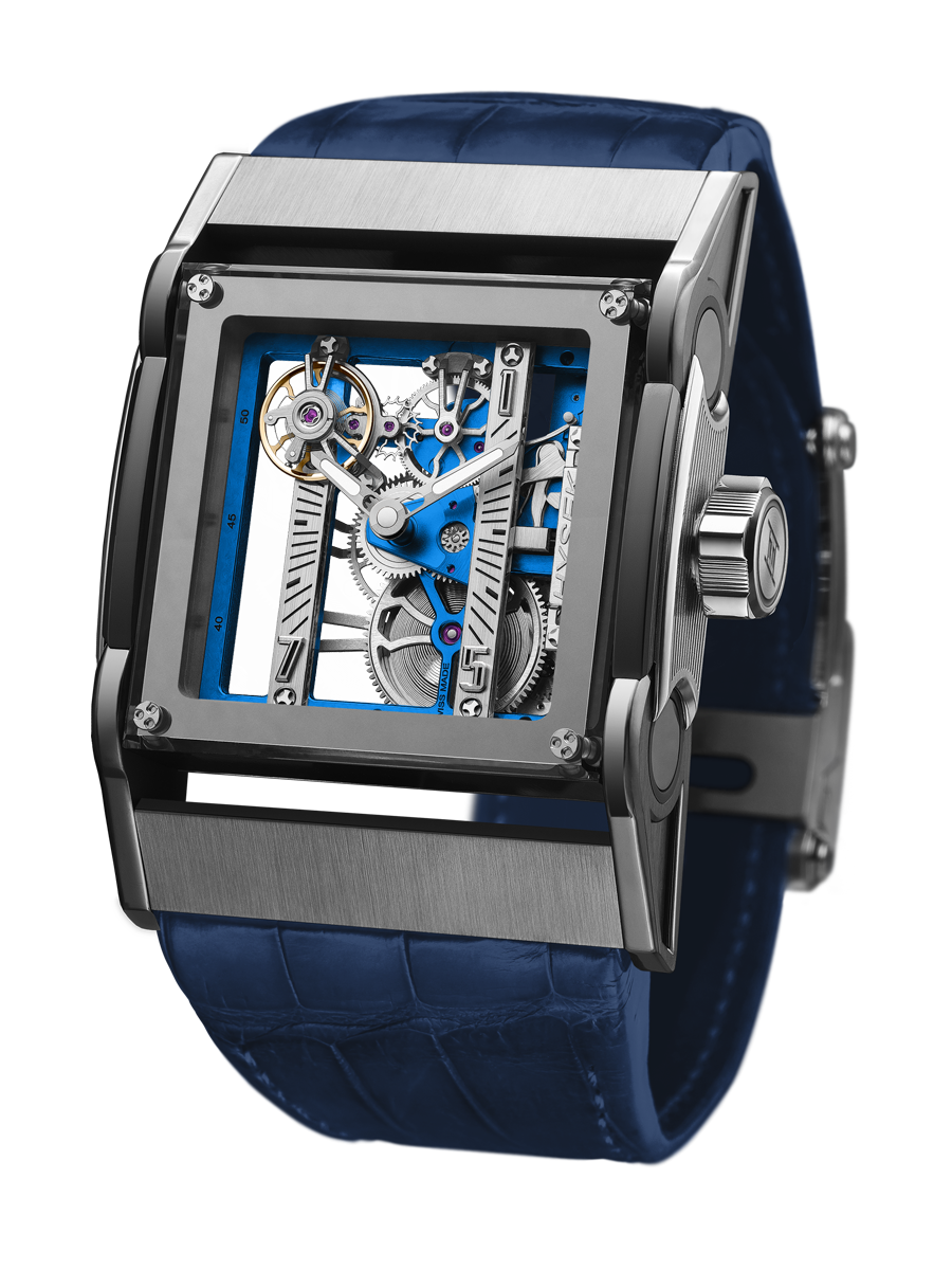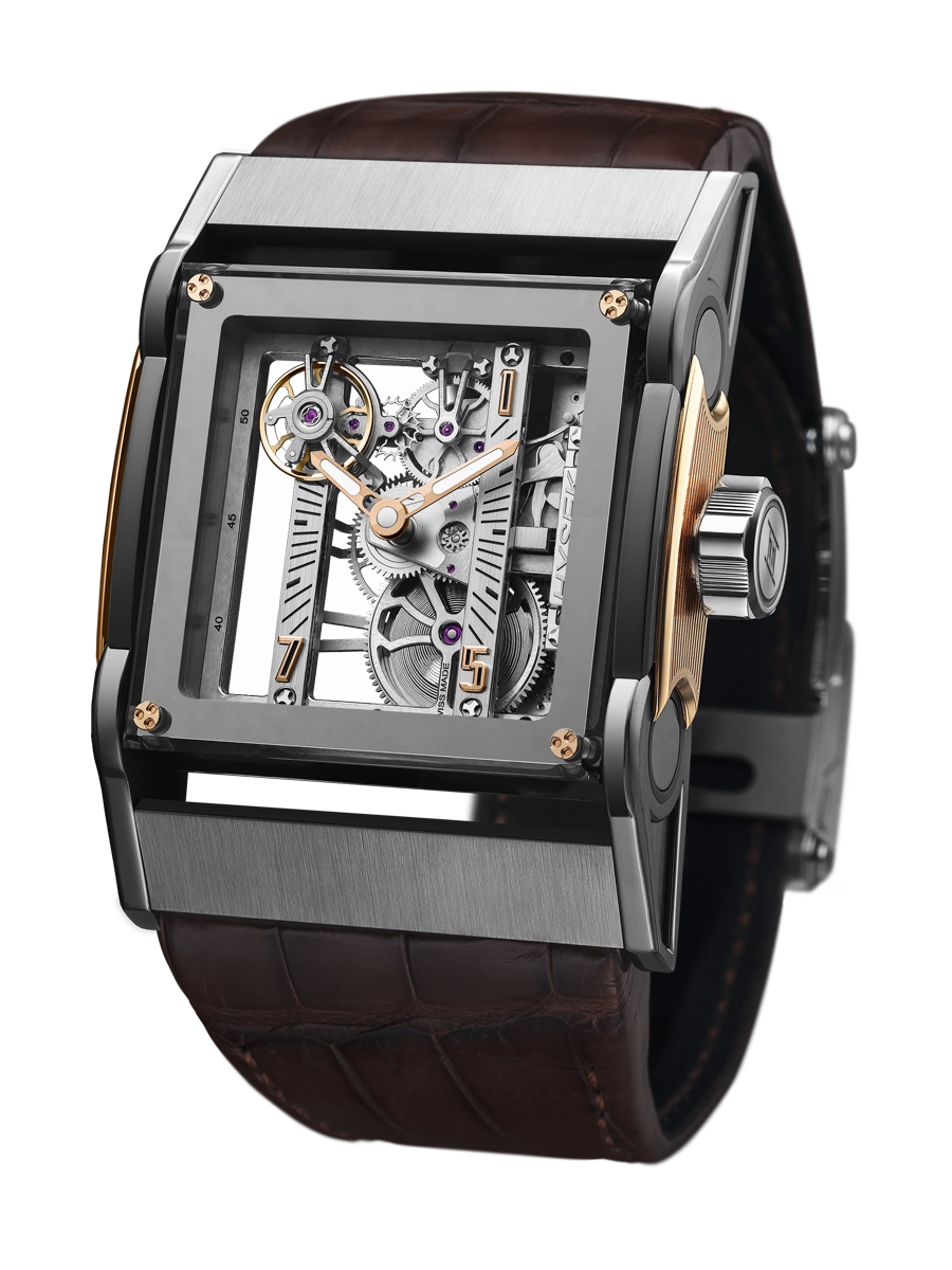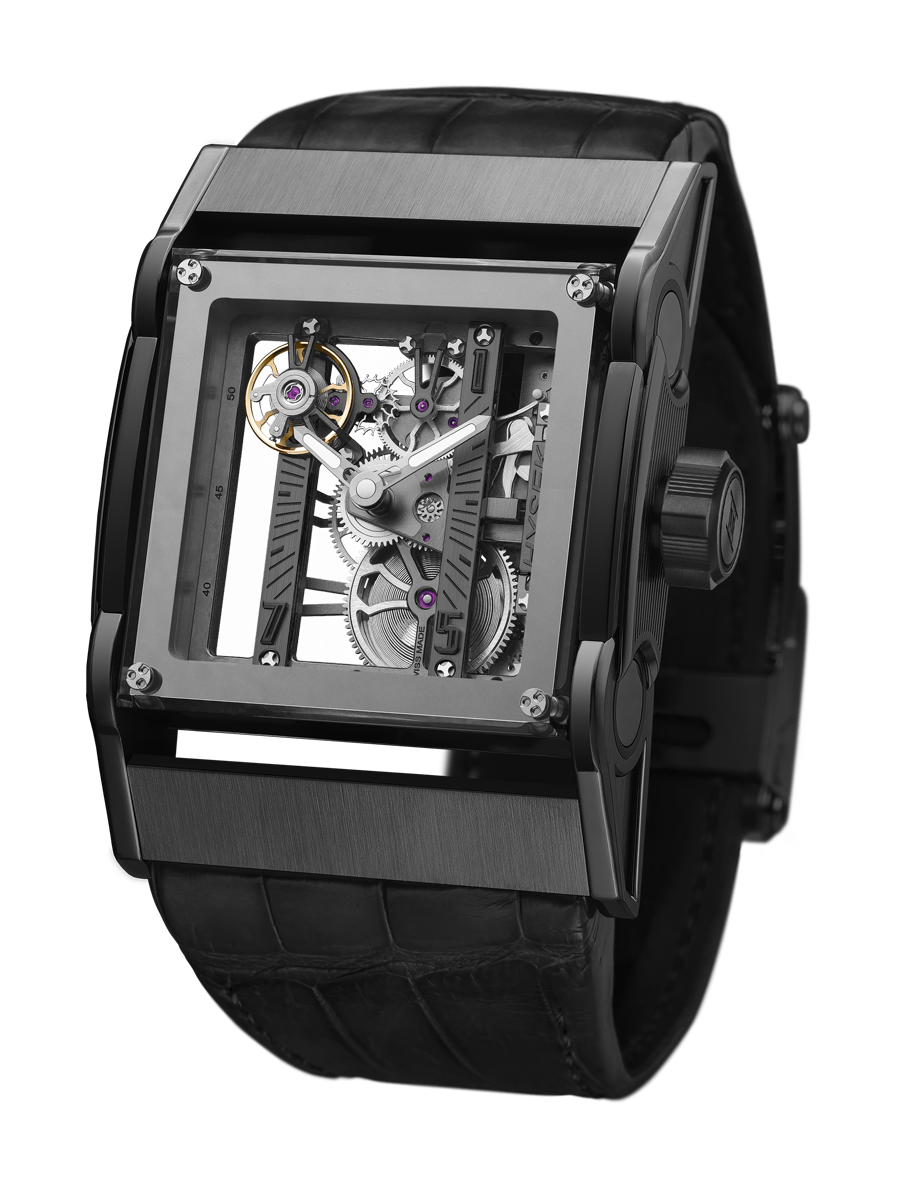 The most distinctive feature is visible on the movement’s square chassis, running all around the case: a ‘charcoaled’ finish. The charbonnage technique in question is hardly ever used in watchmaking, but Hysek has chosen to give it pride of place here. It involves applying a stick of a specific type of charcoal, by hand, leaving a unique pattern and forming an extremely soft, gentle abrasion that brings out all the highlights of the surface.