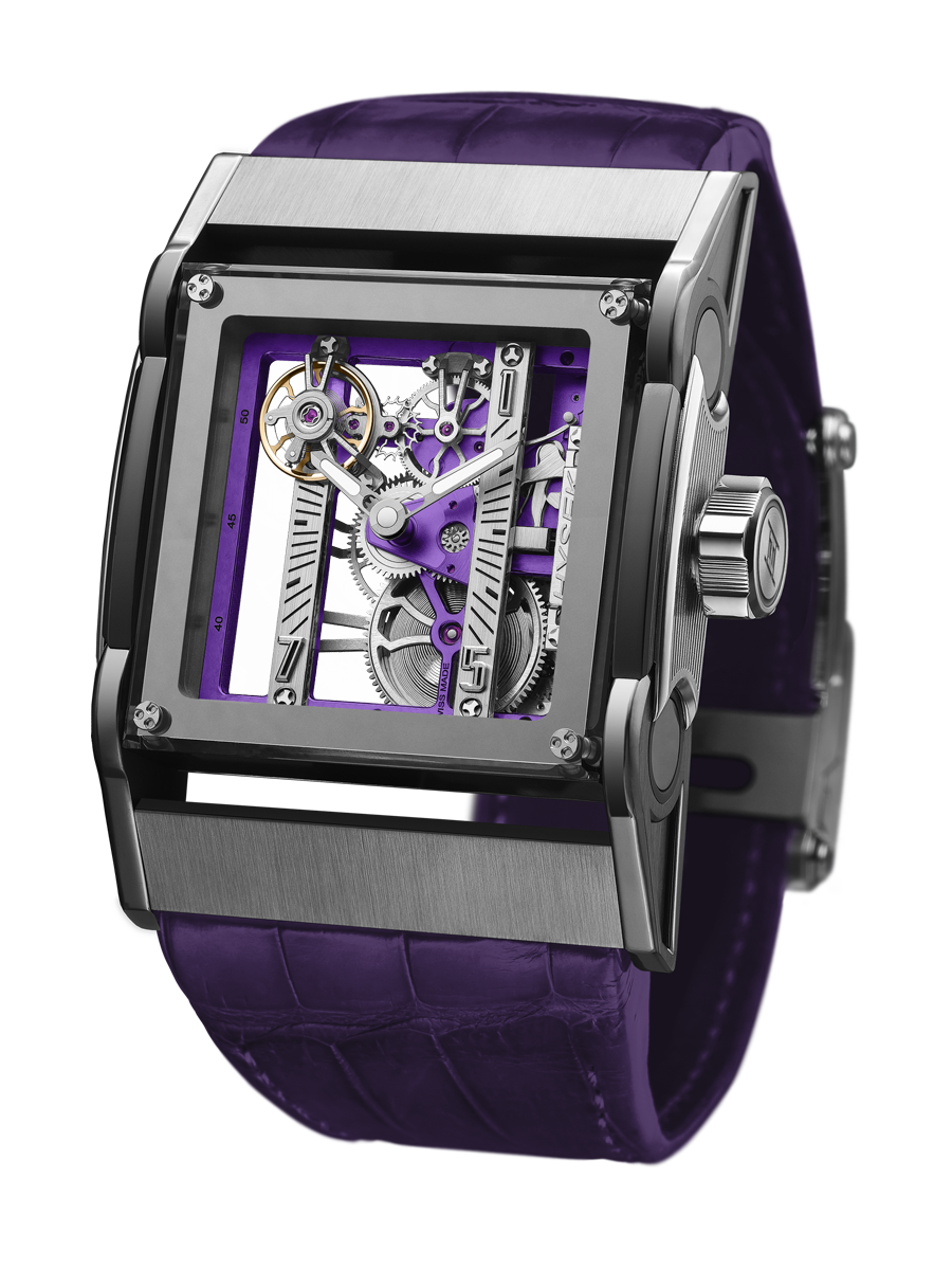 Four different options are available for the painstakingly lengthy and detailed movement finish: anthracite, rhodium-plated, blue, or violet, together with a choice of titanium and gold, titanium and PVD, or titanium cases. Gold, titanium, or titanium/PVD plates will be inserted in the frames.