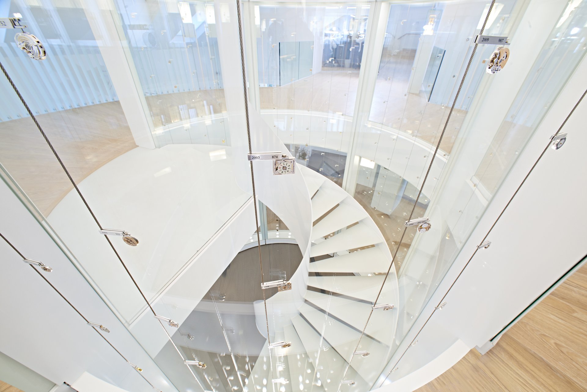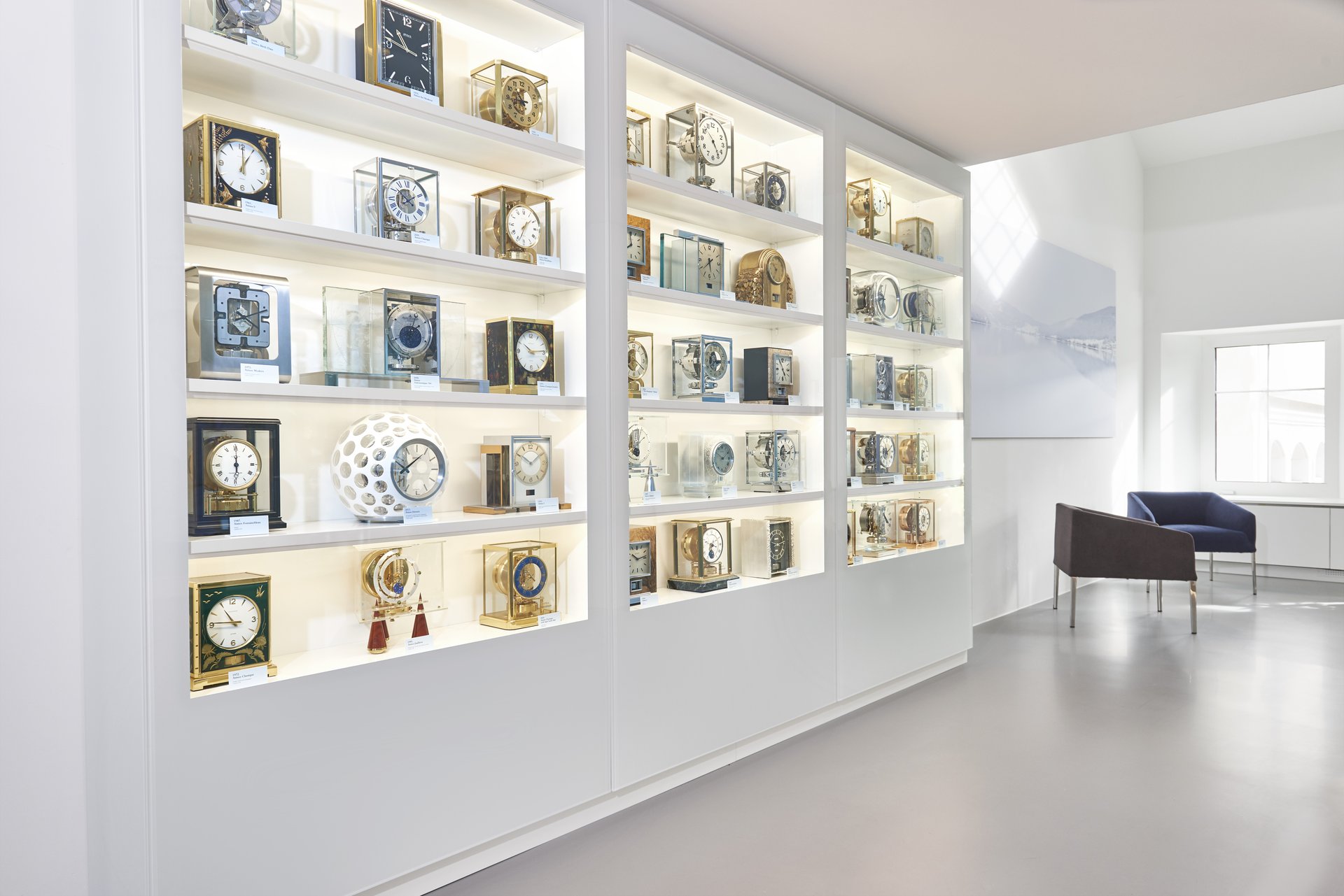 Atmos, Reverso, Memovox, Polaris… Their name makes enthusiasts dream… In the centre of the Heritage Gallery, a monumental glasswall captures your attention. Around a staircase that is as white as snow, this transparent wall exhibits 340 of the 1’ 262 mechanical movements designed, created and assembled by the Jaeger-LeCoultre Manufacture. The smallest movement in the world is nestled among them, the calibre 101 weighing barely one gramme which was developed in 1929.