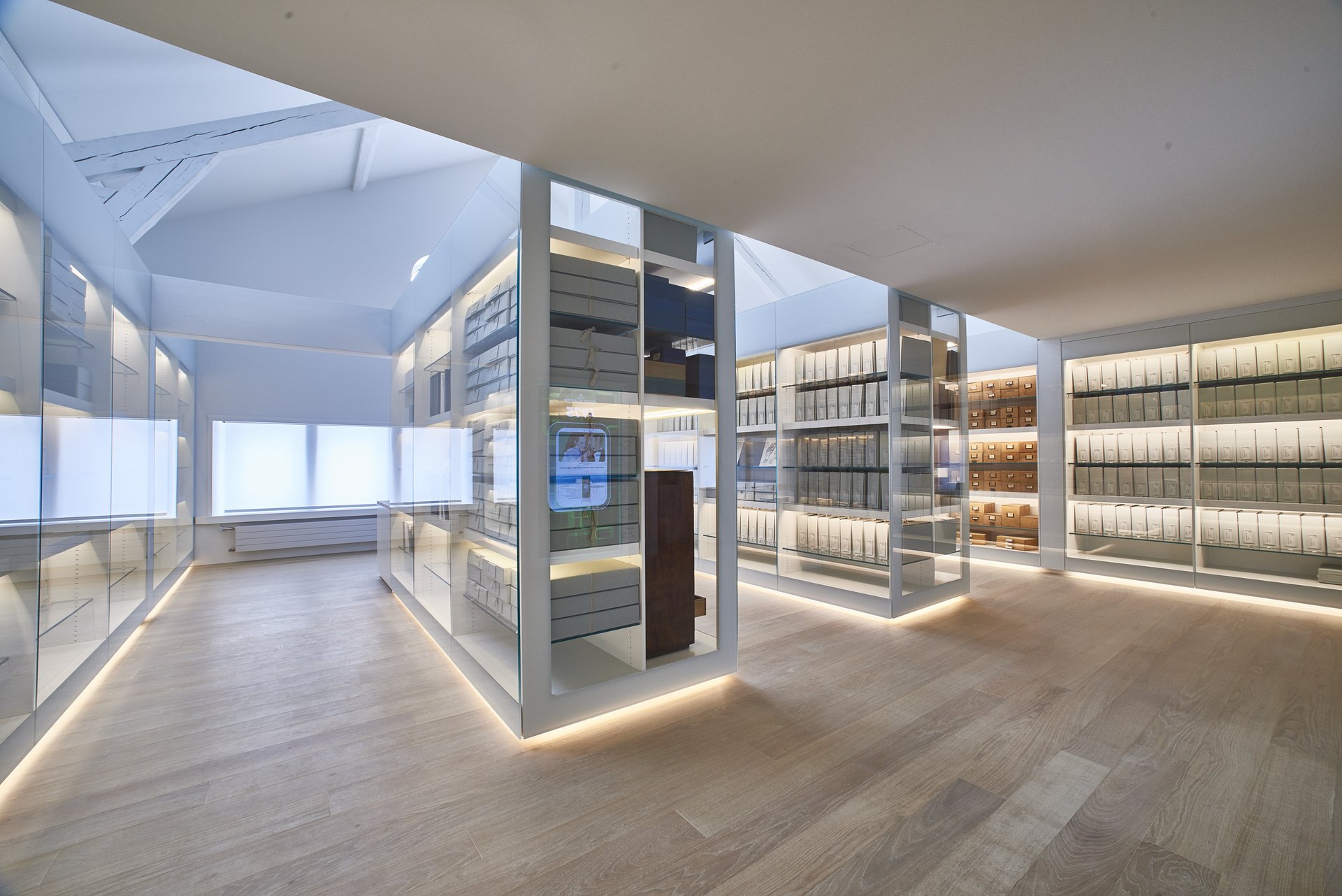 On two levels, immense display windows are set in a vast space full of light with a pure décor. One part encloses the Maison’s archives, varying from the written record of technical plans, patents, drawings, old books, client registries, advertisements and catalogues which mark out the history of Jaeger-LeCoultre to meaningful chronological benchmarks. Besides their historical interest, these archives constitute a constant source of inspiration. As if to provide a window on the past, a workbench like the one used by Antoine LeCoultre is also exhibited. With its weathered wood and original tools which we like to imagine could have been used a few hours before, this old furniture generates a profound emotion.