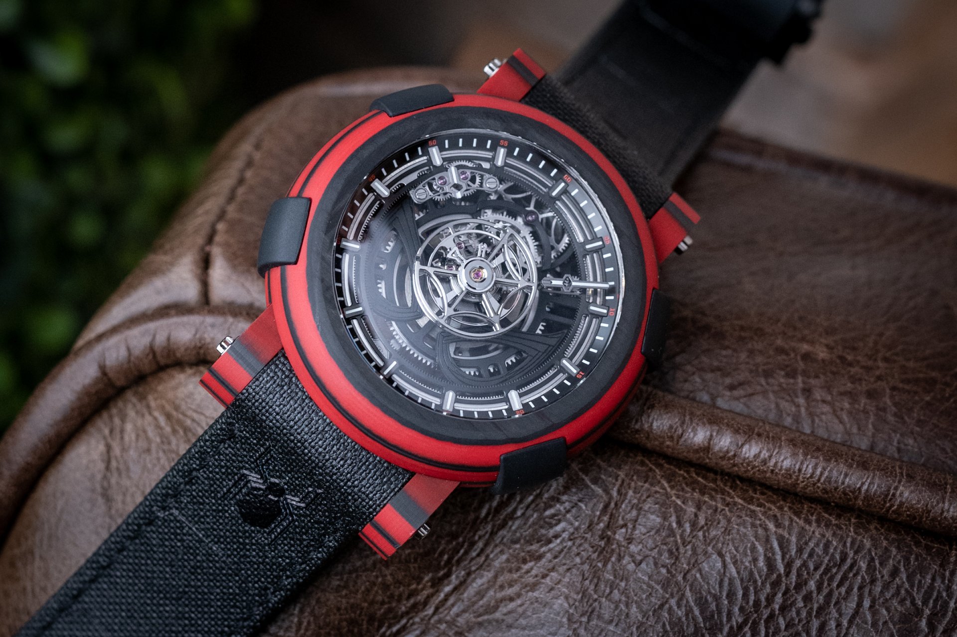 Made in a 45 mm case punctuated by RJ BUMPERS™ in rubber, the ARRAW Spider-Man tourbillon is available in two versions, the first in black carbon and red fibreglass composite, and the second made entirely of black carbon. Each version is limited only to 10 pieces.