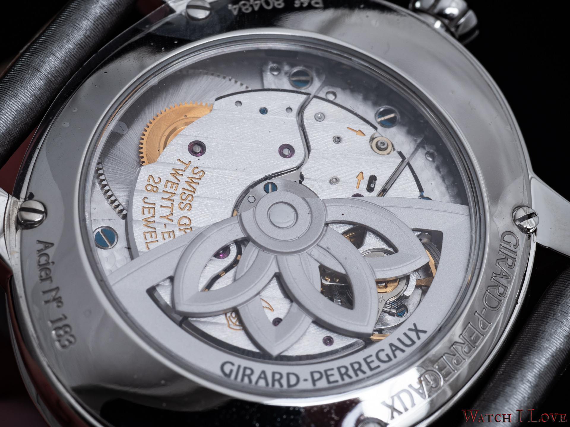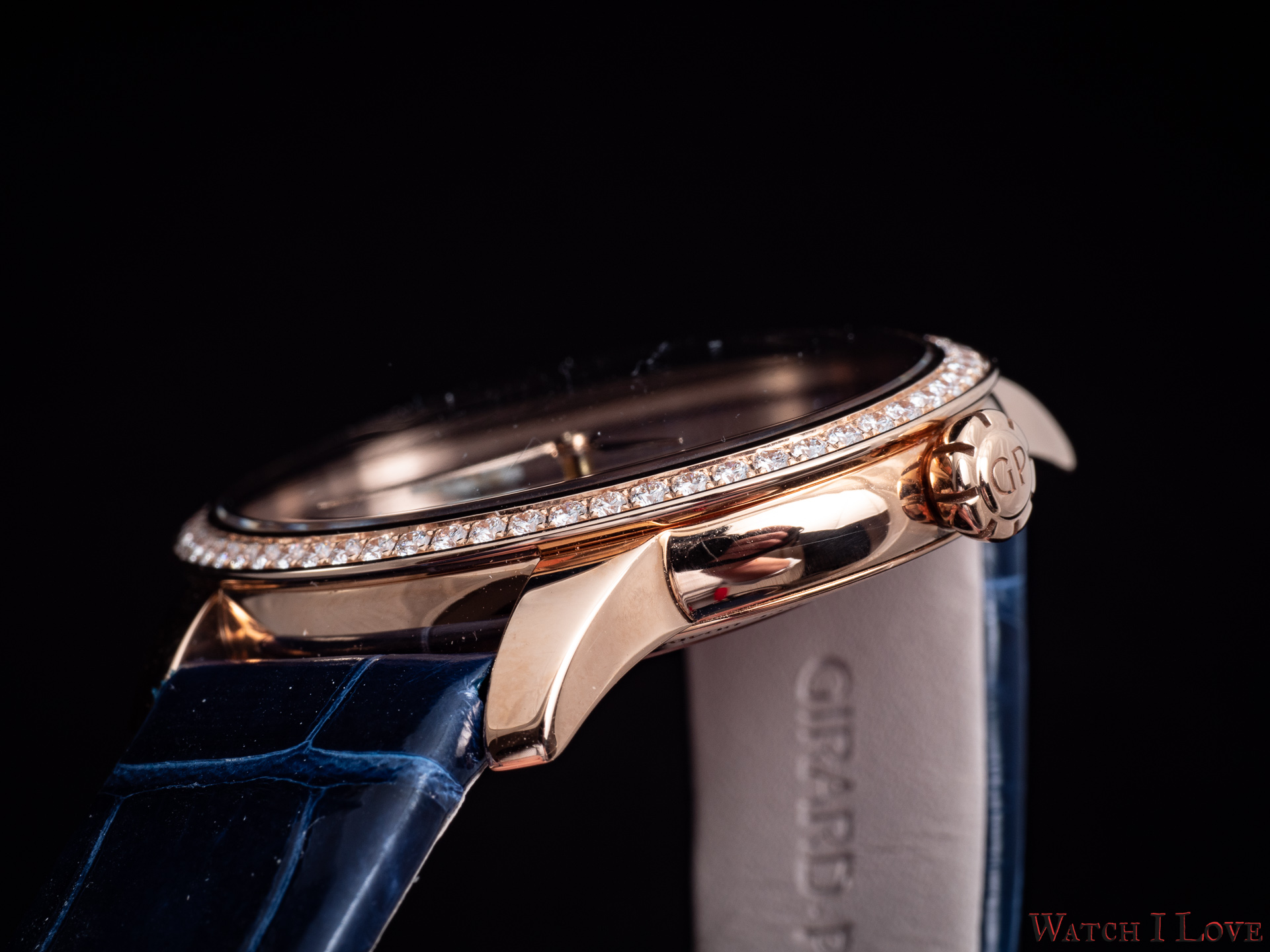 The Girard-Perregaux ellipse case measure 35,40 x 30.40 mm – a balanced size between the rather small ladies watches and the need of space of the calibre GP03300. The materials of choice are stainless steel and pink gold.