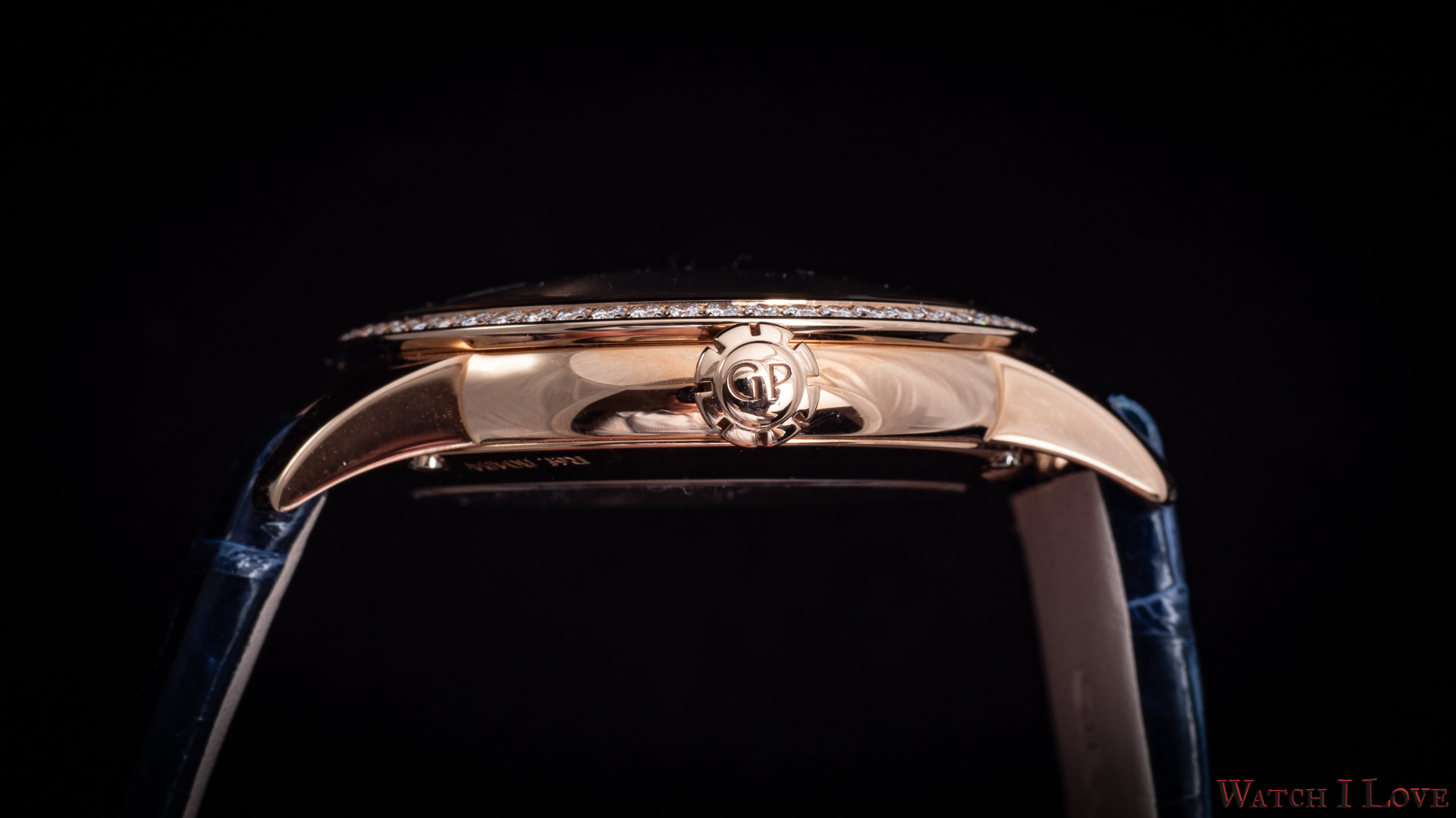The crown follows the floral symbolism of the watch. Manufactured in the same material as the case (steel, respectively pink gold), the crown is engraved with the GP logo.