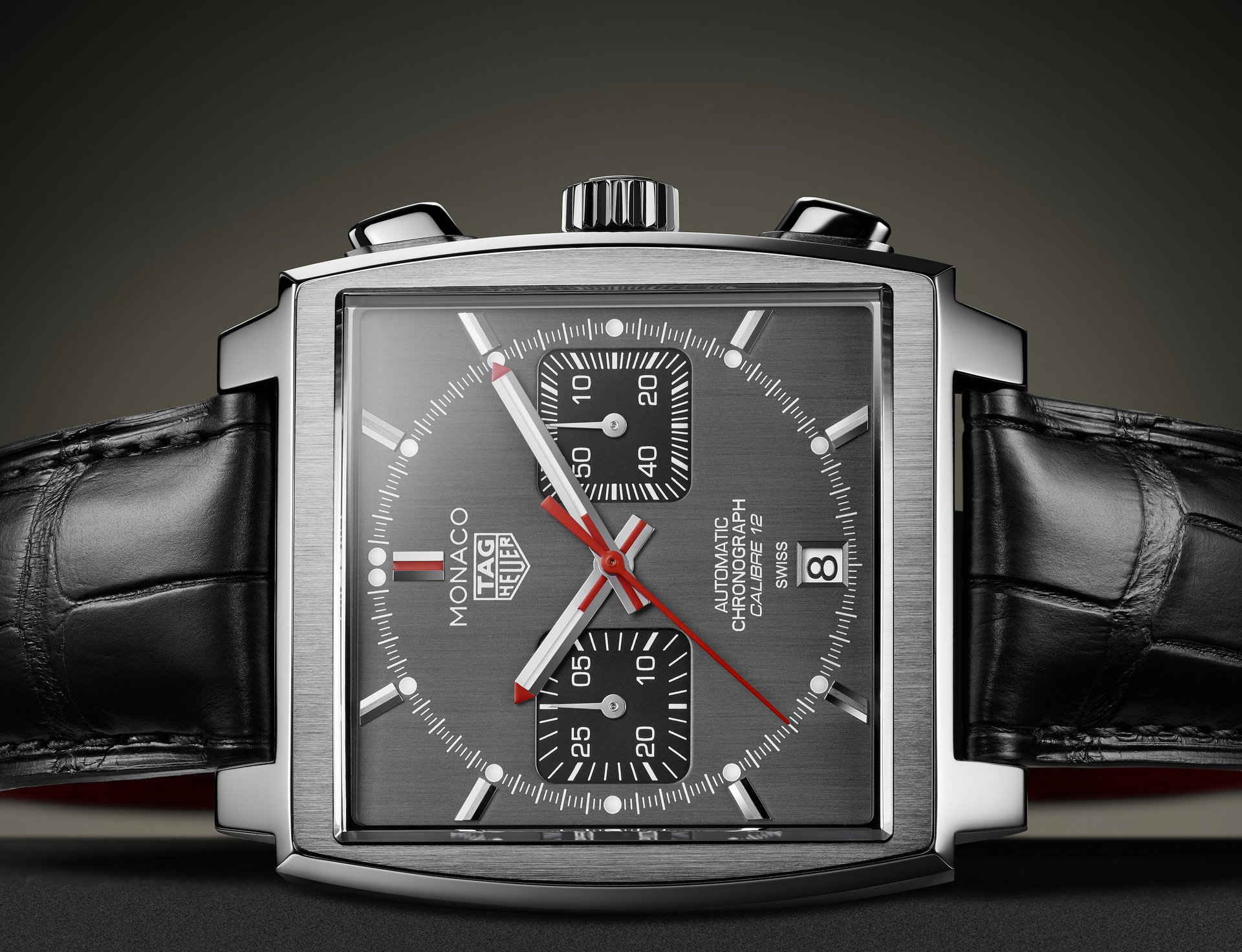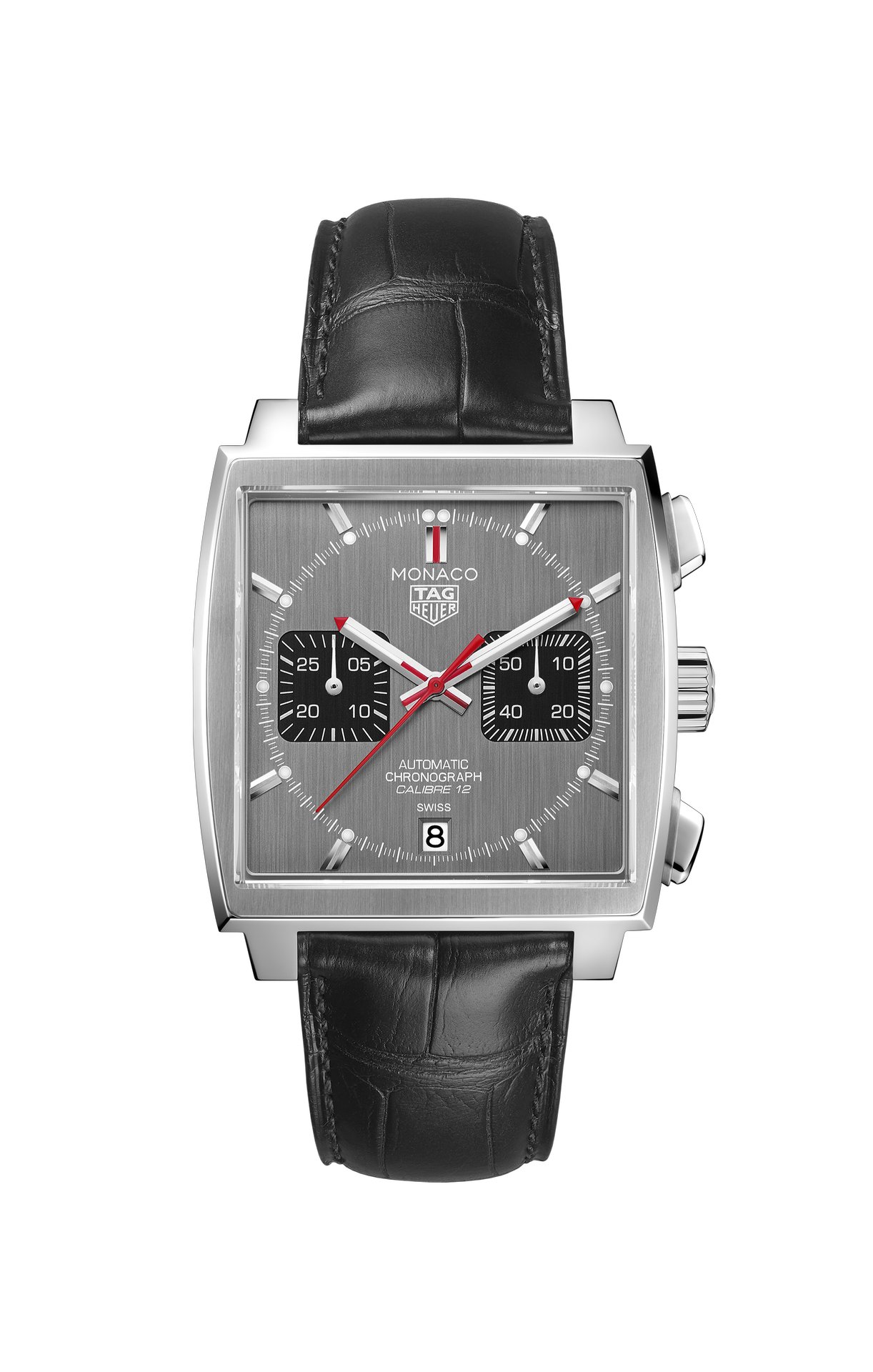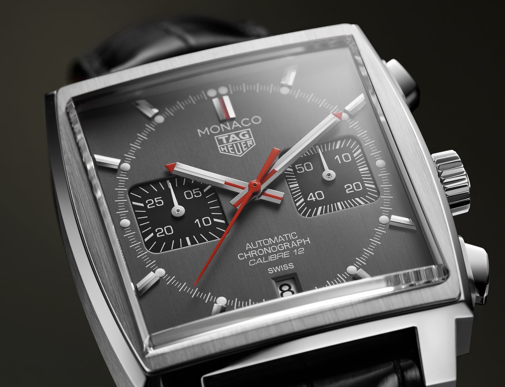 In contrast to the movement that initially equipped the Monaco – Calibre 11 – the Calibre 12 gave the renowned timepiece a sleek, traditional appearance, because it required the crown to be on the right side of the case, as opposed to the left side as with Calibre 11. TAG Heuer introduces the last Calibre 12 Monaco model with a stunning grey dial. Outfitted with a classic black alligator leather strap, this stainless-steel model features a vertically brushed ruthenium dial. Ruthenium, RU44 on the periodic table, is part of the platinum group and has a dynamic iridescent colour that changes in different shades of light. The smooth black opaline counters at 3 and 9 o’clock offer a refined contrast to the brushed dial. The central seconds hand, 12 o’clock index, and the tips of the hour and minute hands feature a hint of bold red, an eye-catching feature that enhances the timeless yet modern style of this horological icon. As the final edition of the Monaco Calibre 12, only 1,000 of these models exist and the stainless-steel caseback of each watch is engraved with its limited-edition number.
