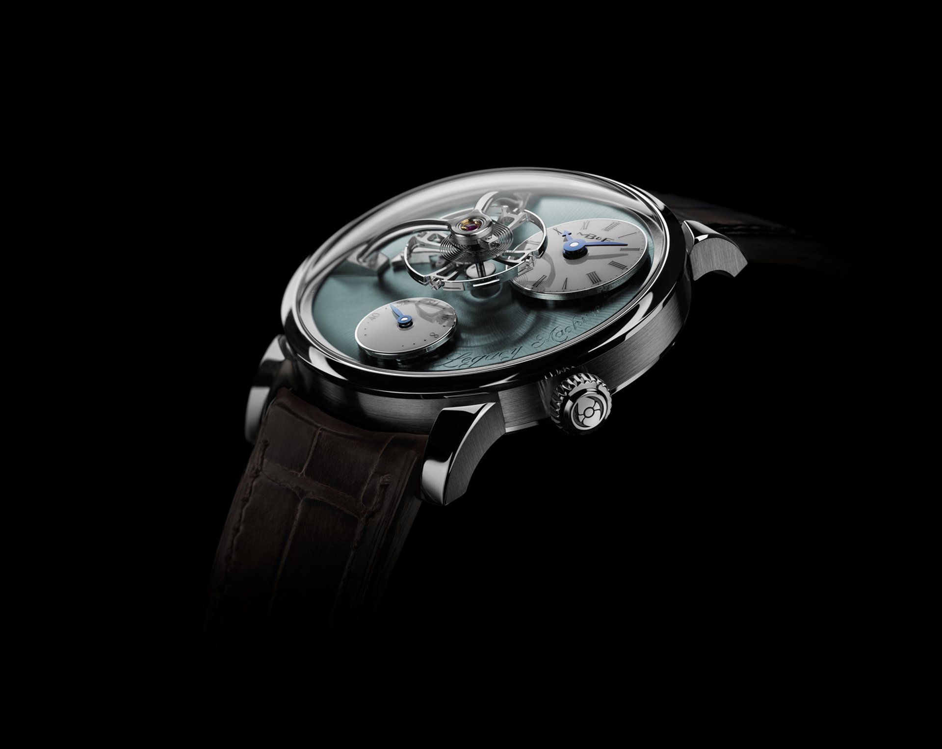 Visually, LM101 is dominated by the monumental suspended balance wheel, its sedate oscillations drawing the eye ever closer. Two pristine-white subdials hover just above the fine sunray-engraved movement top plate: At the top right, highly legible hours and minutes are displayed by beautiful blued-gold hands contrasting against the immaculate white, while the 45-hour power reserve indicator is displayed in a smaller, but similar subdial below. Two ‘Frost’ limited editions add even more contrast between these elements and the effervescent backdrop of the hand-finished frosted dial plate.