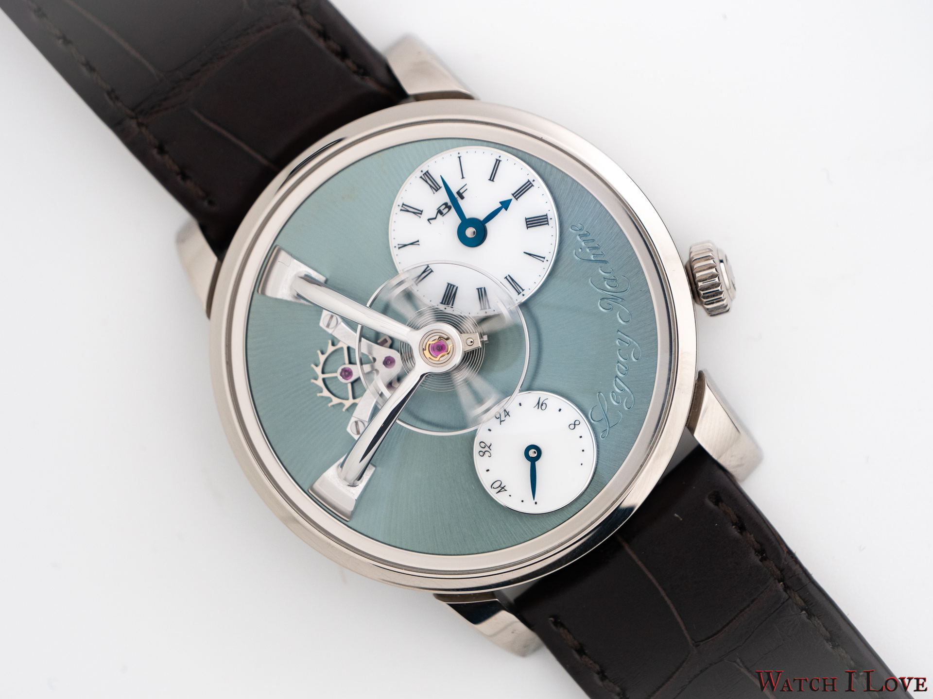 The ones accustomed with the previous versions of MB&F LM101, the new dial will appear familiar. Again, the dial is centrally dominated by the ‘flying’ balance wheel. This time, the arresting mechanical detail floats over calm waters. The “vert d’eau” dial has that undefined green, grey, blue shade. The colour simply immerses you in a calm state, emphasising the balance wheel and the raised sub-dials.