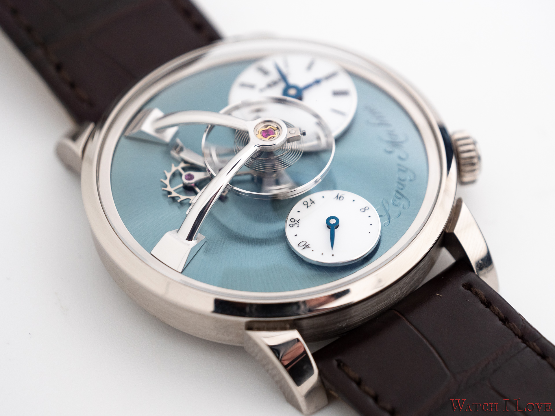 Dial and Indications: While the animated suspended balance visually dominates LM101, the immaculate white dials for the time (hours and minutes) and power reserve indications are both aesthetically appealing and highly legible thanks to the high contrasting blue hands.