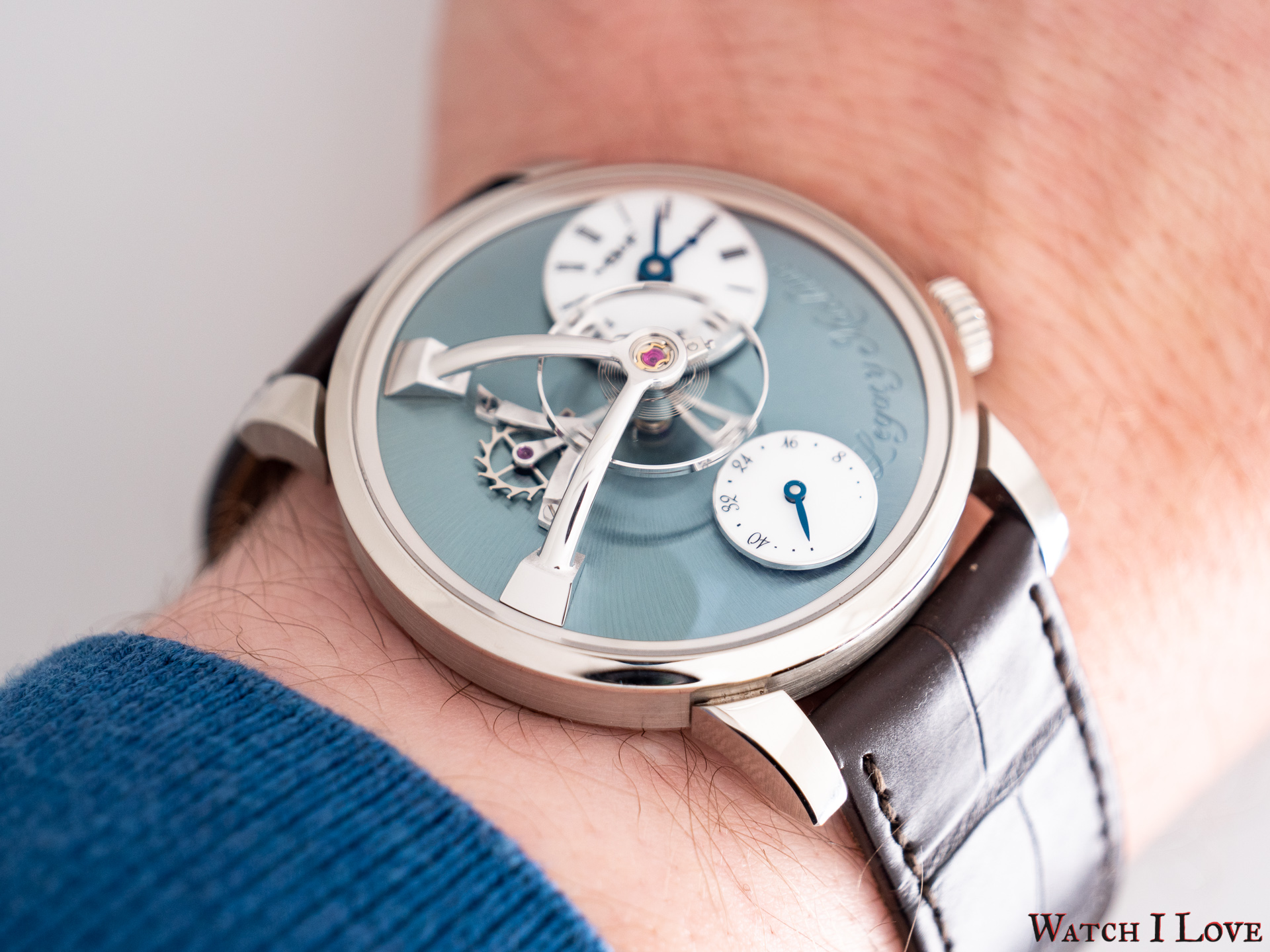 I find the palladium case to be an exceptional choice for the “vert d’eau” dial. The exotic case shine is balanced by the exotic dial colour. The entire watch is an ultra-modern eye arresting concept, keeping though an idea of classicism through the traditional finishing.