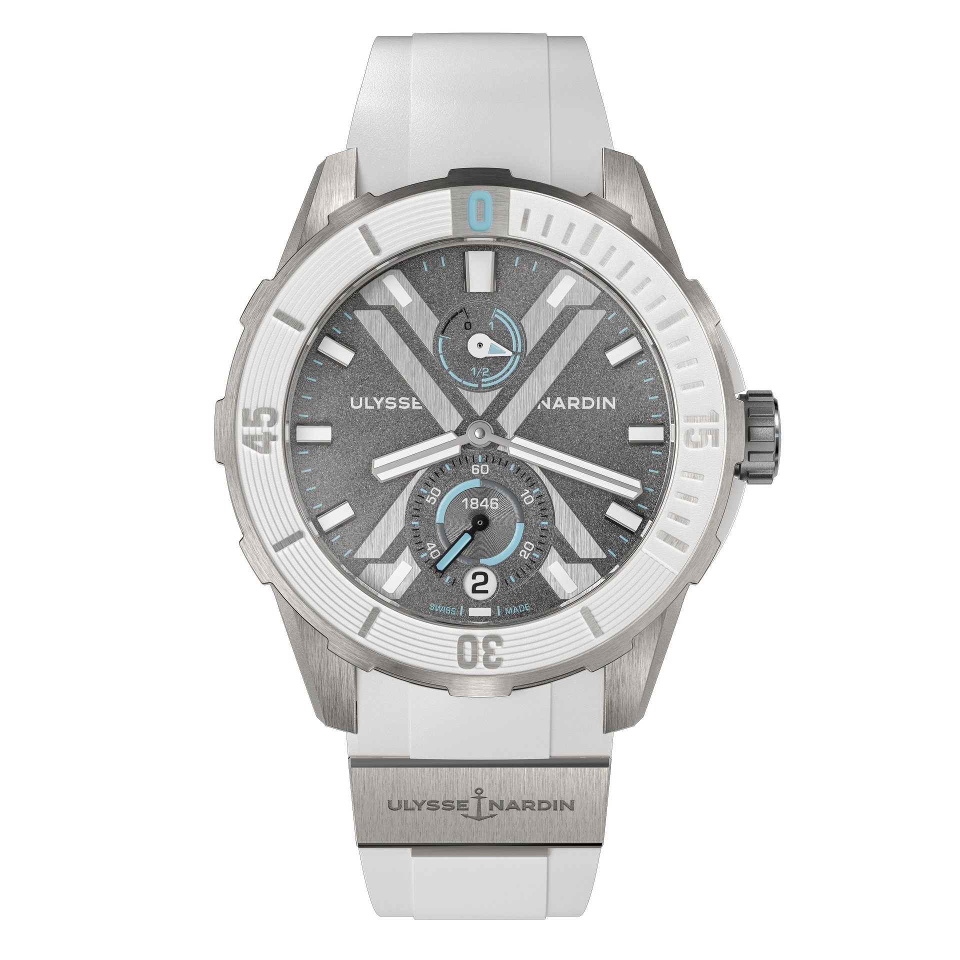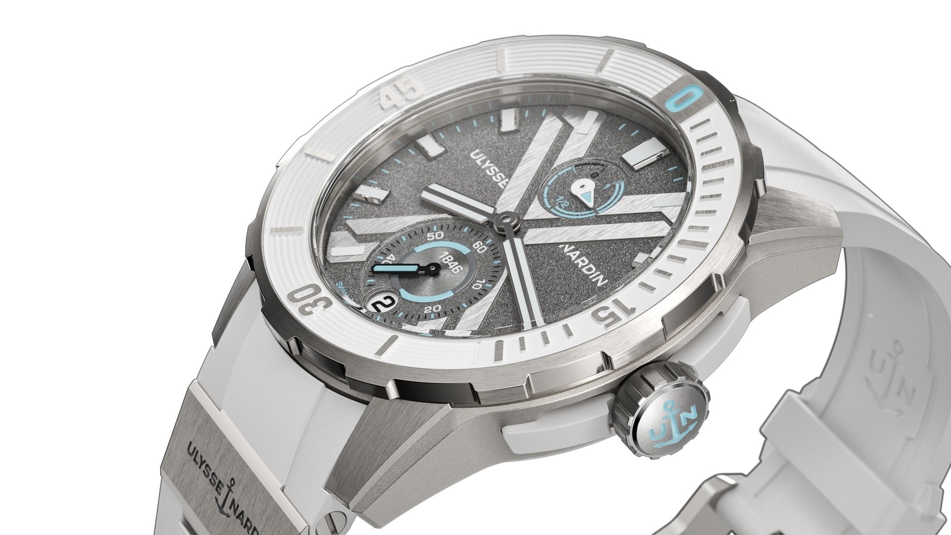 A matte white rubber strap recalls the clean and austere lines of the Earth’s Southernmost Continent with ice blue touches on the dial reflecting the icebergs floating in the sea there. The Ulysse Nardin brand element is prominent under the sand-blasted dial. The bezel – in a white rubber – matches the watch strap. Its UN-118 movement guarantees accuracy in any hemisphere at any time of the day or night. The gray face is marked with a bold and elegant “X”. The crown, horns and case back are all made from titanium.