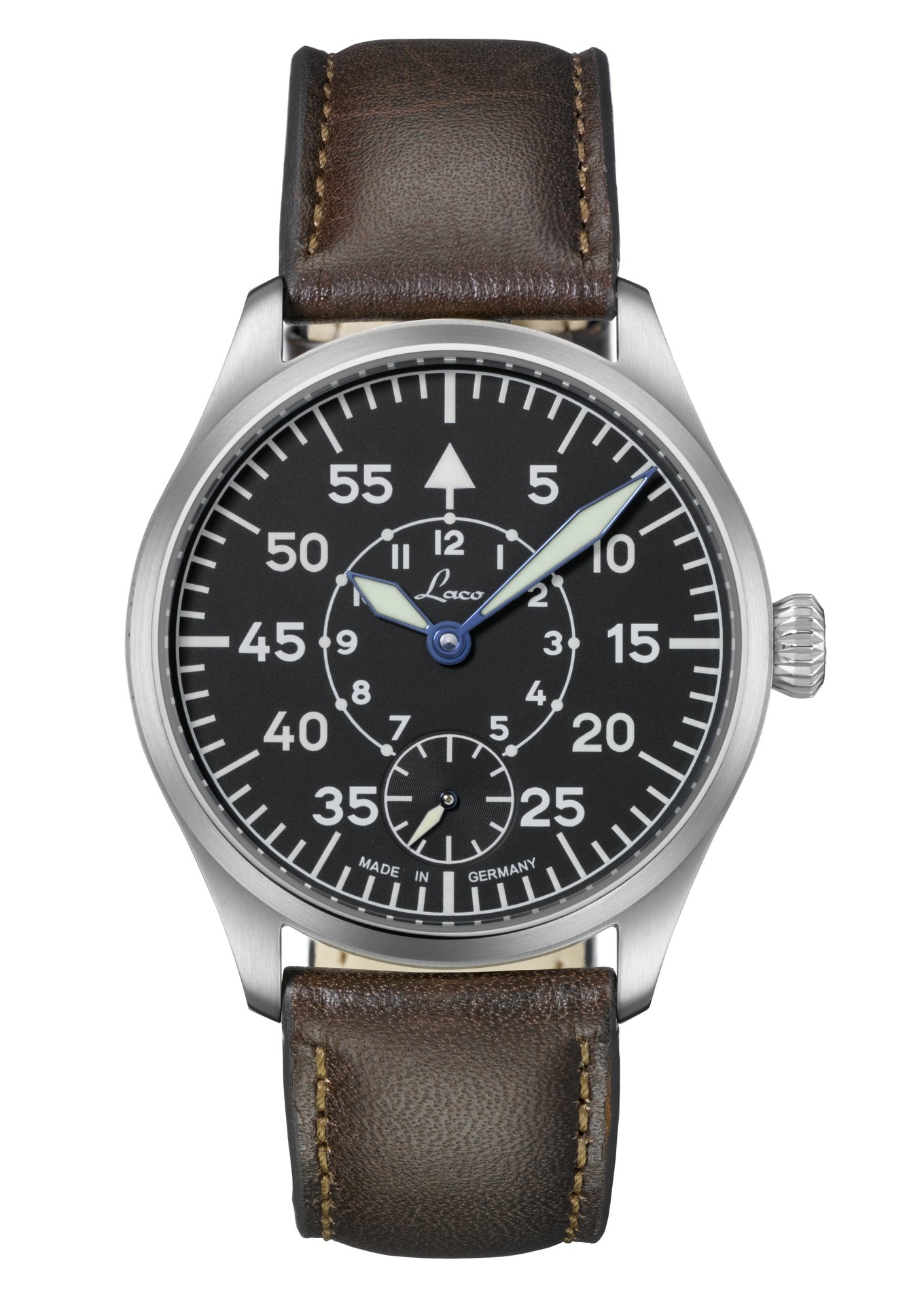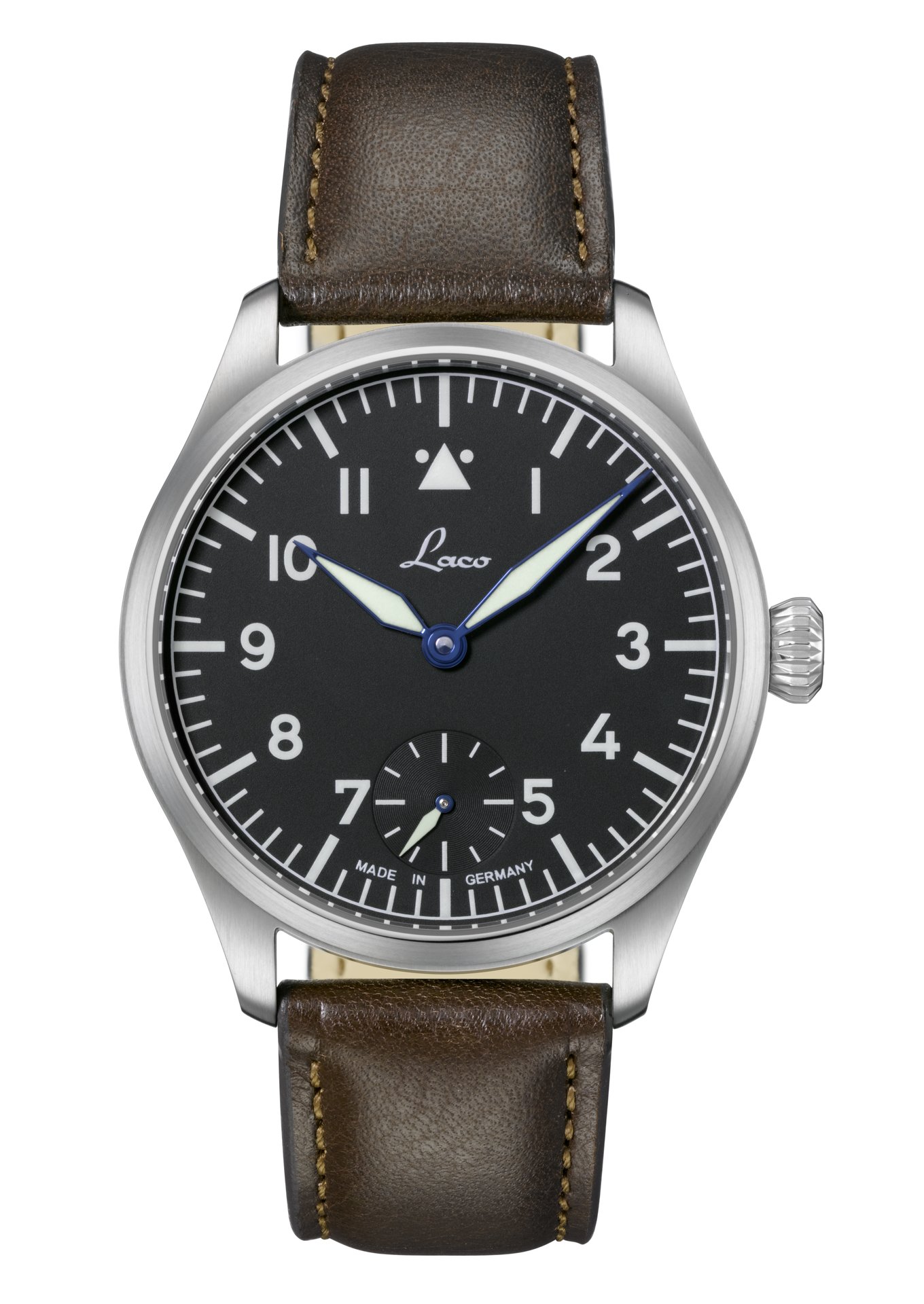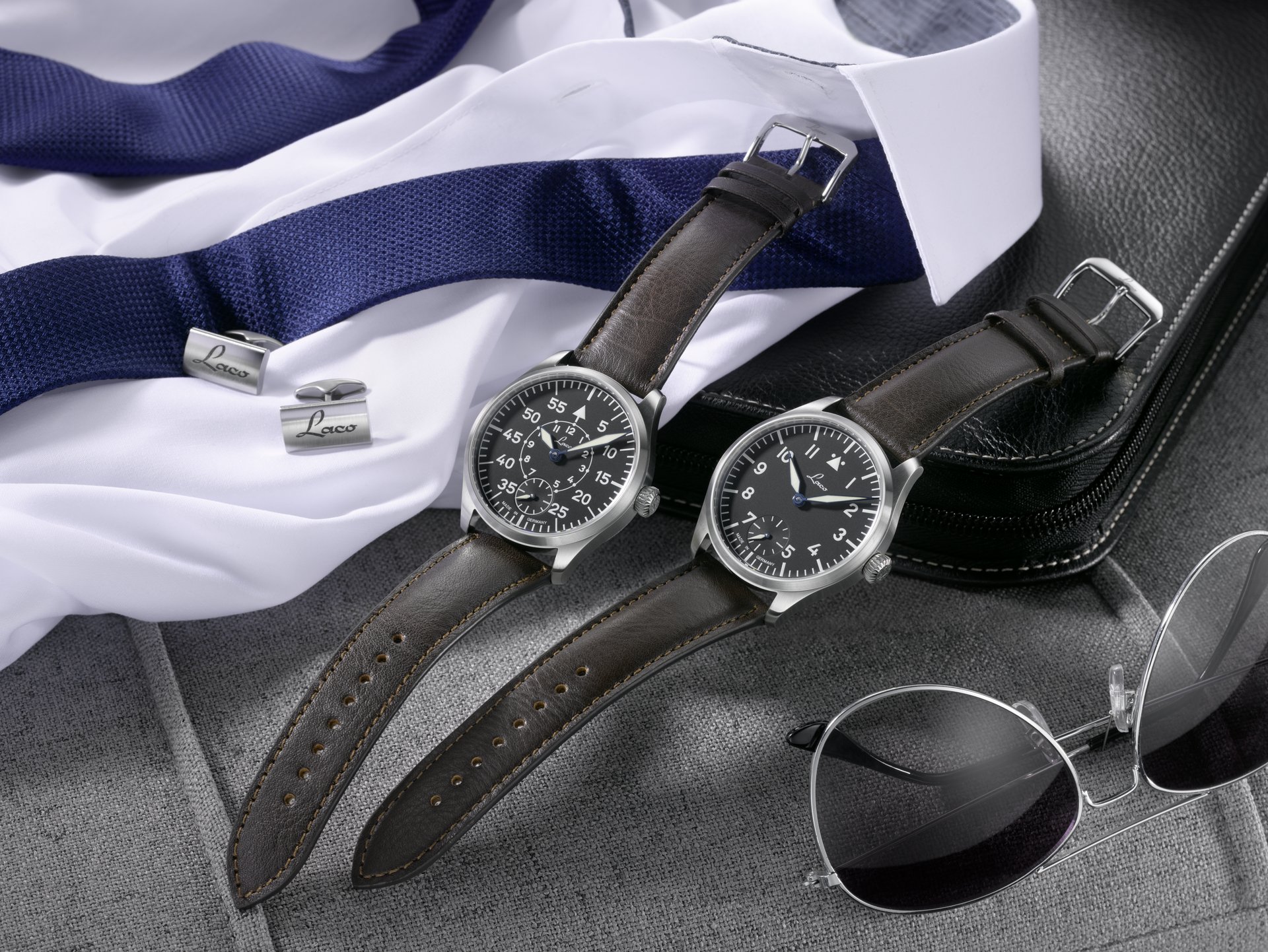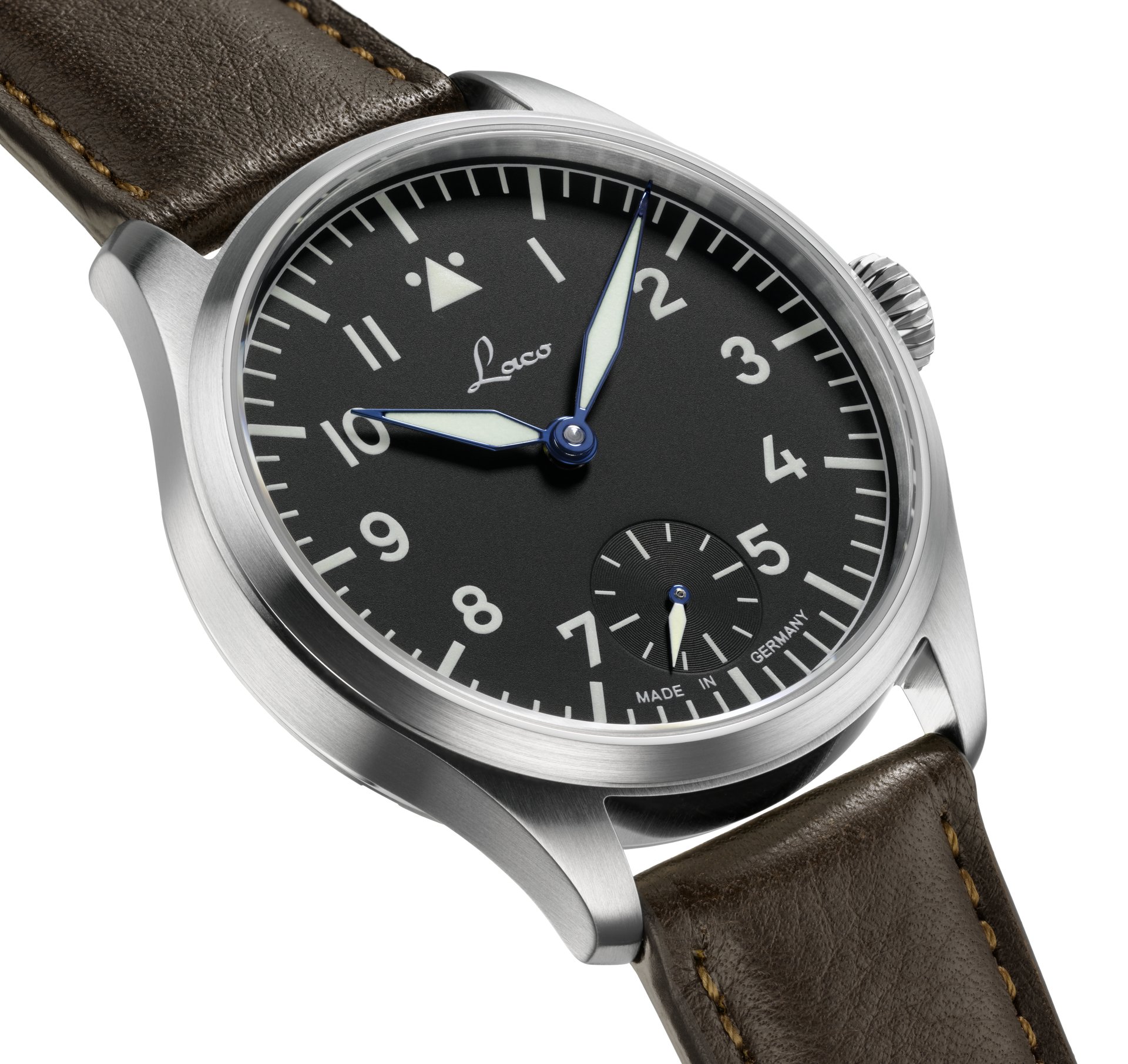 Vintage charisma, yet totally up to date: the two new Laco pilot watches combine elegant retro designs with a touch of class. The 11-millimetre high case of the Laco Ulm and Laco Würzburg watches fits snugly onto the wearer’s wrist, easily going under shirtsleeves too. The slim profile and balanced proportions of both timepieces makes them highly versatile – as stylish accessories for a variety of occasions, in business or leisure settings. Both models house a precision hand-wound Laco 98 movement and have a small second hand at the six o’clock position.