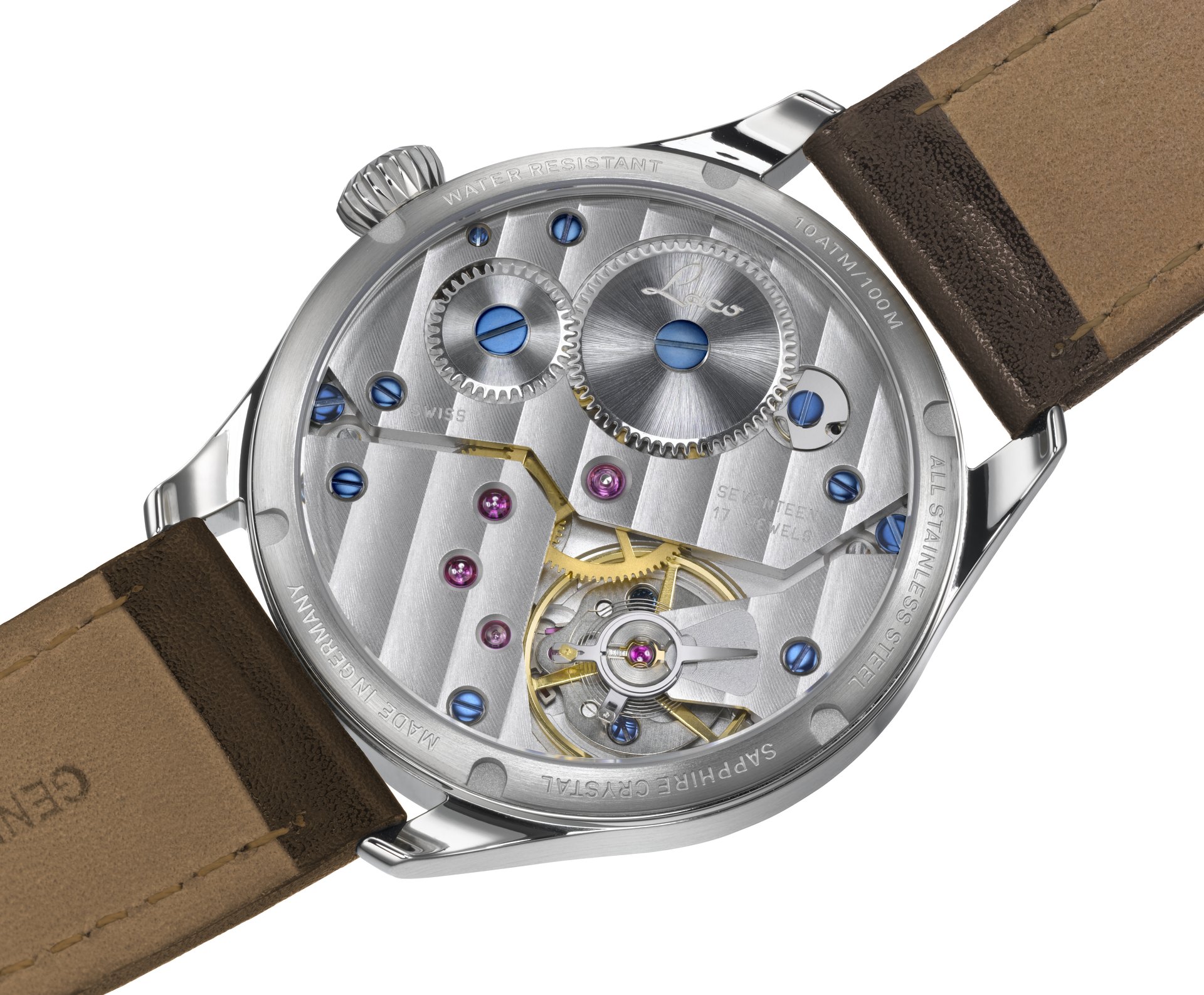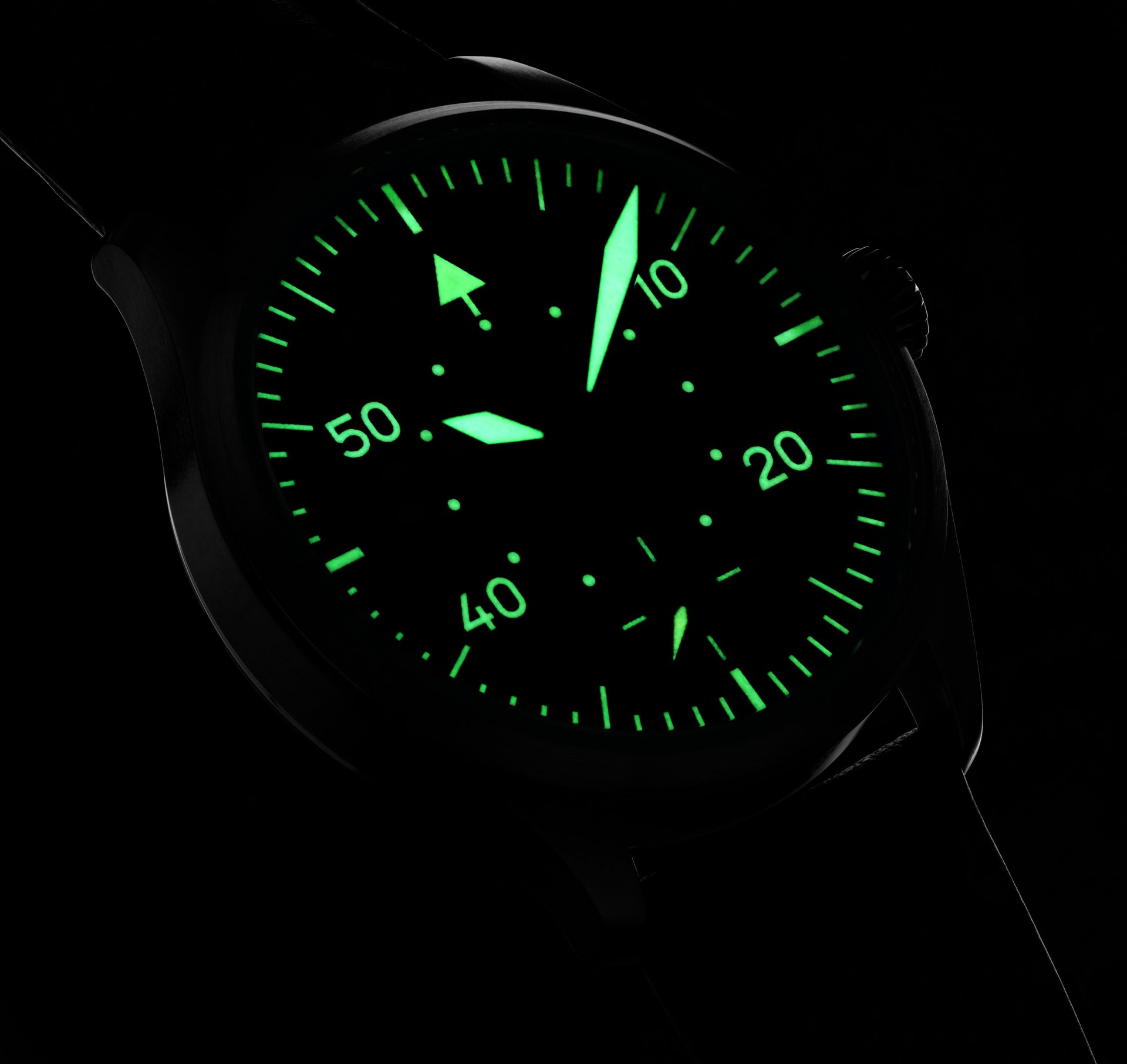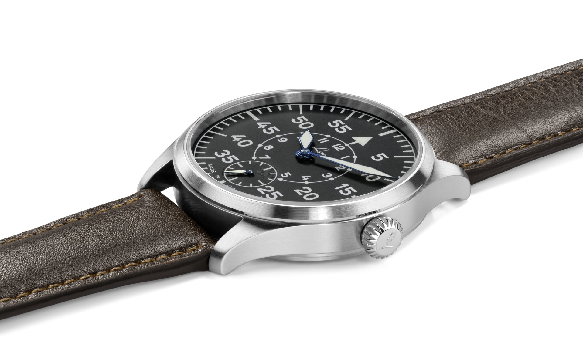 The brand is ready for take-off, adding two new mechanical pilot watches to its range. Both models have an inky black dial in a traditional instrument design, with thermally blued hands coated in luminous material, affording optimal legibility in all lighting conditions. The “Ulm” model is based on the A design with arabic numerals and pilot watch triangle at twelve o’clock, and the “Würzburg” model follows design B. The minute scale is arranged outside the inner circle displaying hours. The small second hand at six o’clock emphasises the vintage appearance of both models. Bright white numerals are in striking contrast to the dark background. Anti-reflective sapphire glass prevents annoying reflections.