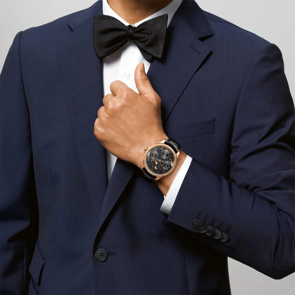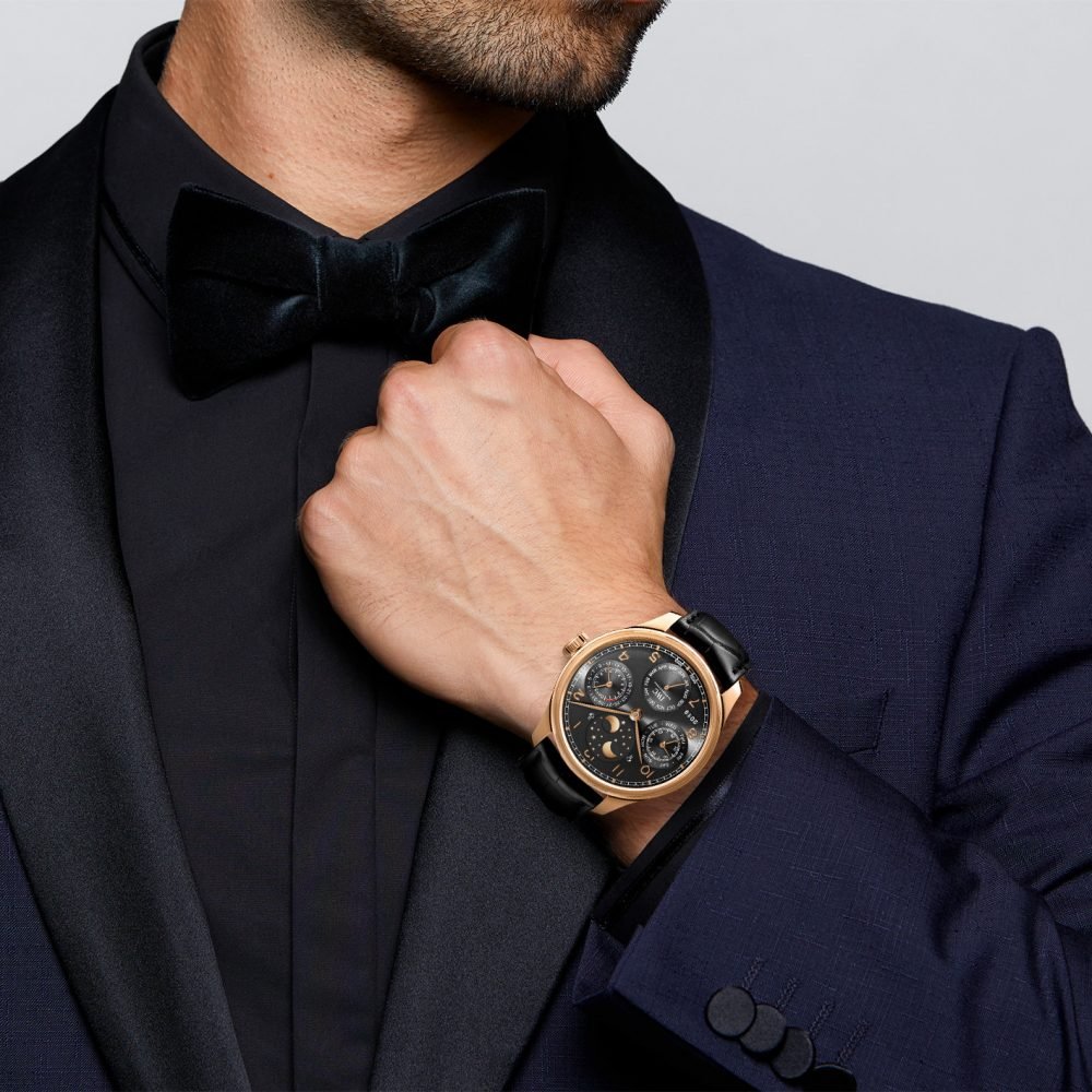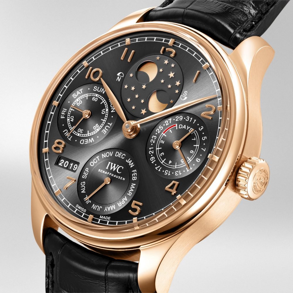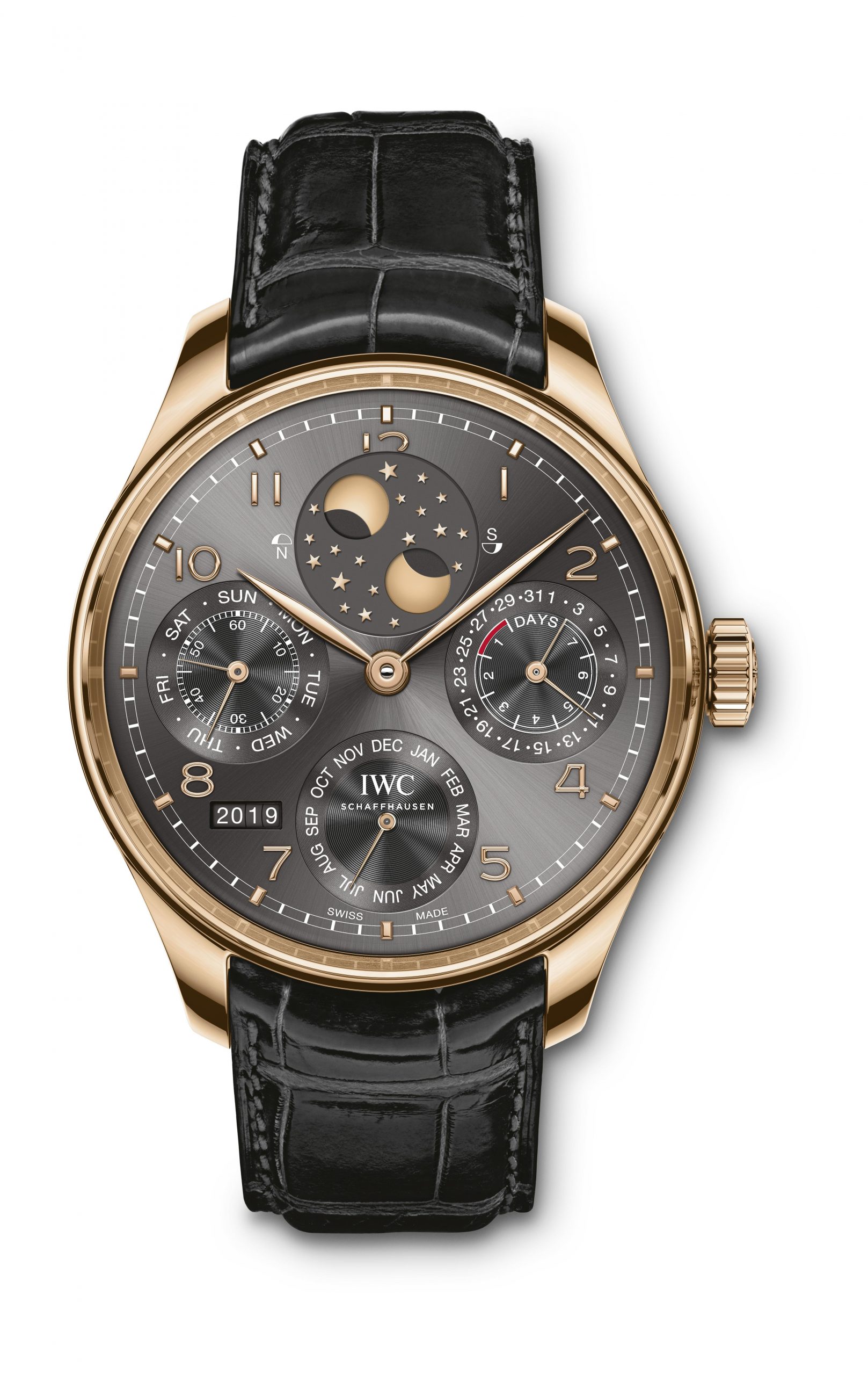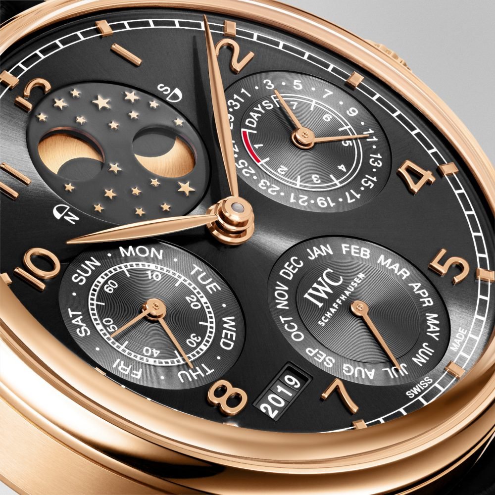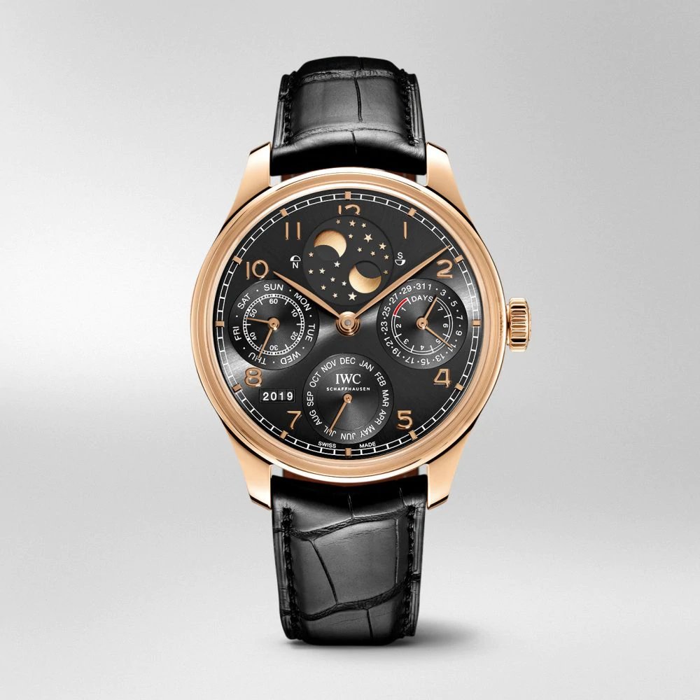 The moon phase display on the Portuguese Perpetual Calendar diverges by just 1 day in 577.5 years from the actual phase of the moon. In the model with the double moon display, the moon phase and its mirror image show the state of the moon in both the northern and southern hemispheres. The double moon model comes with the railway-track-style chapter ring typical of the Portugieser, while the designers have transformed the entire moon phase display into a star-studded night sky, so that the moon and stars appear to hover in infinite space. The elegant timepiece leaves virtually no wish unfulfilled: perpetual calendar, window showing the year in four digits, 7-day automatic movement with Pellaton winding and a power reserve display. This timepiece is powered by an IWC-manufactured movement from the 52000-calibre family, featuring a solid 5N gold rotor and blued screws. The 18-carat 5N gold watch has a slate-coloured dial and arched-edge front glass and comes with a black alligator leather strap.