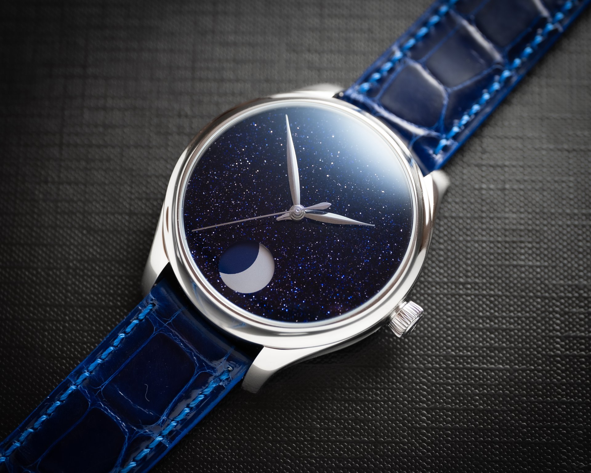 At 6 o’clock, a silvery moon waxes within a beautifully proportioned window. This satellite takes on a resolutely modern and understated appearance. In this ode to purity, H. Moser & Cie. has opted for a Concept dial, stripped of indices and logo, to allow the moon complete freedom of expression. And, because the brand never does things by halves, if you are giving someone the moon, why not the stars too! To enhance the beauty of the moon, H. Moser & Cie. has selected an aventurine dial, subtly twinkling with brilliant inclusions to spectacularly mirror the constellations of the night sky.