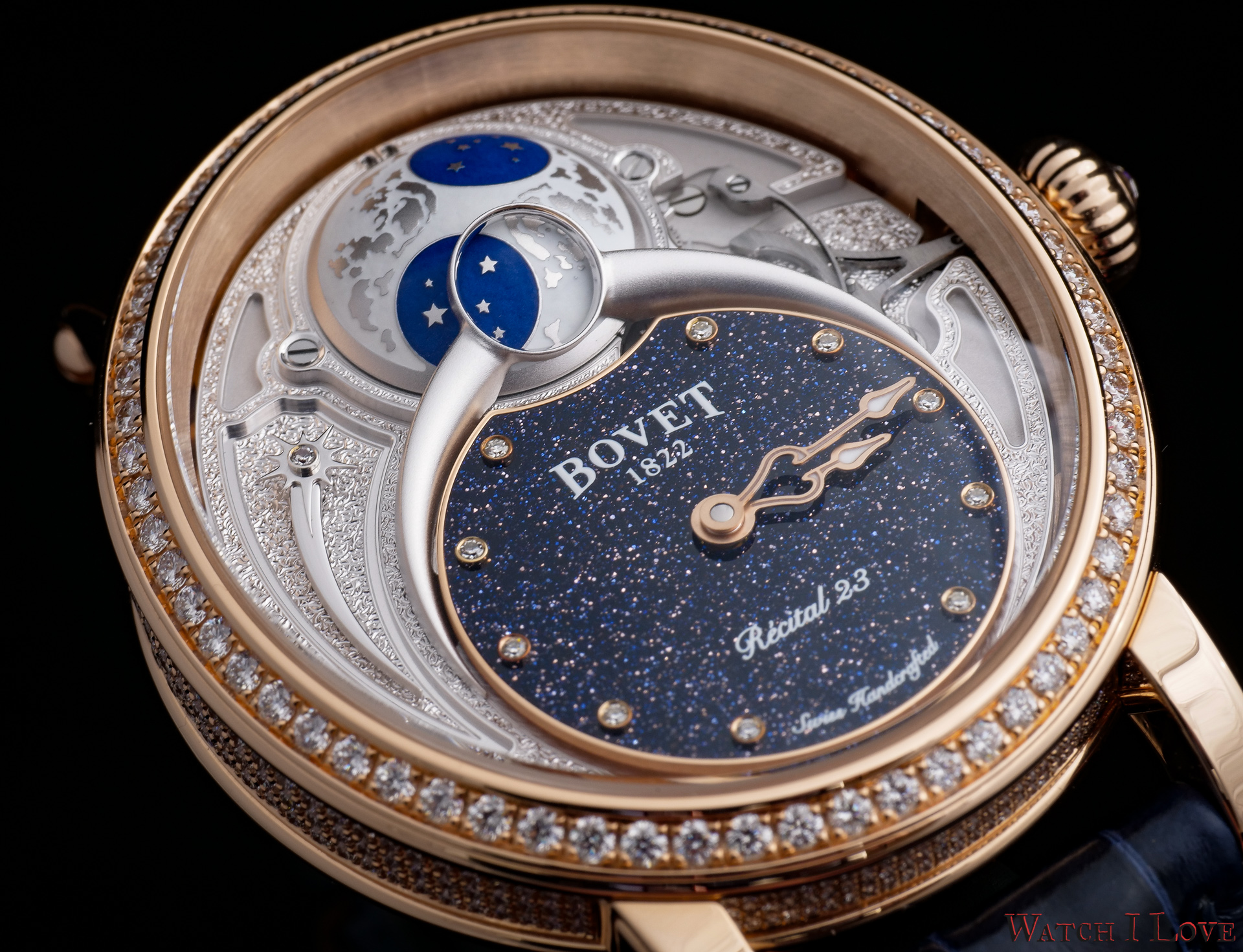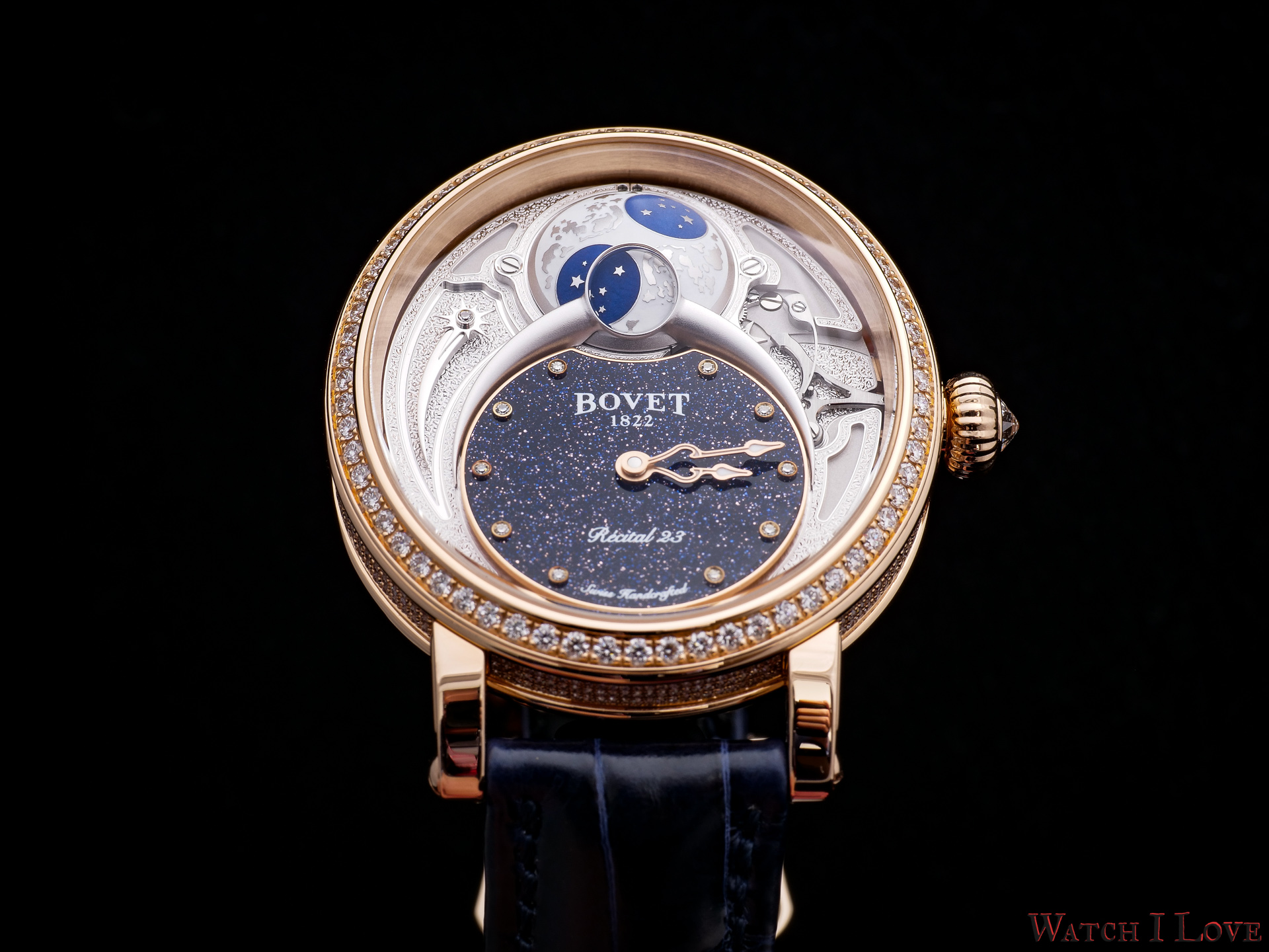 Bovet Récital 23 Moon phase is an example of femininity on the wrist. The watch is exquisite in look and finishes. Bovet 1822 made no rabat in quality. The Récital 23 is a splendid example of how a watch brand takes care of its feminine connaisseurs clientele.
