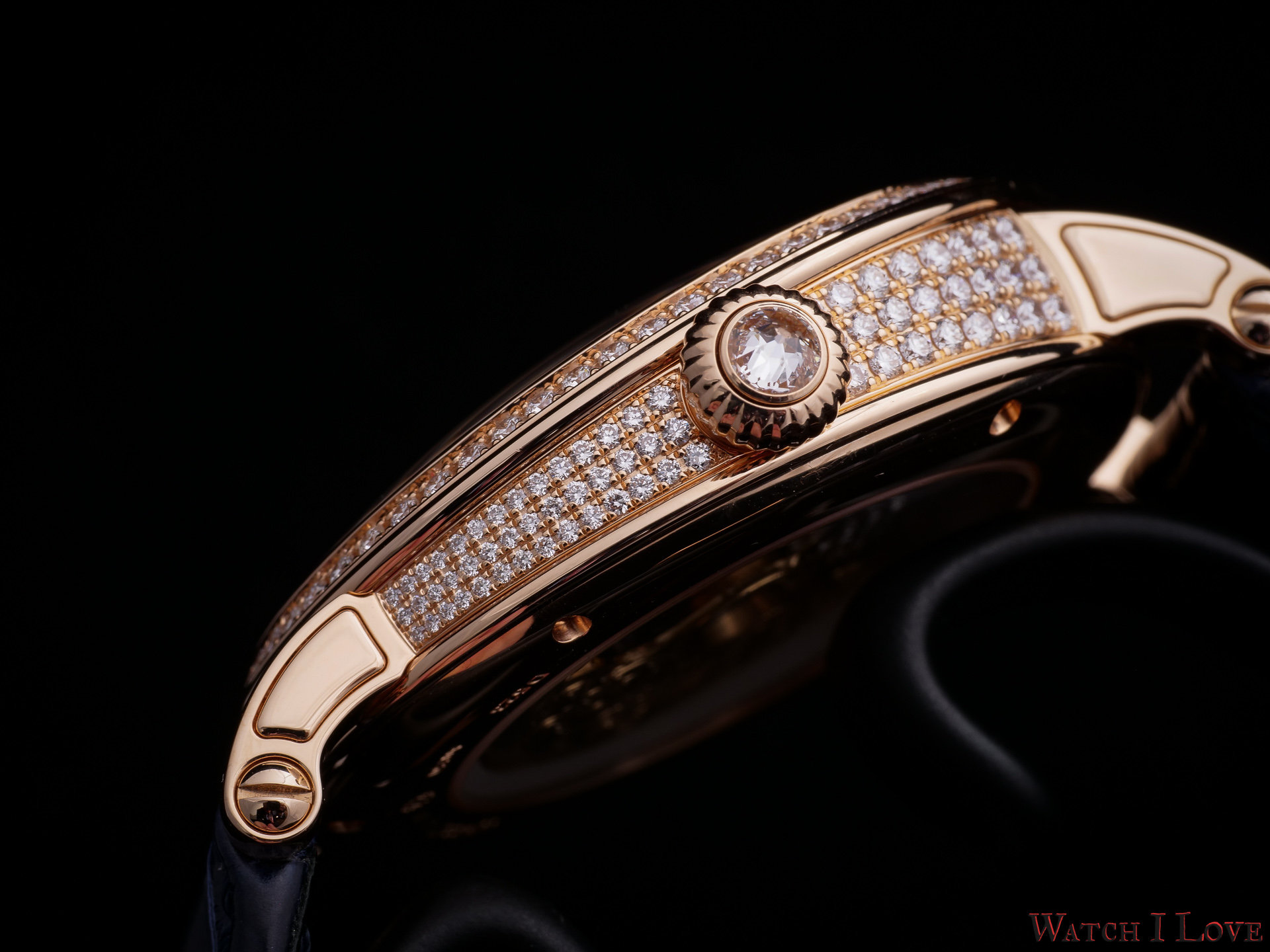 The sloped case is paved with diamonds on the entire caseband, inclusive between the lugs. The lugs are relatively long and deep curved, to permit a good view of the watch case.