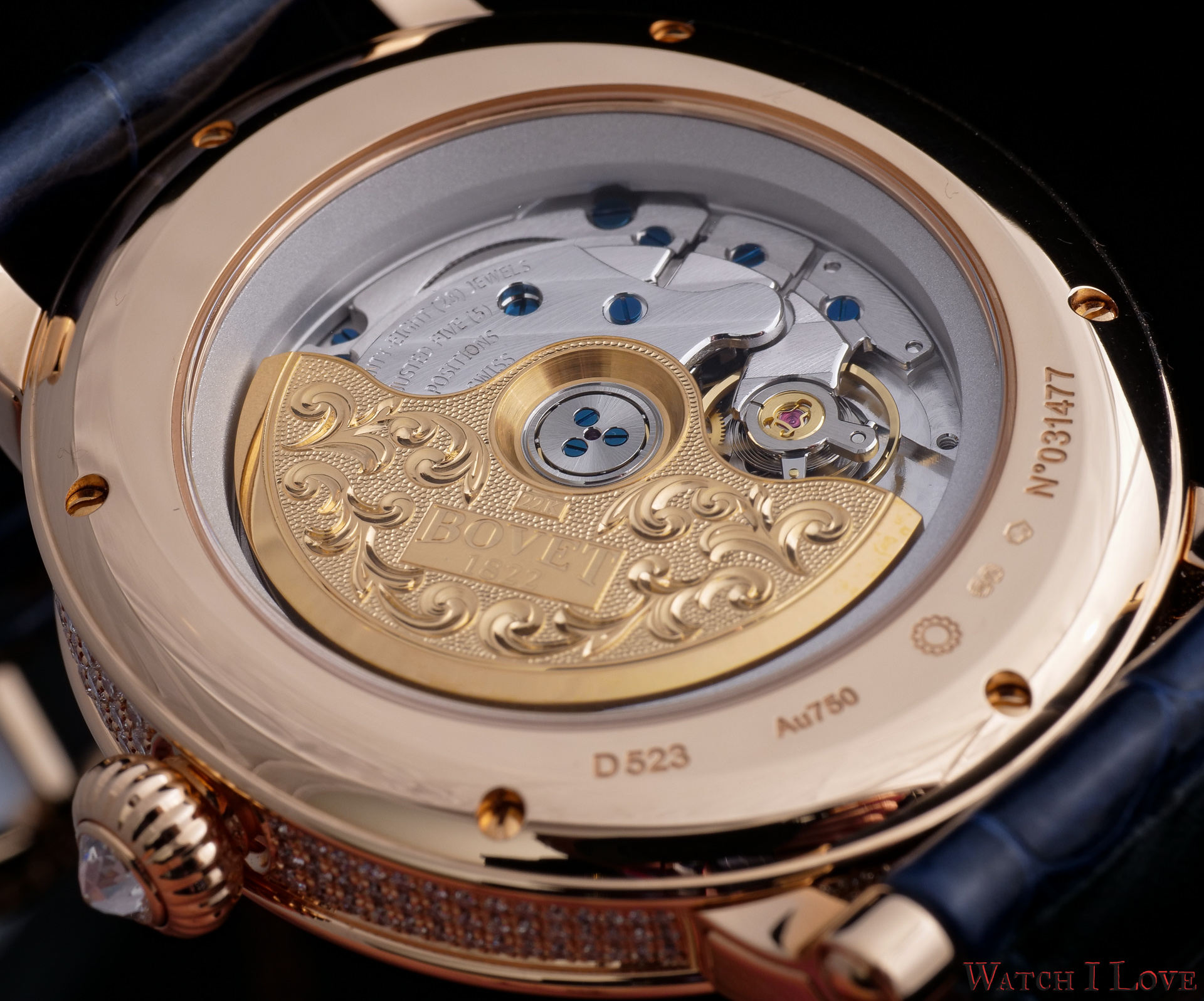 Bovet Récital 23 Moon phase is powered by the Calibre 11DA17-MP. The self-winding movement is as exceptional as the rest of the watch. The see-through case reveals its entire beauty.