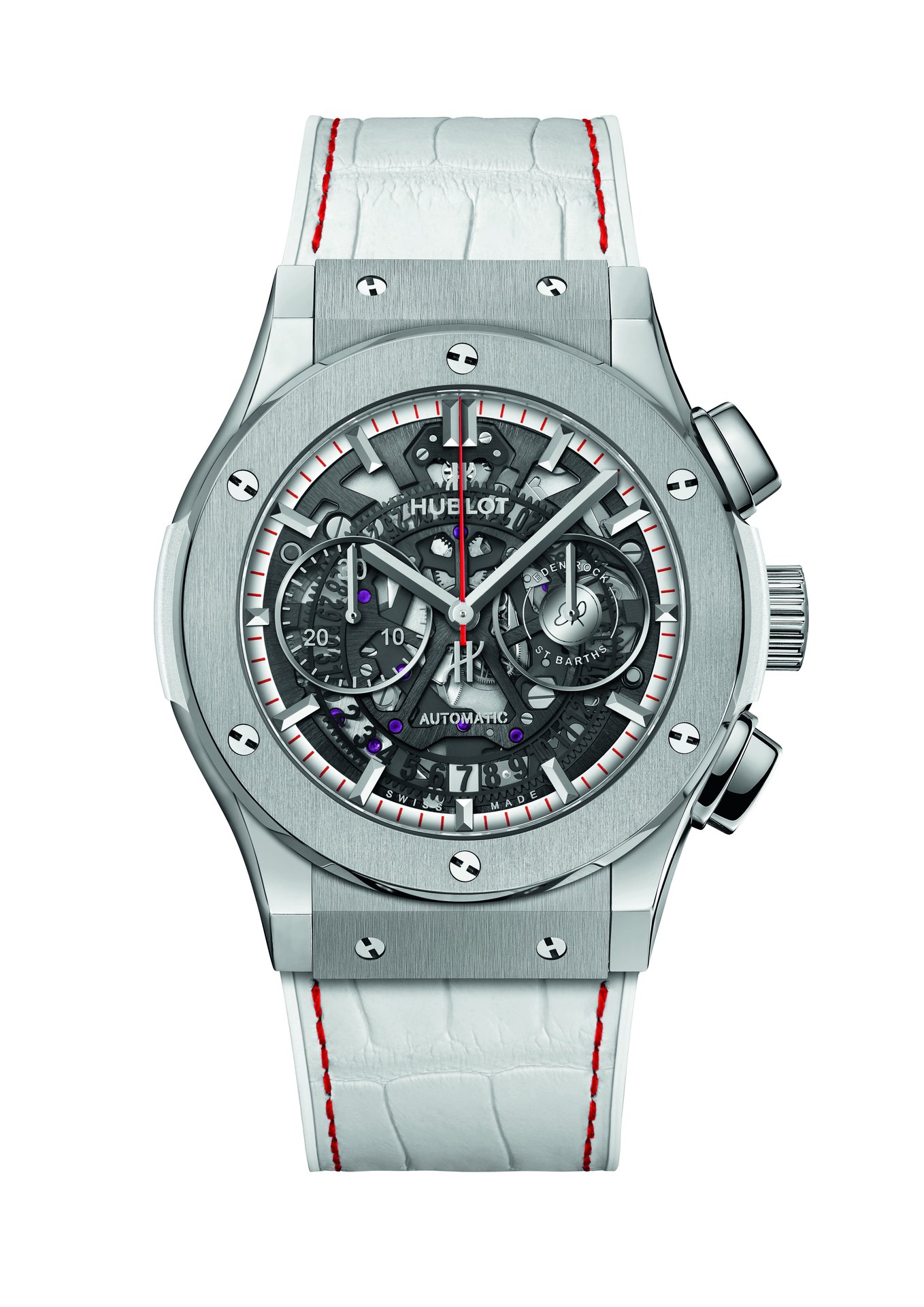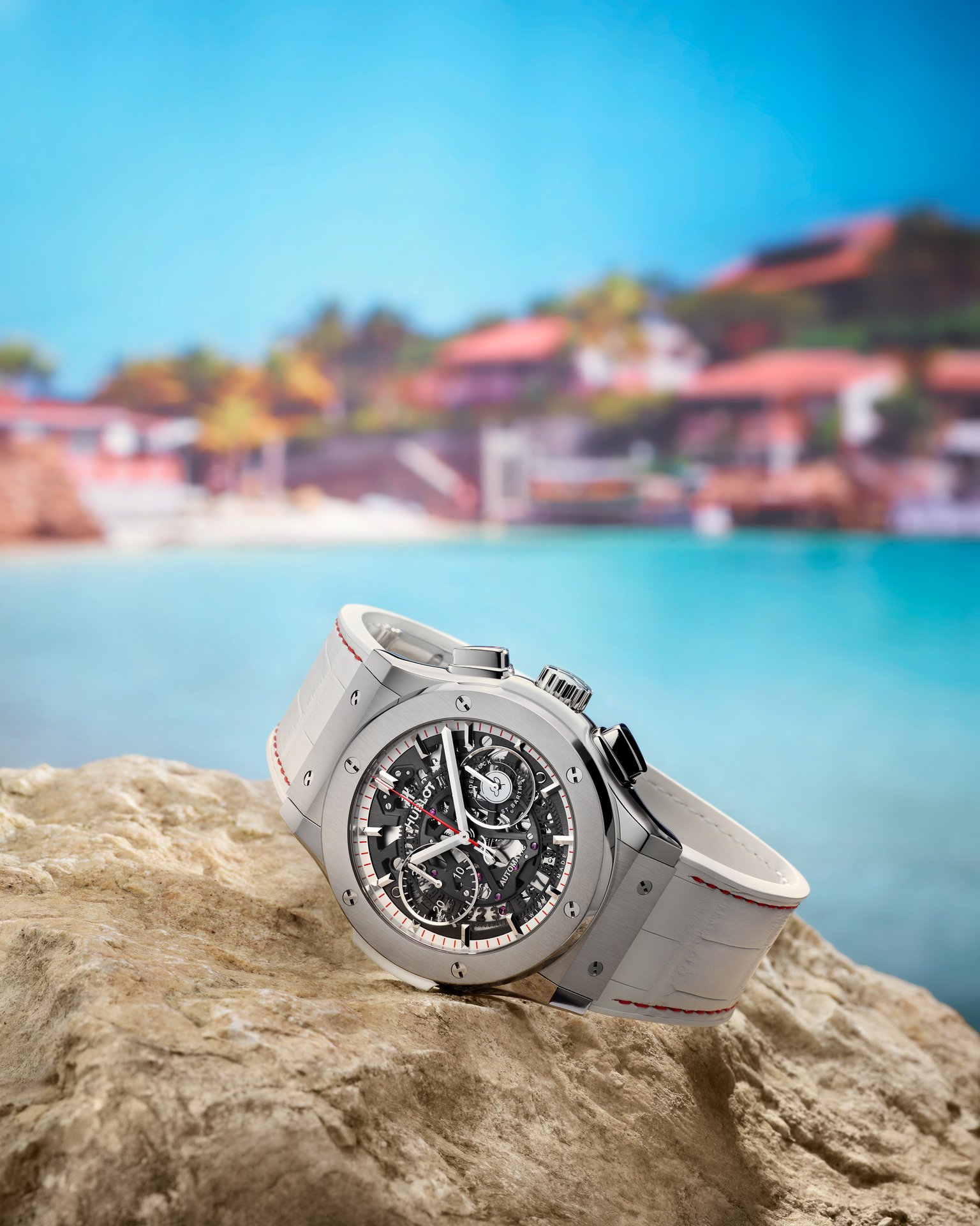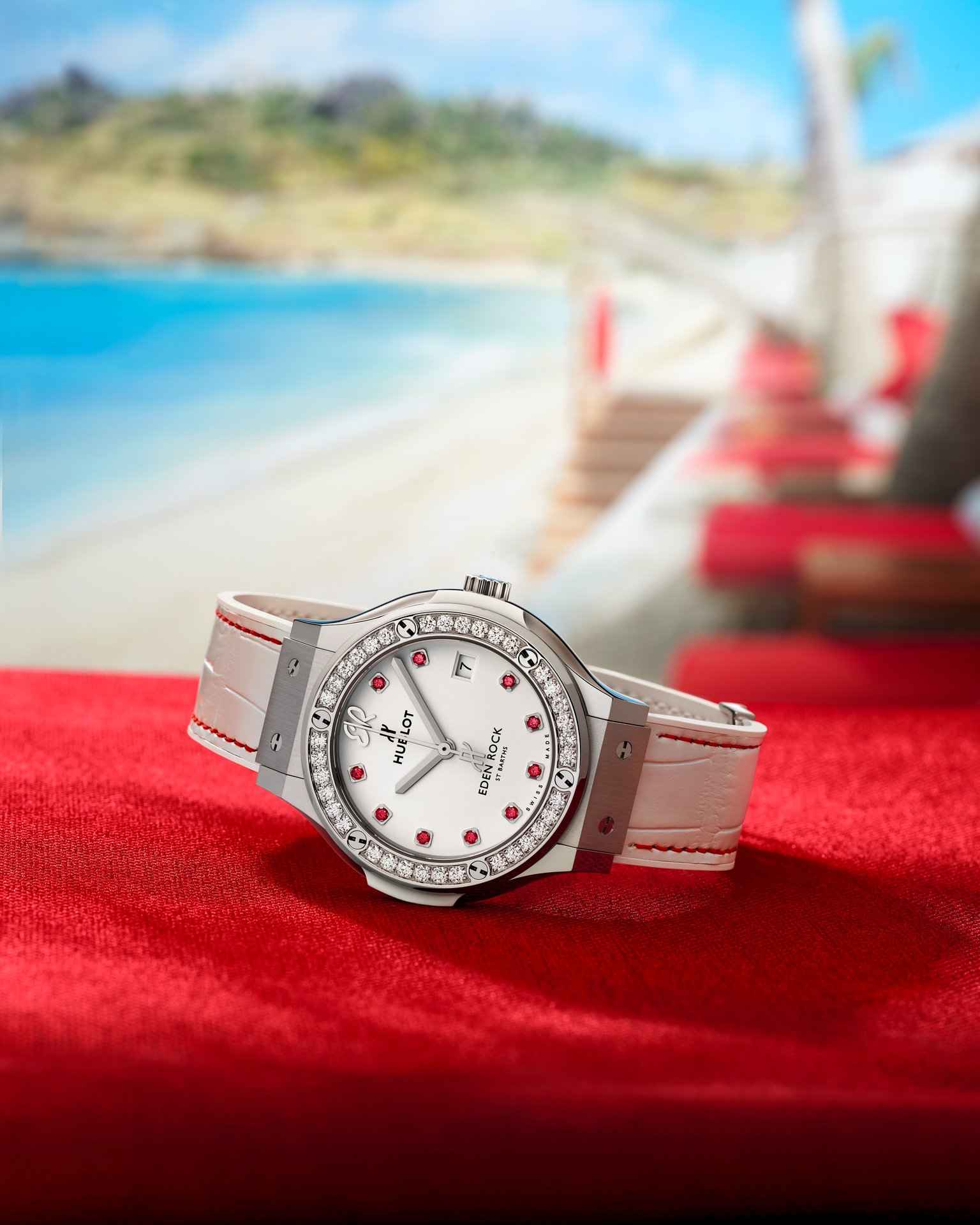 Deliberately white like the pristine sand of the beach or the sun-bleached walls – everyone will have their own interpretation – the watch has a single touch of colour; the famous Eden Rock red. These creative and aesthetic choices conjure up the perfect getaway.