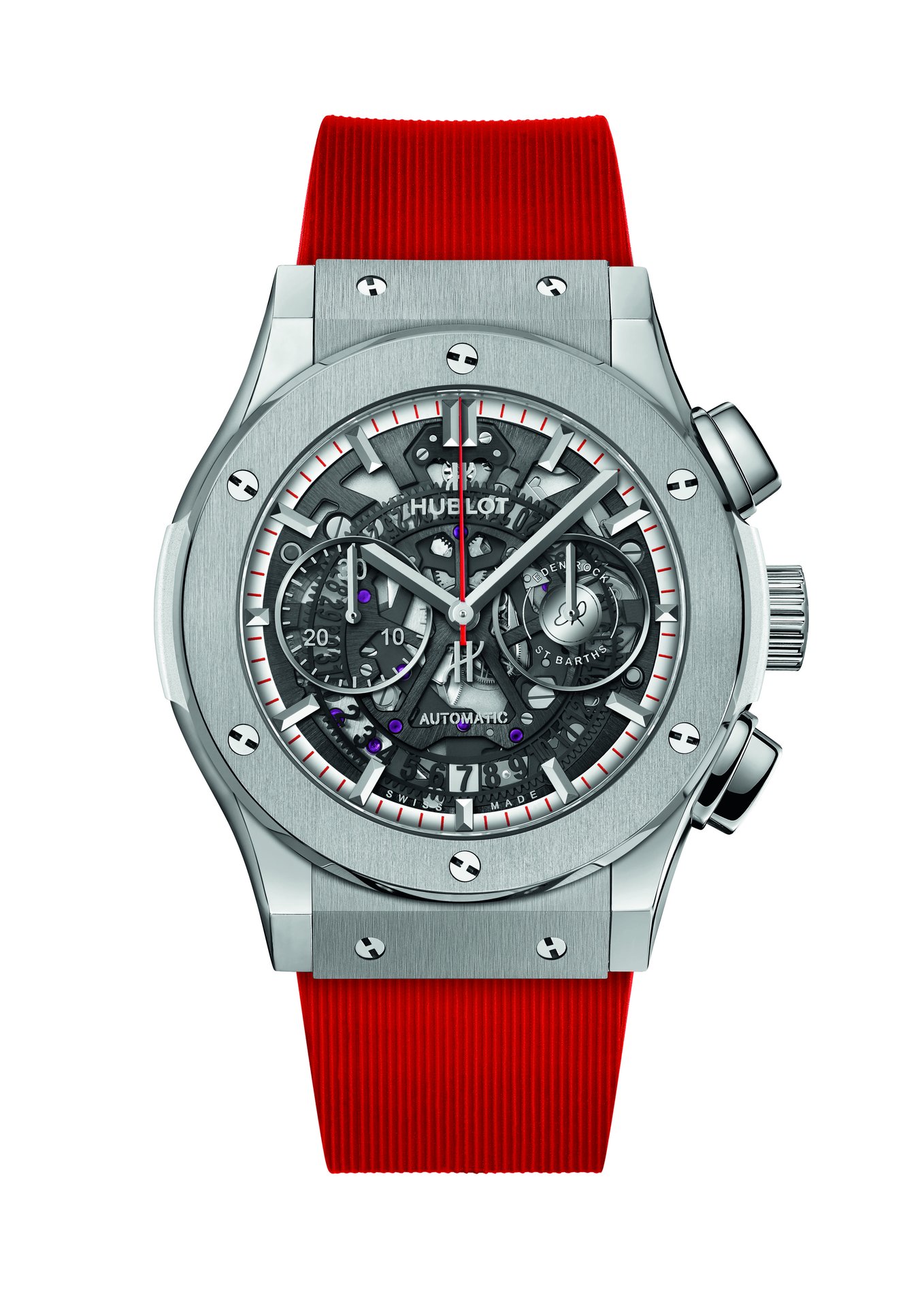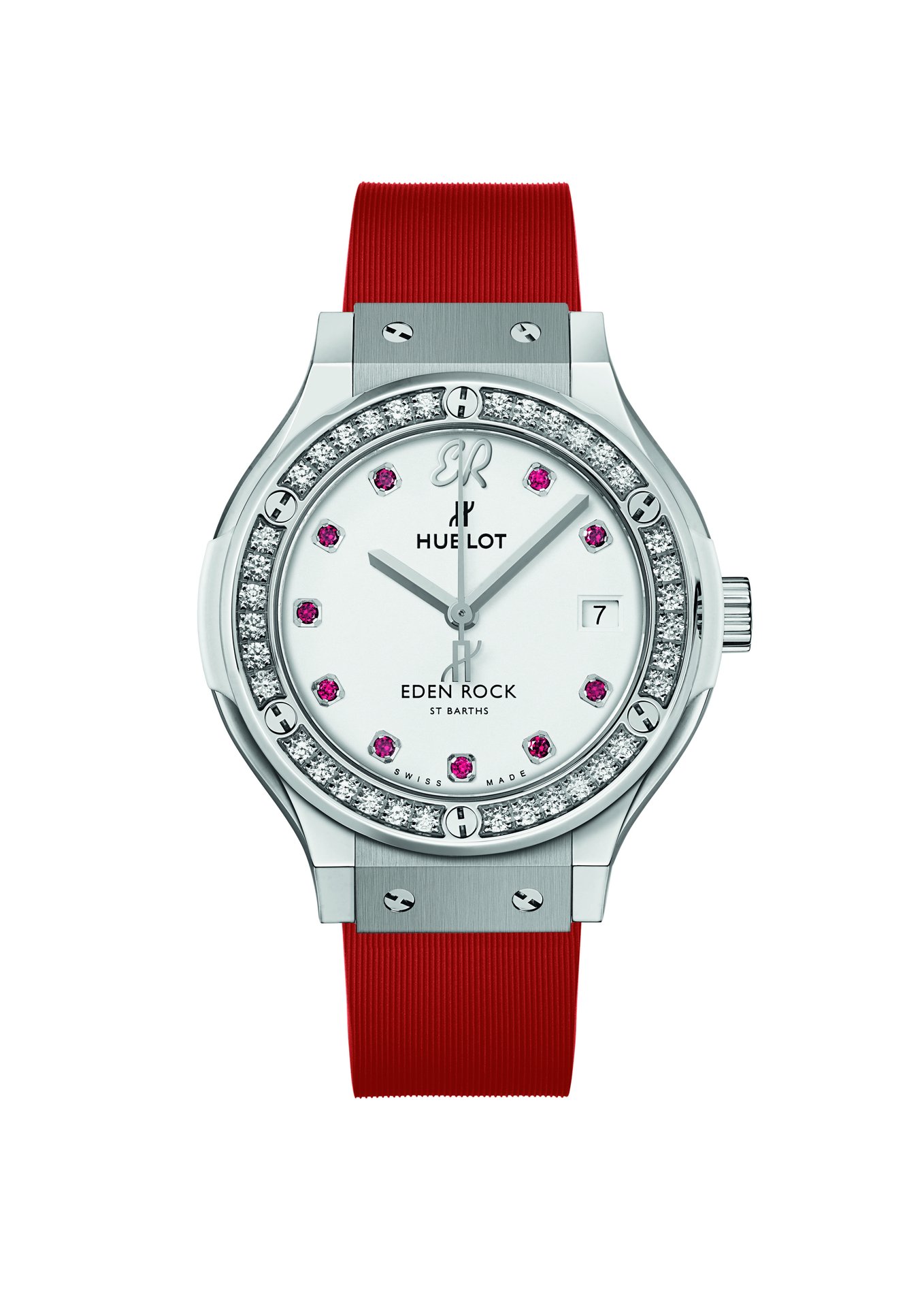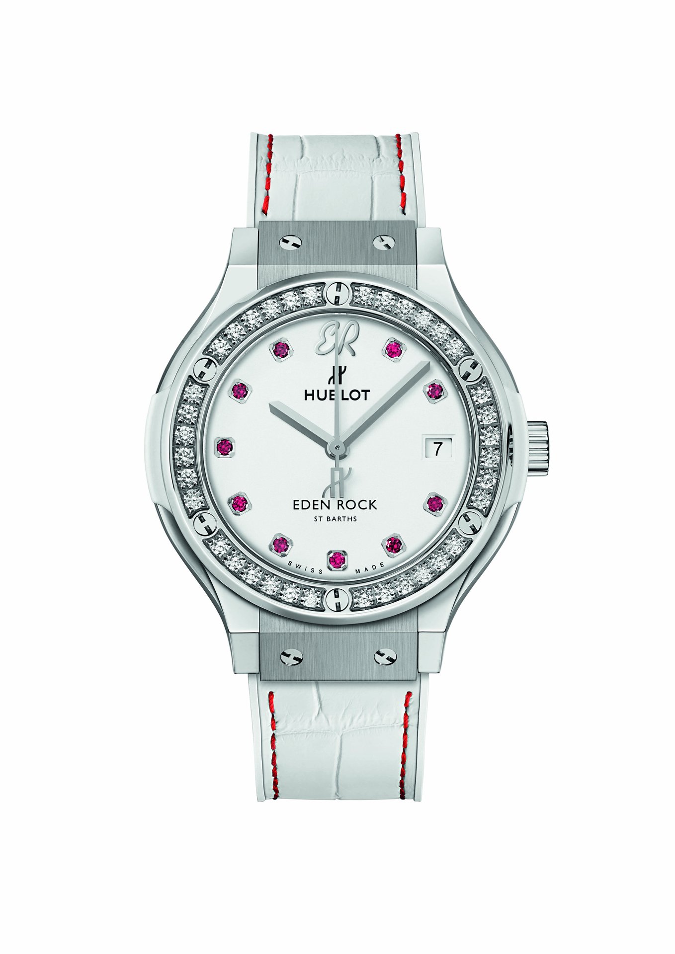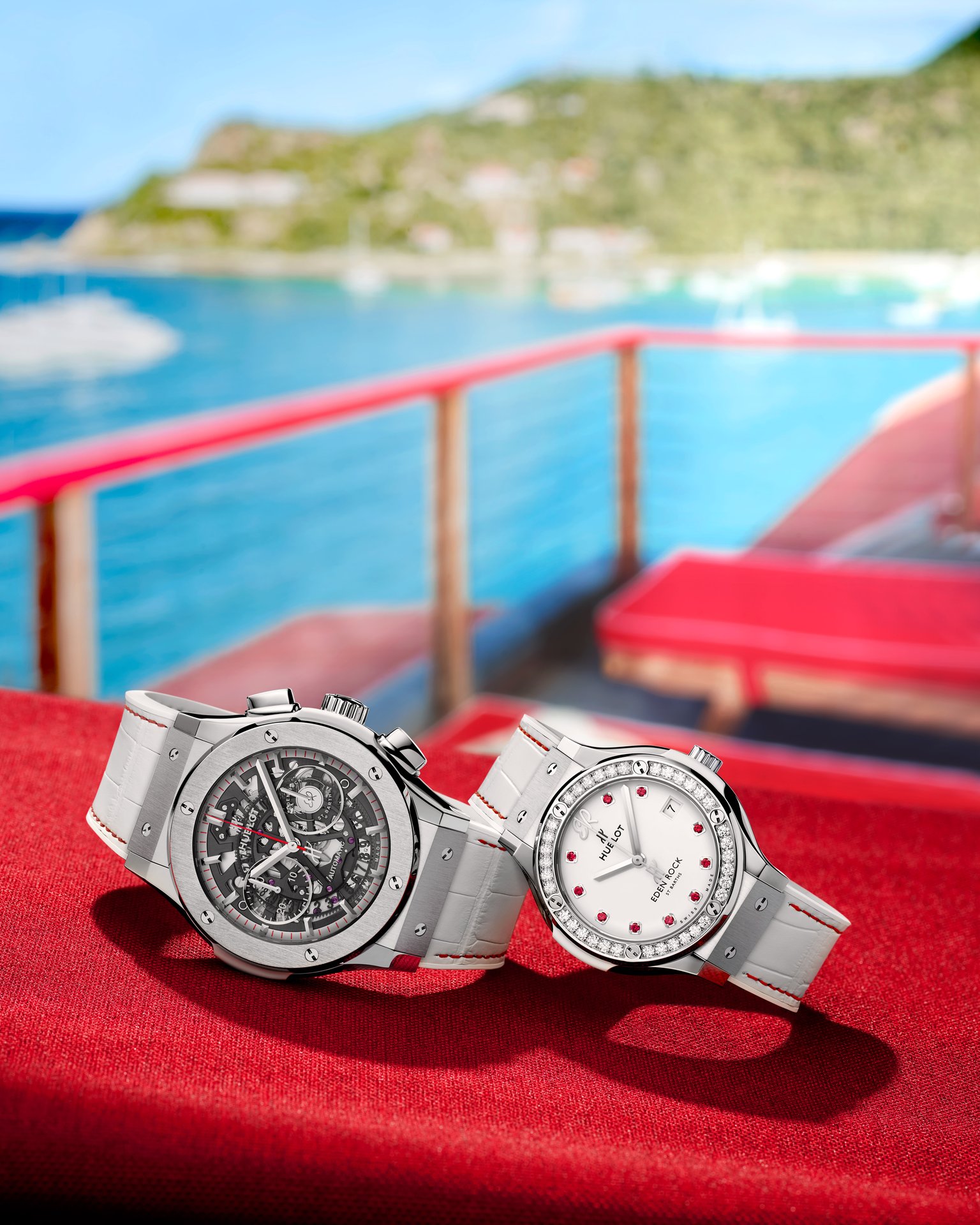 The HUB1155 skeleton self-winding chronograph movement showcases the collaboration with Eden Rock St Barths at 3 o’clock. The second watch sparkles with precious diamonds symbolising eternity, with the white lacquer of its dial set with 10 rubies. These two timepieces are available with three straps: a white alligator strap delicately edged with red thread, along with white and red full rubber straps, both finely ribbed.