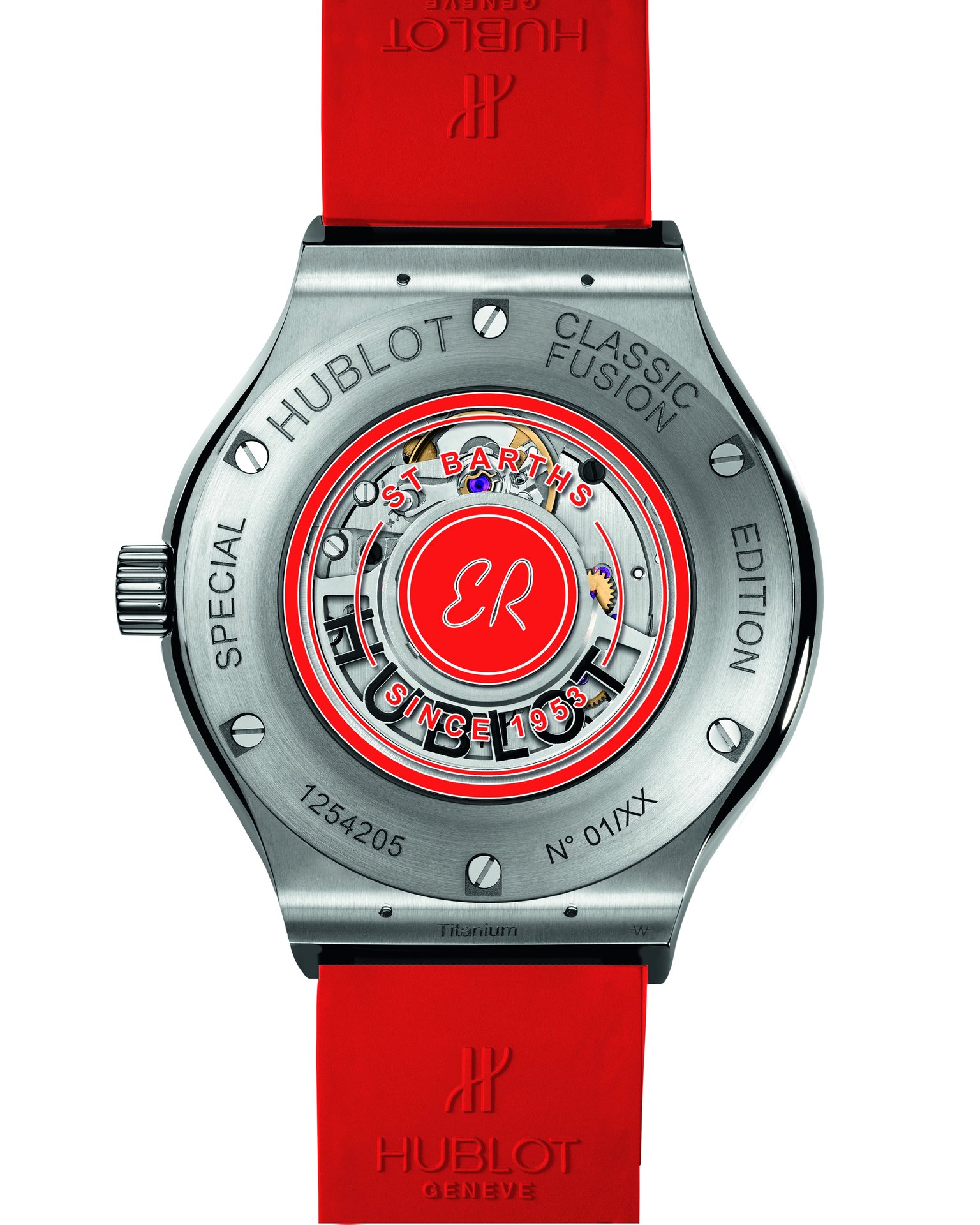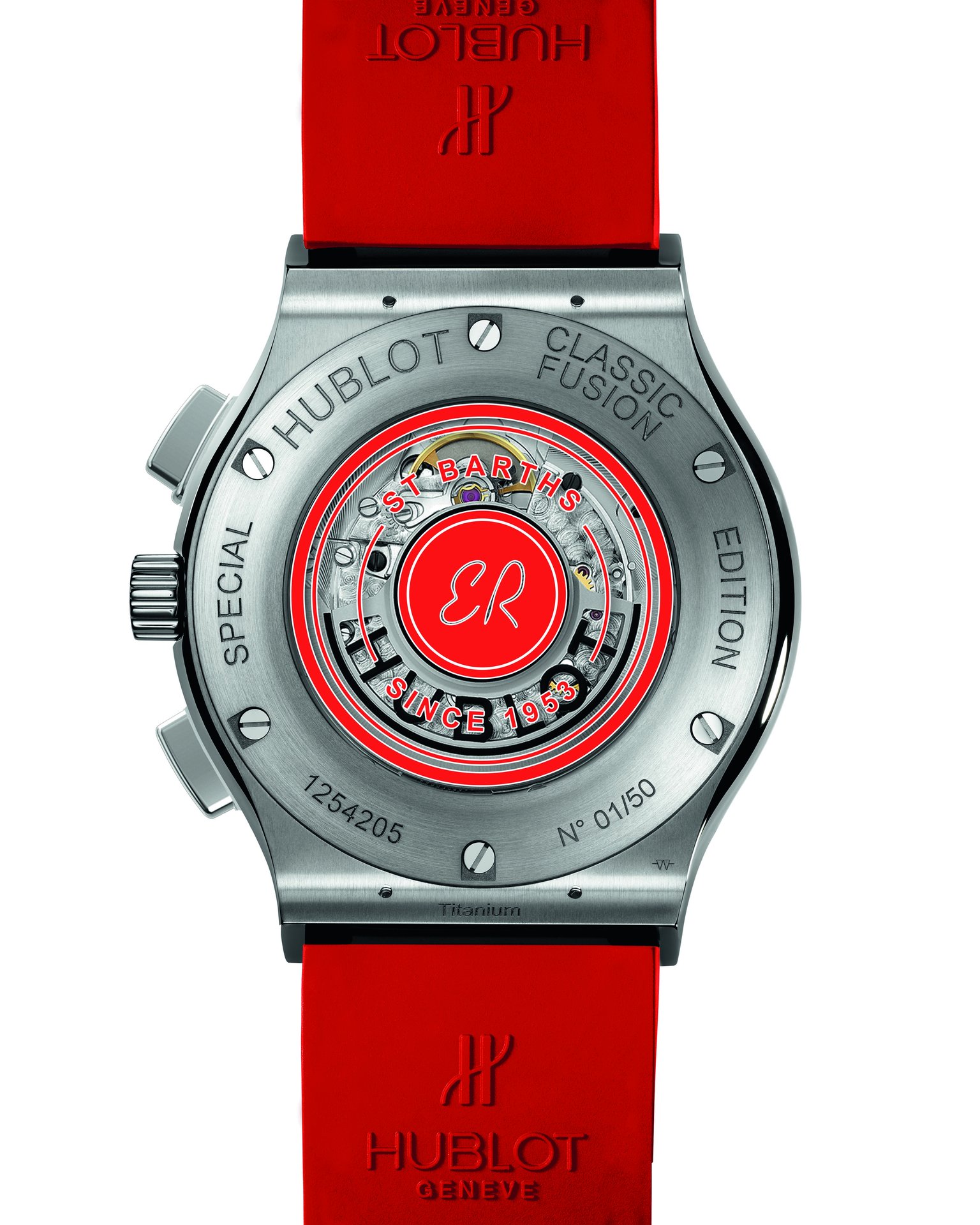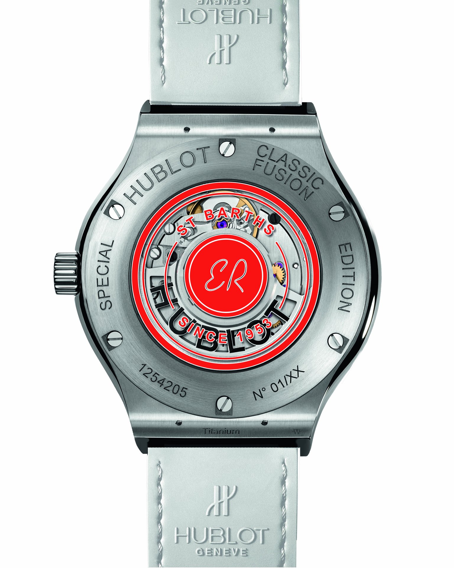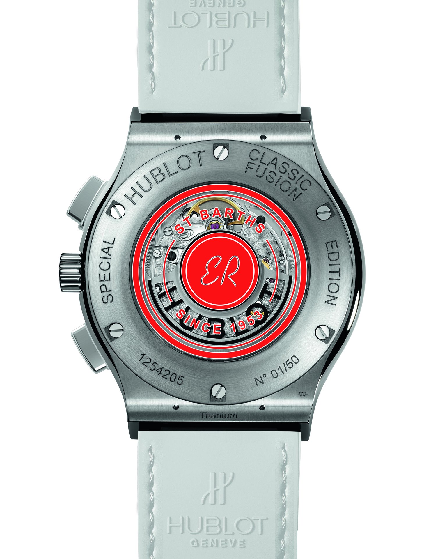 The HUB1155 skeleton self-winding chronograph movement showcases the collaboration with Eden Rock St Barths at 3 o’clock. The second watch sparkles with precious diamonds symbolising eternity, with the white lacquer of its dial set with 10 rubies. These two timepieces are available with three straps: a white alligator strap delicately edged with red thread, along with white and red full rubber straps, both finely ribbed.