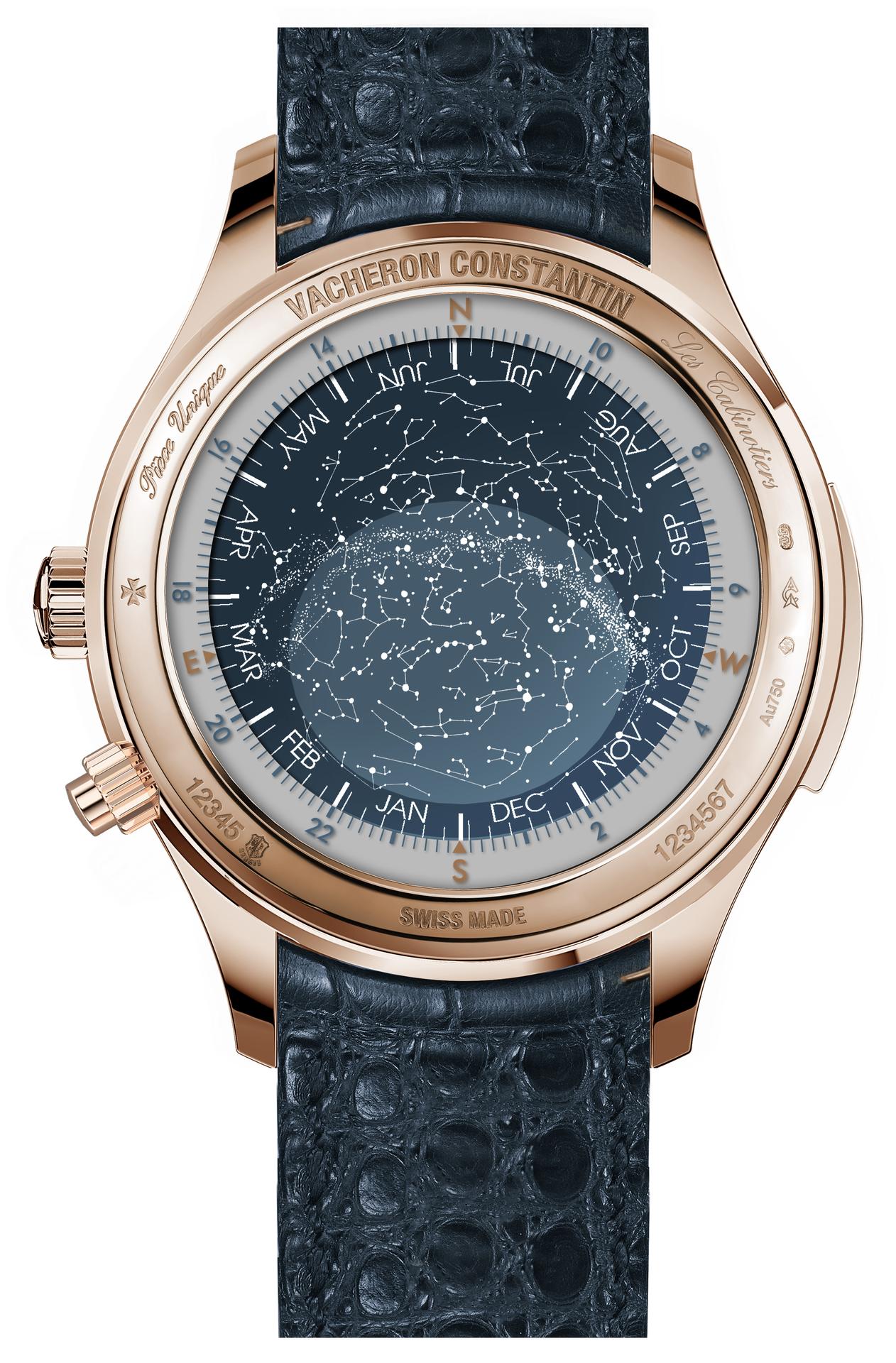 Displayed on the back of the watch on a concave dial designed to accentuate the depth effect, the sky chart offers a striking view of the Milky Way and the constellations that appear in all their brilliance, as if through a telescope. Governed by a concern for accuracy, this celestial table performs a complete rotation in 23 hours and 56 minutes corresponding to the sidereal time which is displayed on the periphery, accompanied by the indication of the day, month and cardinal points. In keeping with horological requirements, an ellipse drawn on the sapphire crystal highlights the exact position of the constellations at the moment the watch is viewed.