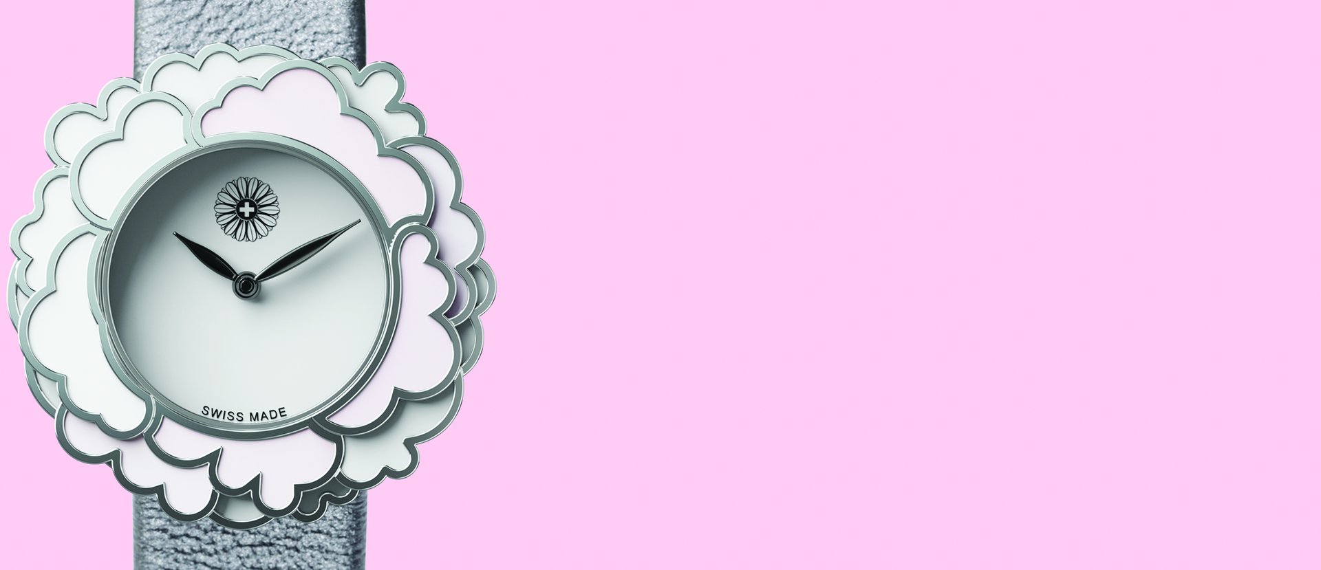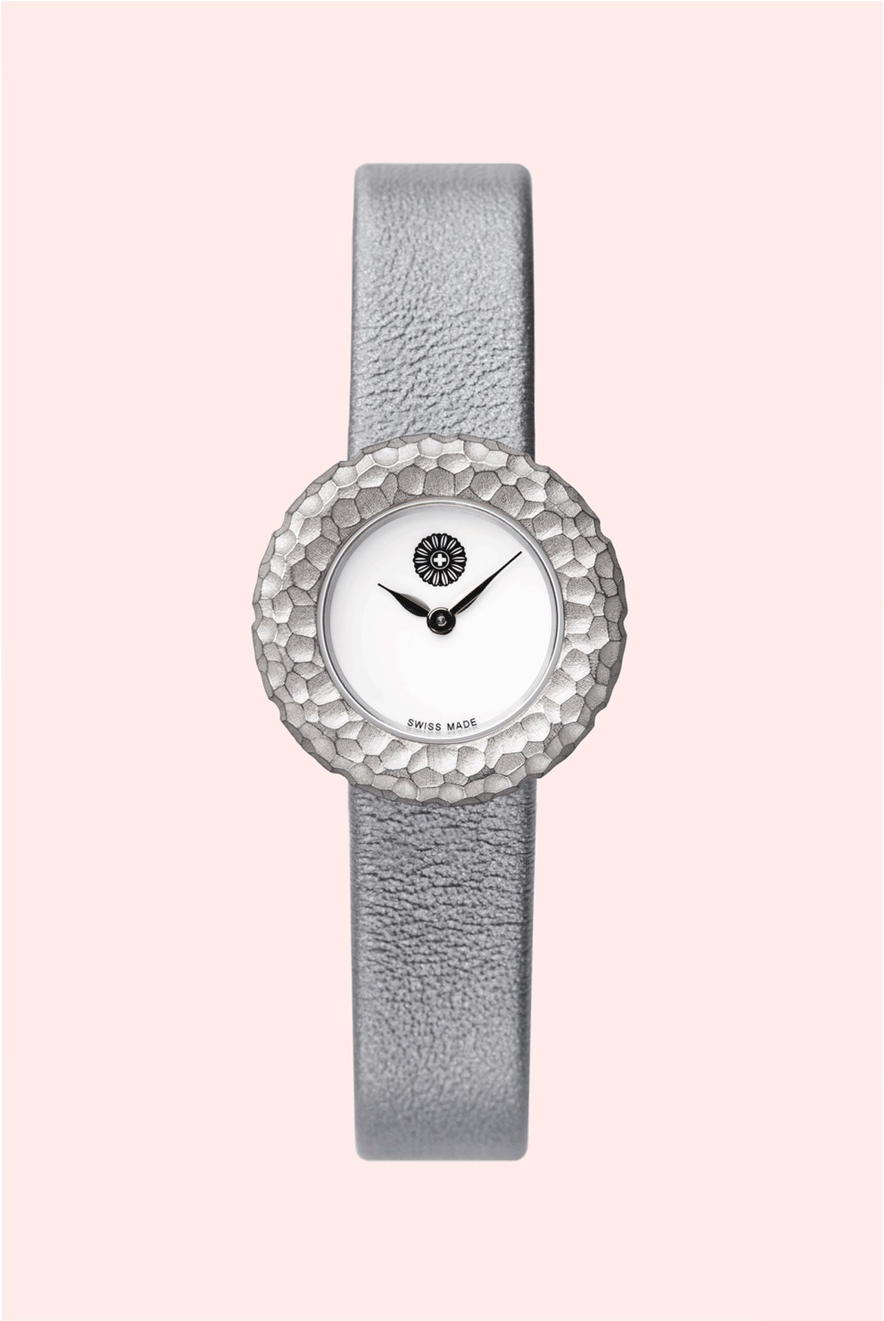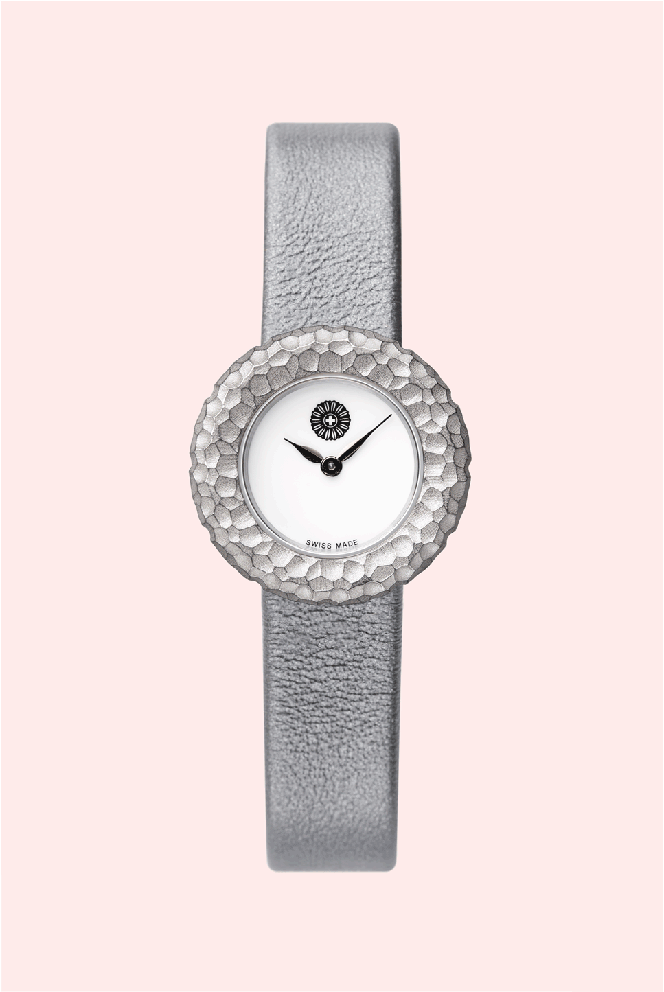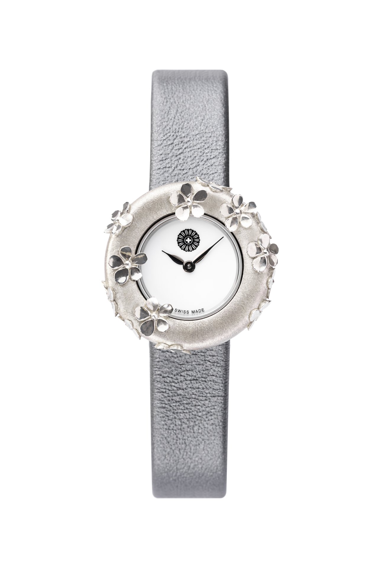 Inspiration: We draw inspiration from the pure and modern shapes of design in the 1970s. These shapes suggest movement while evoking freedom and freshness. The silver polish enhances the romantic shapes of the bezel and instils a play-of-light and overall smoothness.