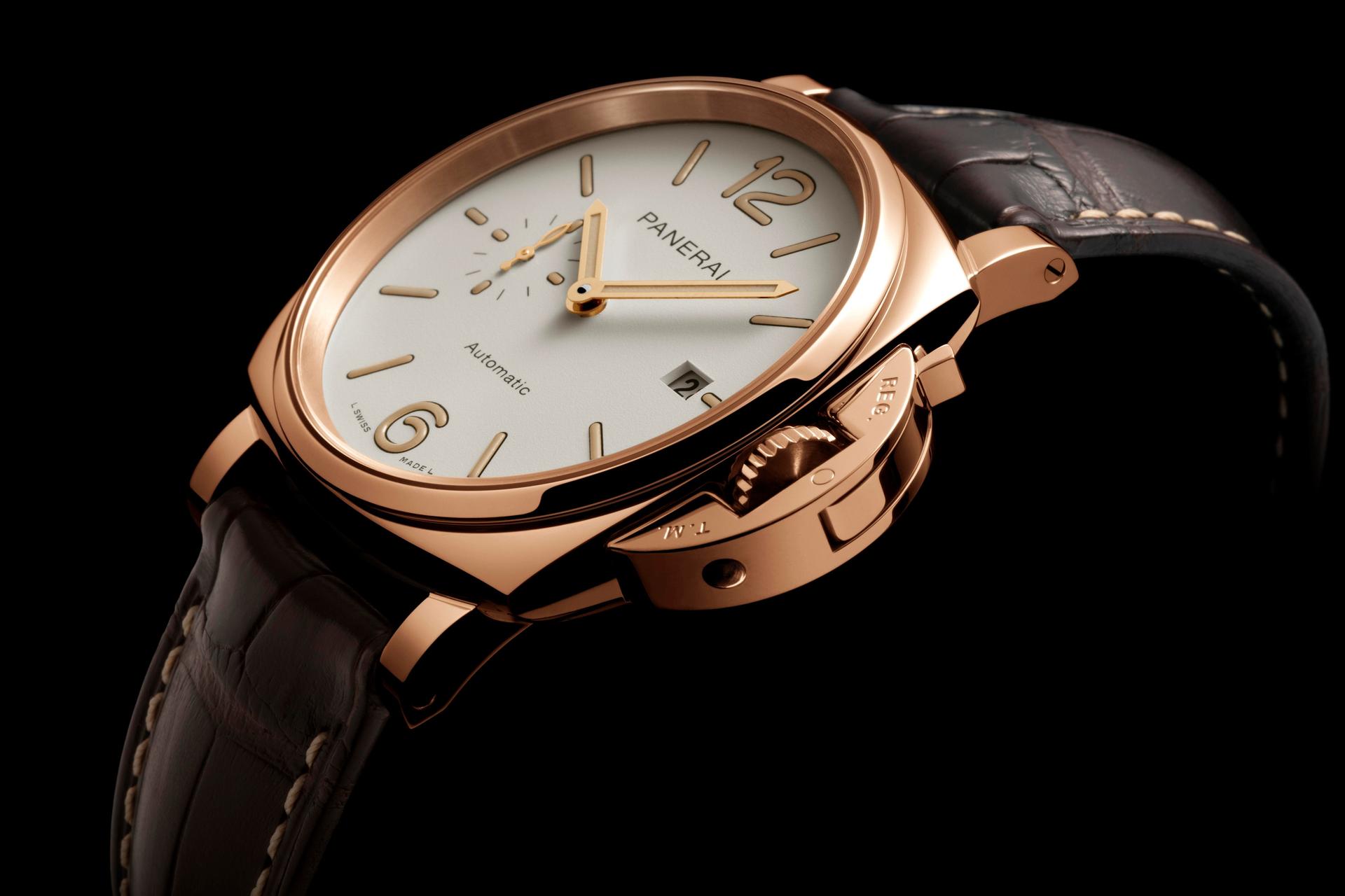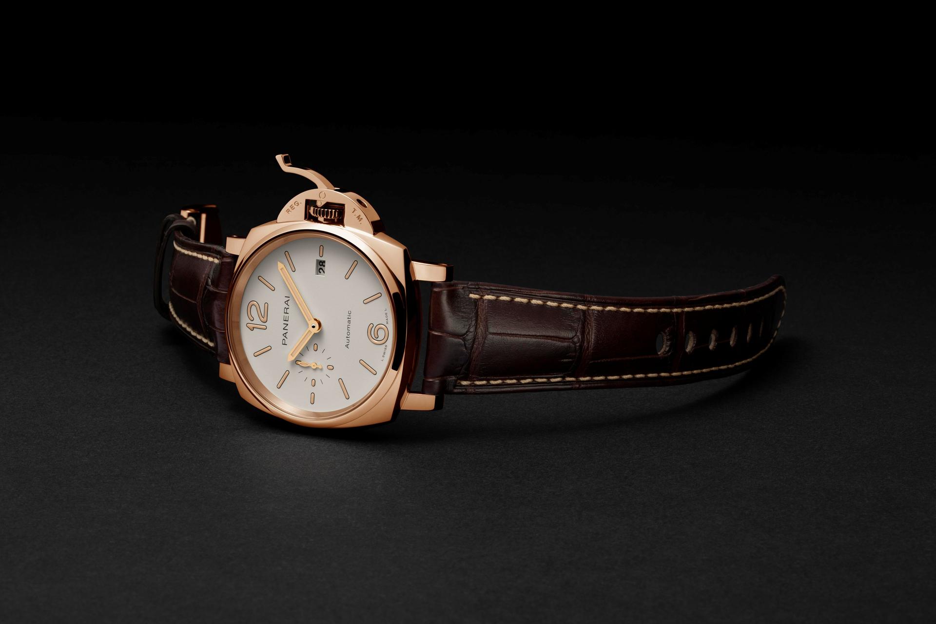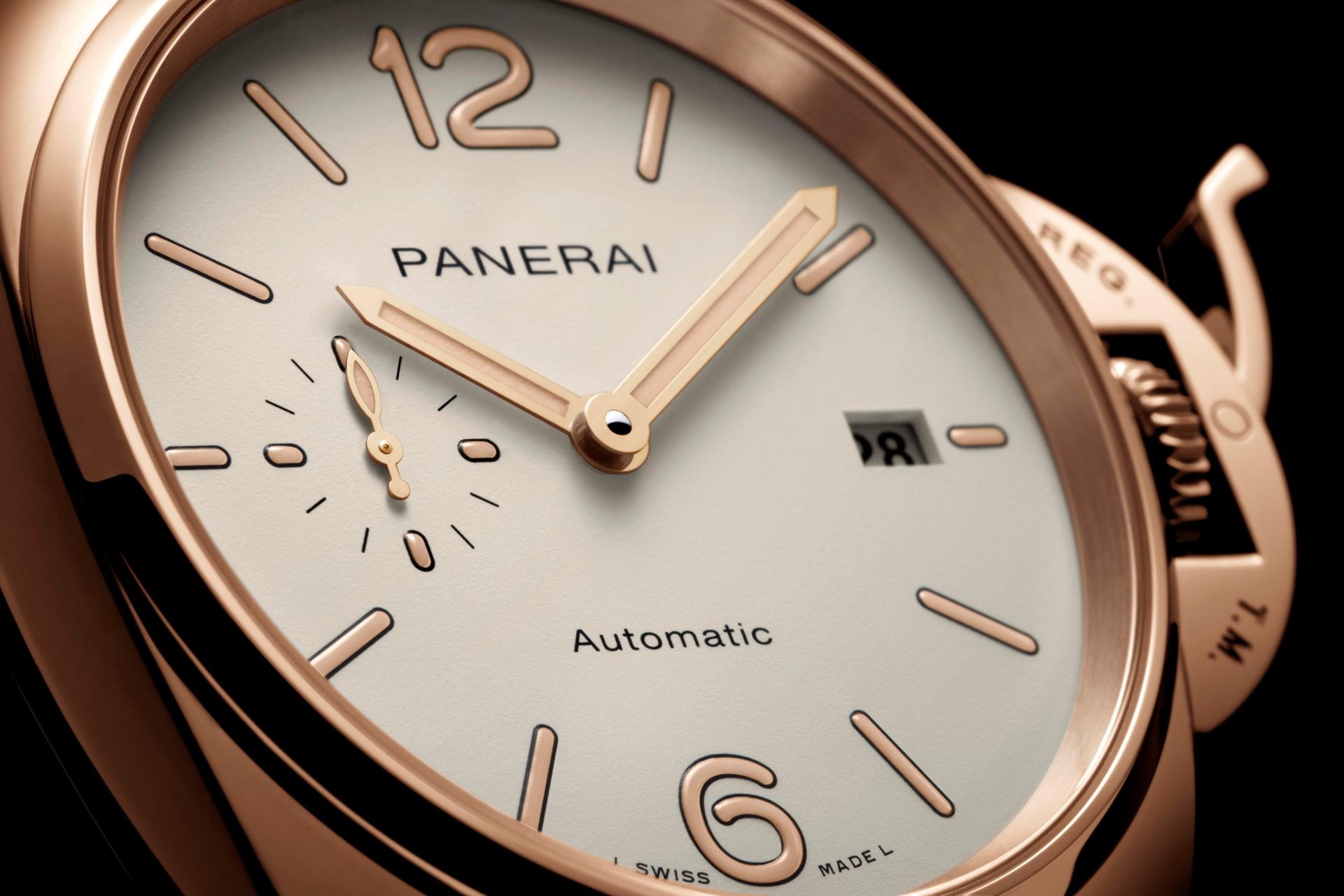 The new Luminor Due – 42 mm turns to gold. The case, the bezel, the Safety Lock™ crown protective device, the back and the buckle are formed of alchemy like fusions of Panerai Goldtech™, a special 18-carat gold alloy with an original composition which is notable for its high percentage of copper as well as the presence of platinum. The purpose of the copper is to give the colour intensity and depth, while the platinum is there to lower the tarnishing effects of oxidation.