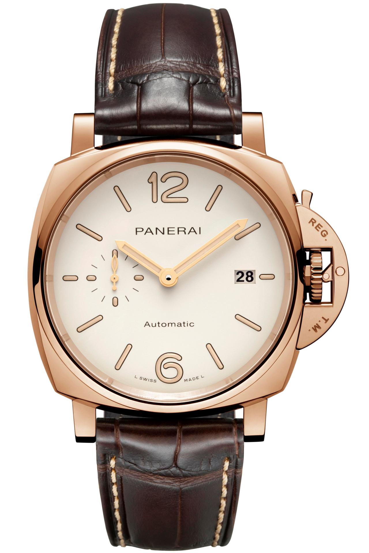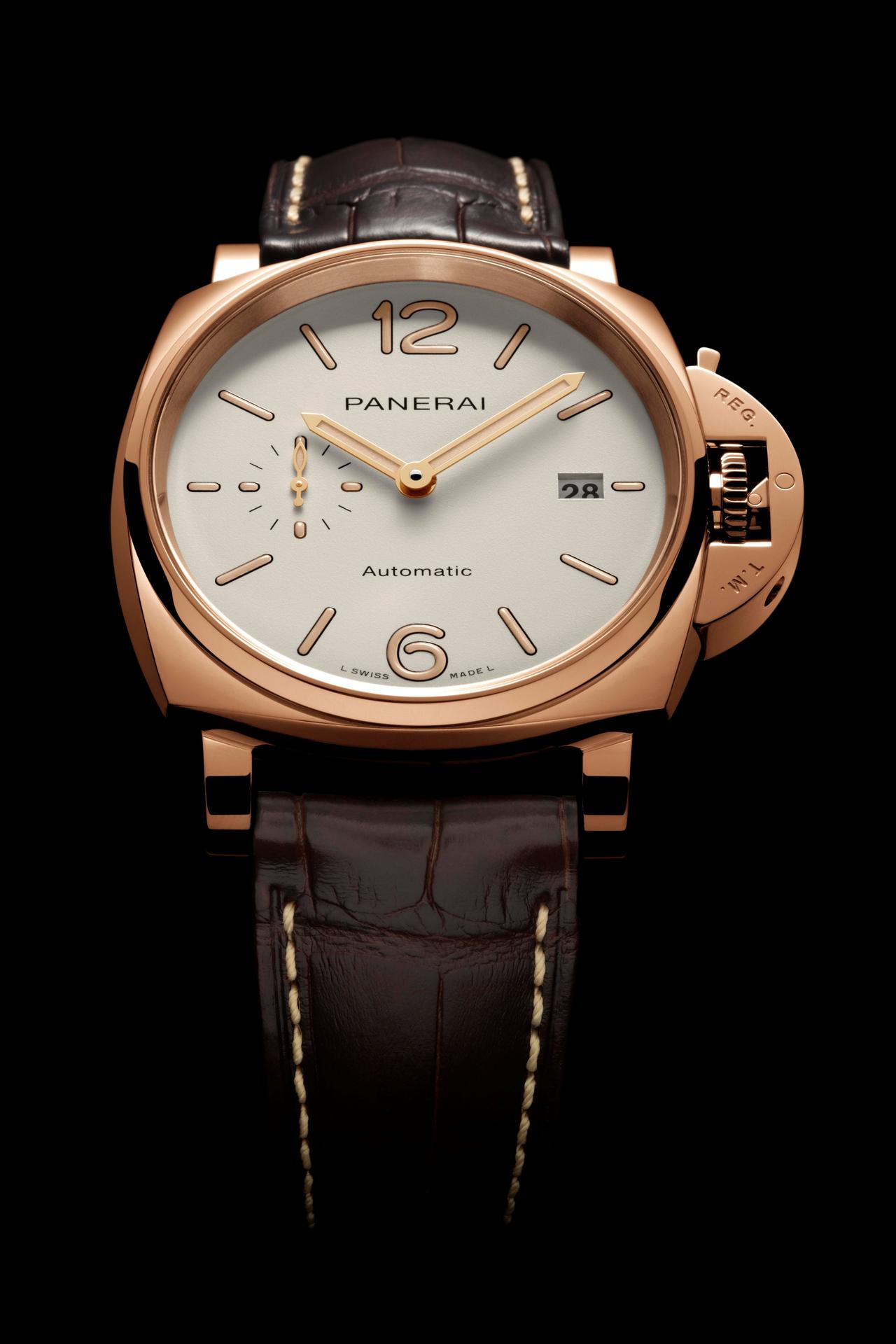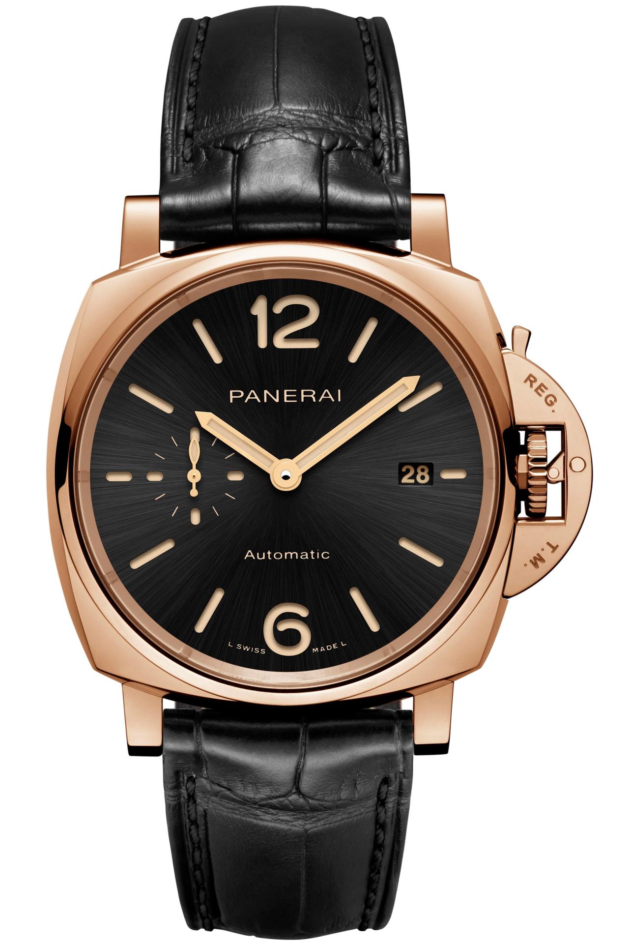 The new Luminor Due – 42 mm turns to gold. The case, the bezel, the Safety Lock™ crown protective device, the back and the buckle are formed of alchemy like fusions of Panerai Goldtech™, a special 18-carat gold alloy with an original composition which is notable for its high percentage of copper as well as the presence of platinum. The purpose of the copper is to give the colour intensity and depth, while the platinum is there to lower the tarnishing effects of oxidation.