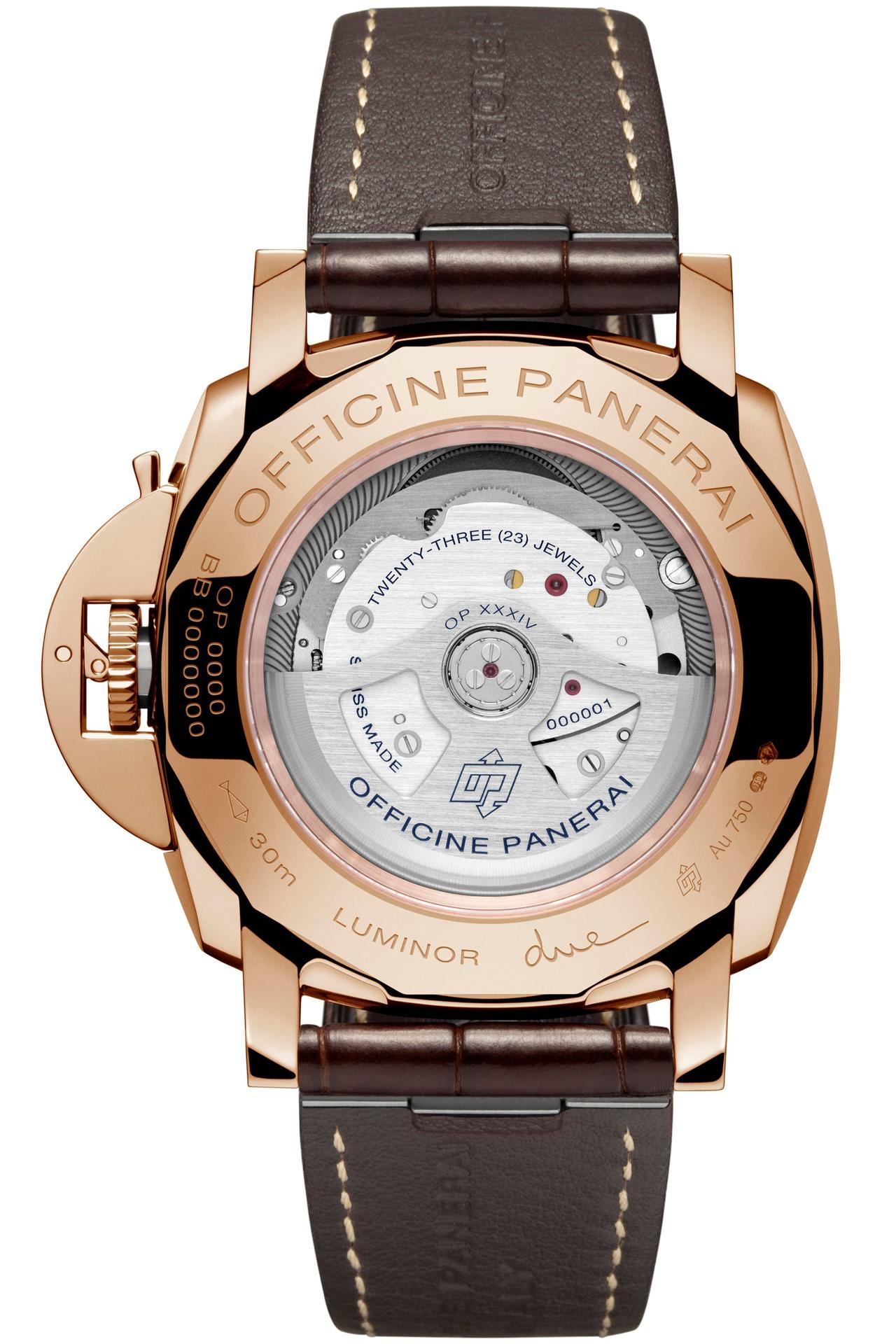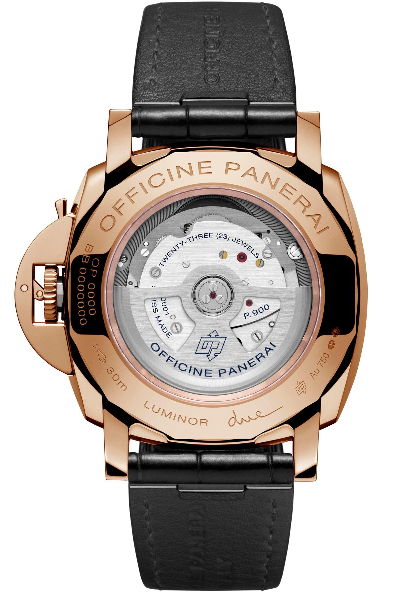 The new P.900 Calibre fits perfectly into the small size of the Luminor Due case. Visible through the sapphire crystal back, with its thickness of just 4.2 mm it is today one of Panerai’s thinnest automatic movements.