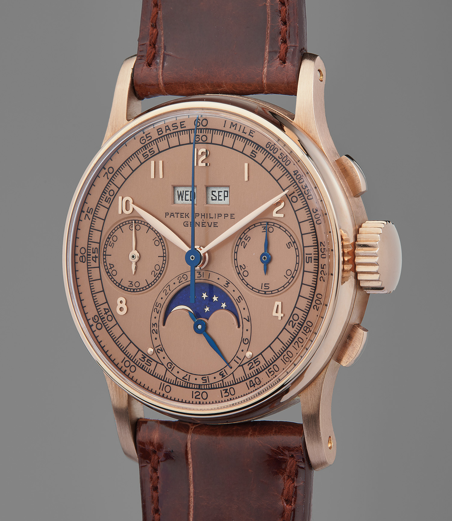 PATEK PHILIPPE. Ref. 1518, A previously unknown, extremely rare, and highly attractive pink gold perpetual chronograph wristwatch with pink dial and moon phase