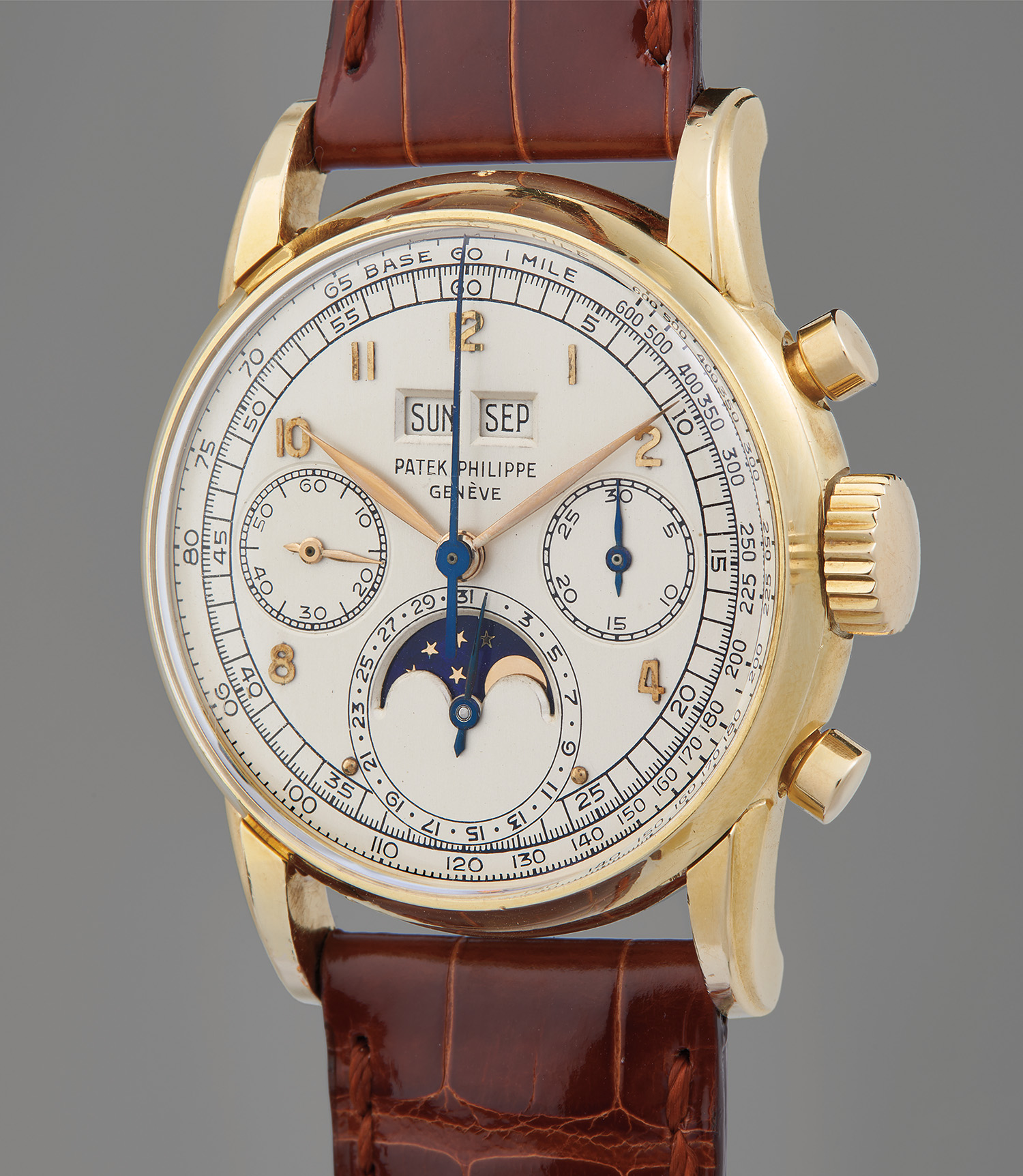 PATEK PHILIPPE. Ref. 2499, A possibly unique, previously unknown, and extremely well-preserved yellow gold perpetual calendar chronograph wristwatch with moon phase, retailed by Gübelin