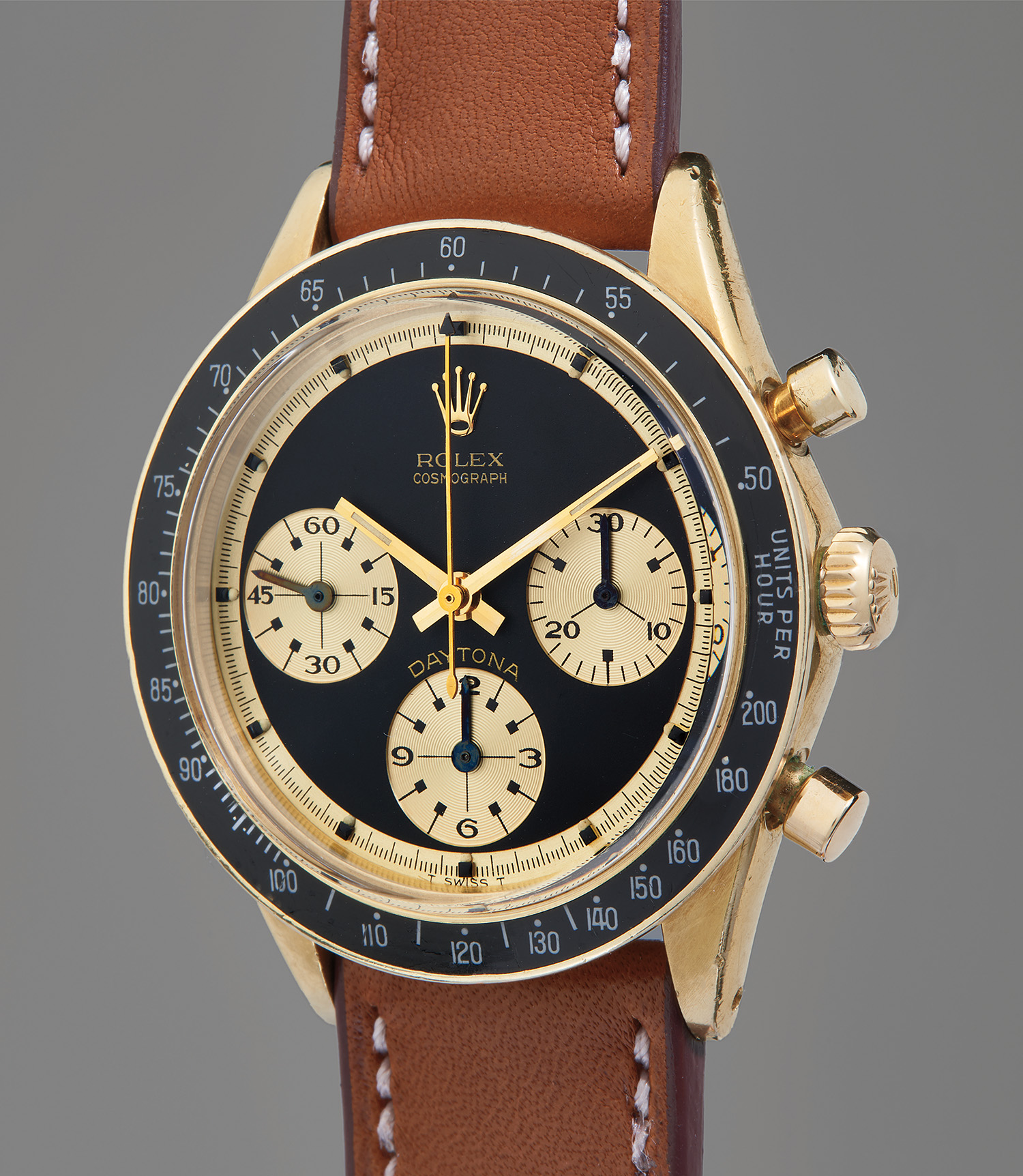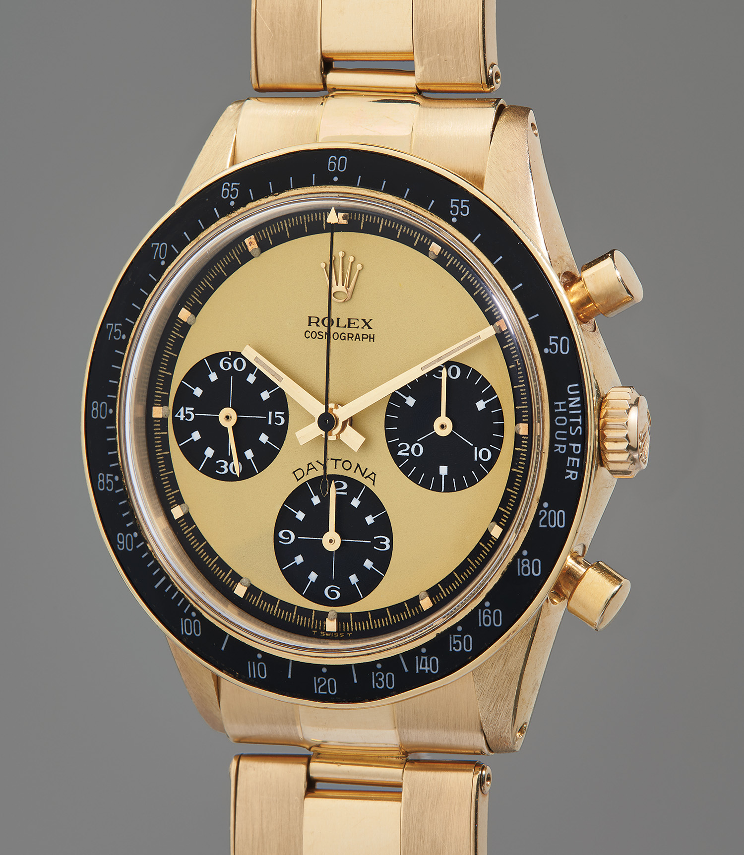 ROLEX. Cosmograph Daytona, Ref. 6241, A very fine, well-preserved, and highly attractive yellow gold chronograph wristwatch with “Paul Newman” dial and original guarantee
