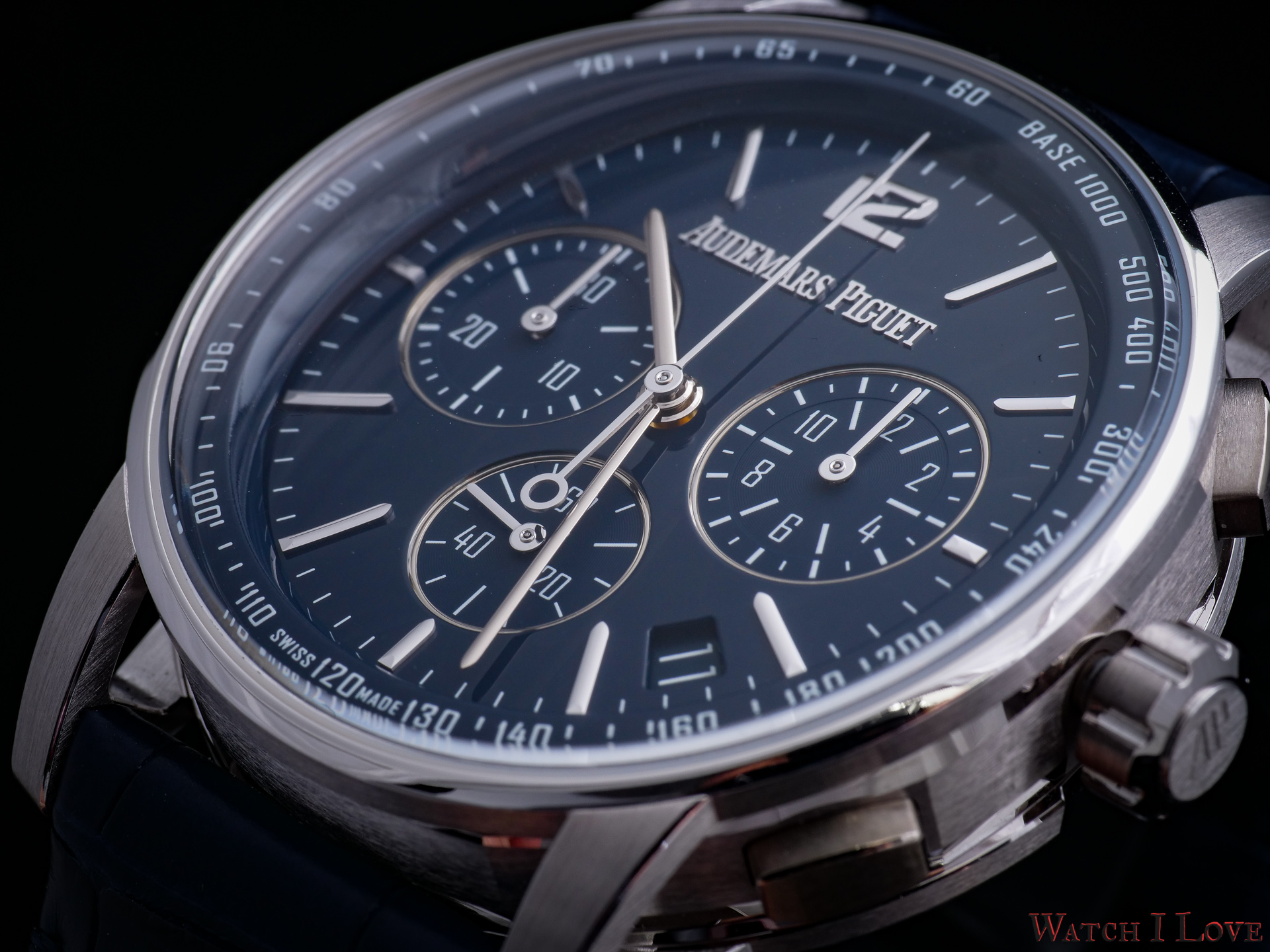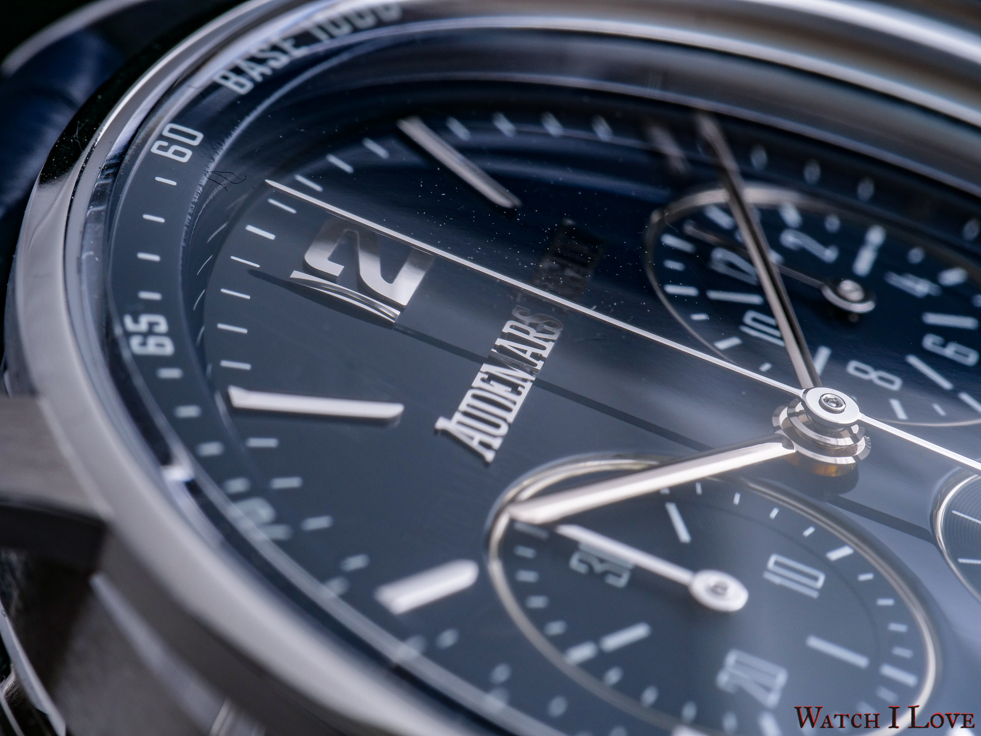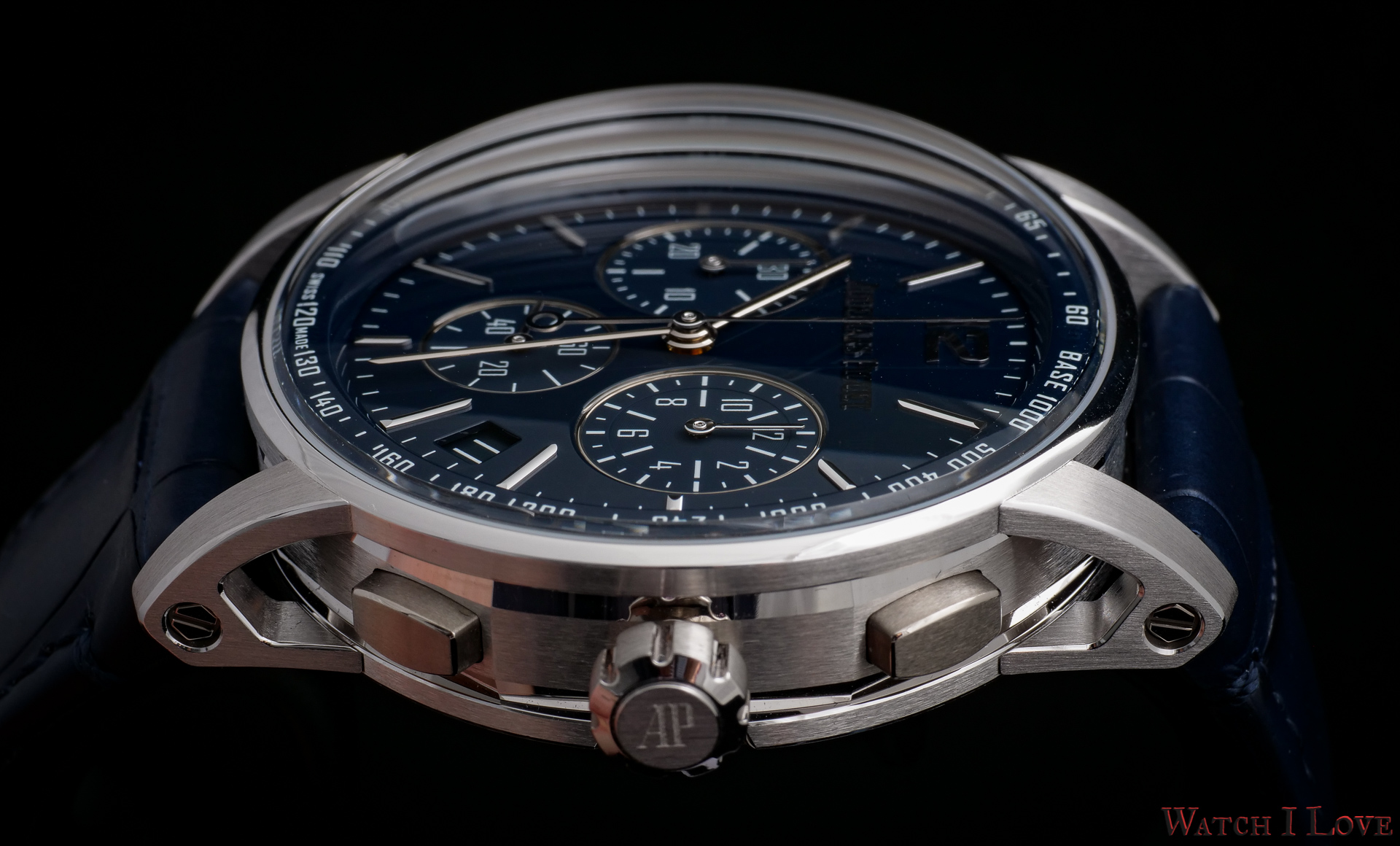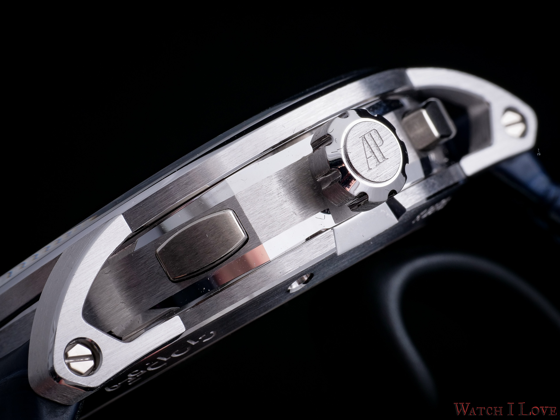 The chronograph pushers have a beautiful shape with satin-brushed surfaces and polished beveling. The crown offers a solid grip. Again, a lovely combination of brushed and polished surfaces adorn the crown. The AP logo engraved in the brushed background makes a good impression.