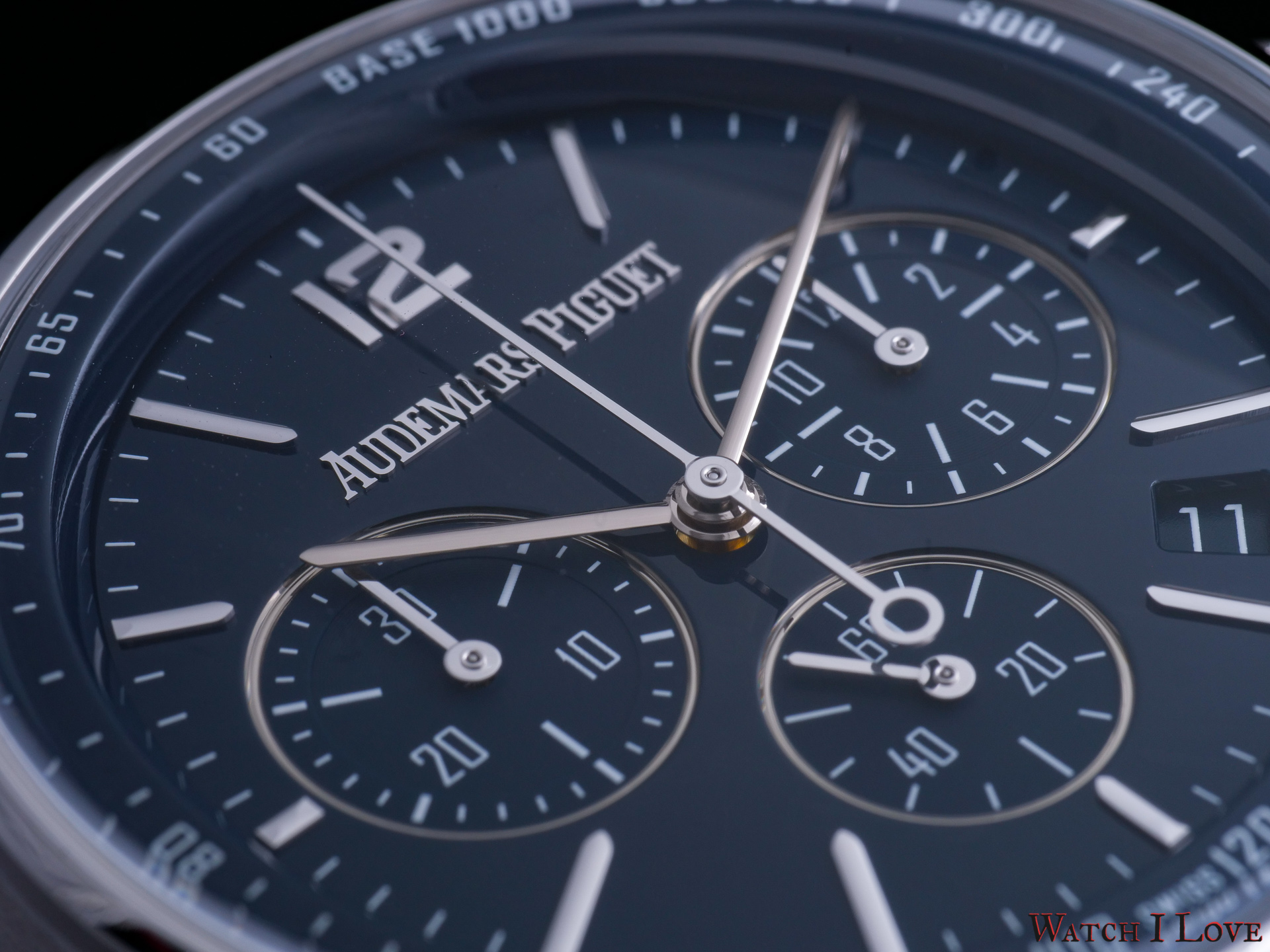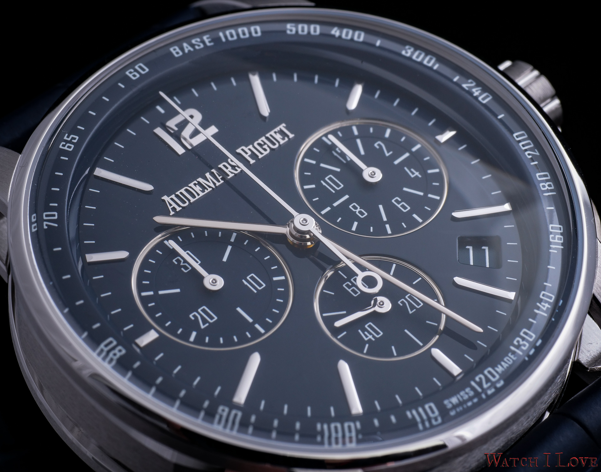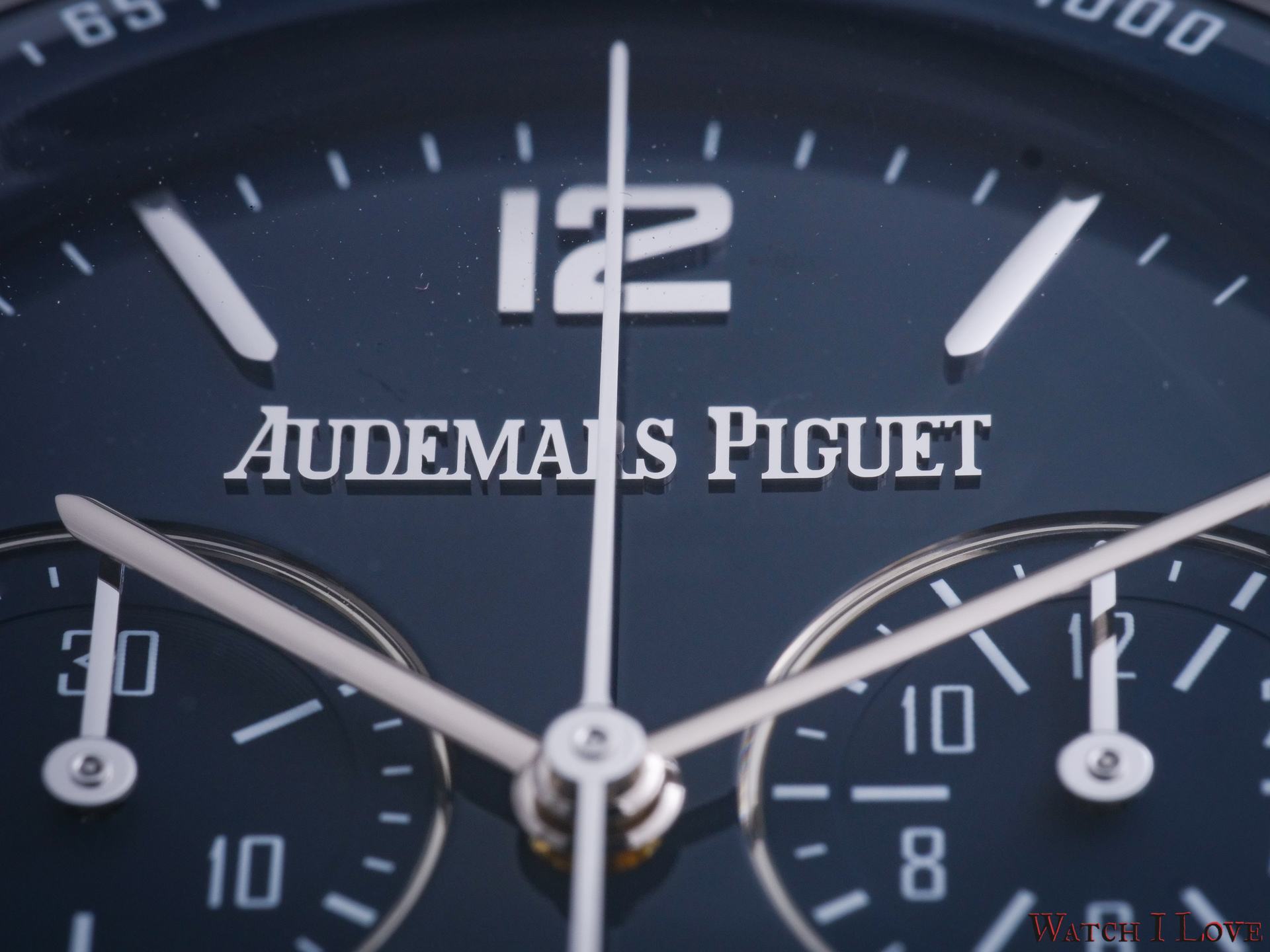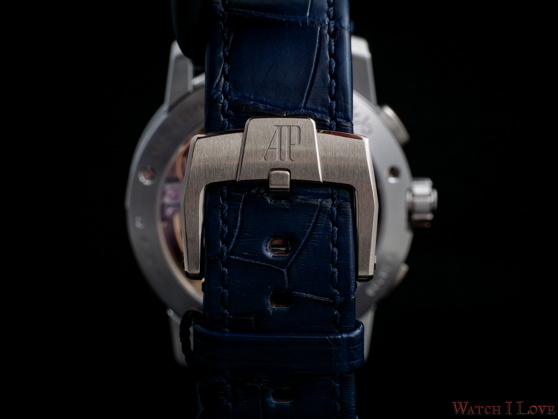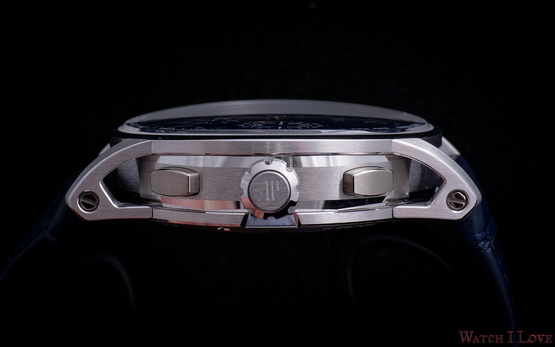 The chronograph pushers have a beautiful shape with satin-brushed surfaces and polished beveling. The crown offers a solid grip. Again, a lovely combination of brushed and polished surfaces adorn the crown. The AP logo engraved in the brushed background makes a good impression.