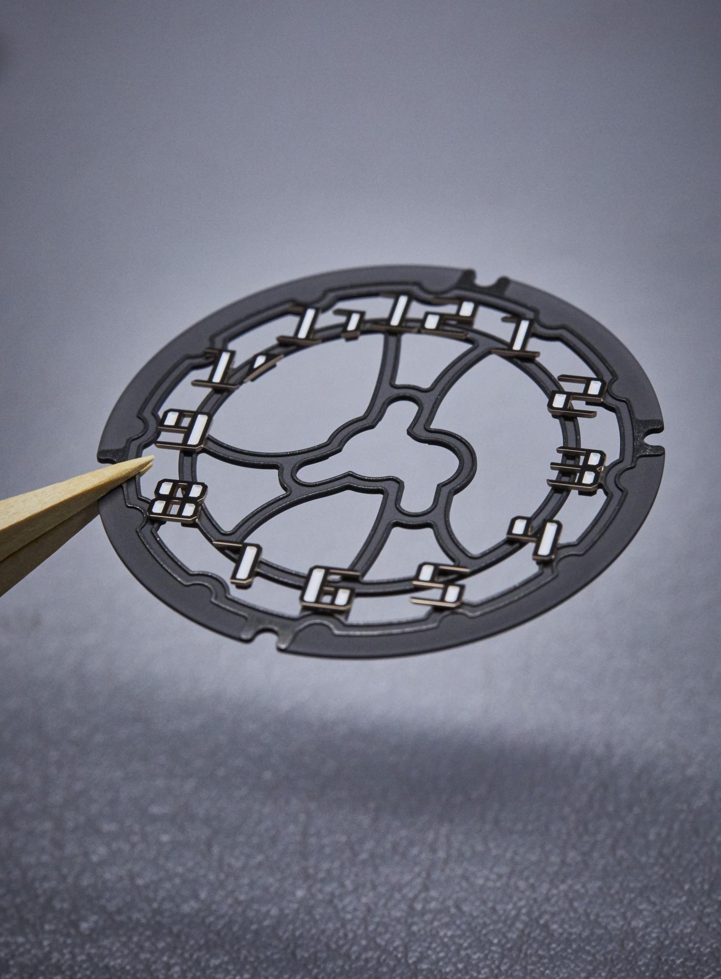Manufacturing these components in grade 5 titanium treated with Titalyt® for the baseplate and black PVD coating for the bridges confers great rigidity on the entire assembly and ensures the precise surface flatness essential for perfect functioning of the gear train as well as stability of the movement.