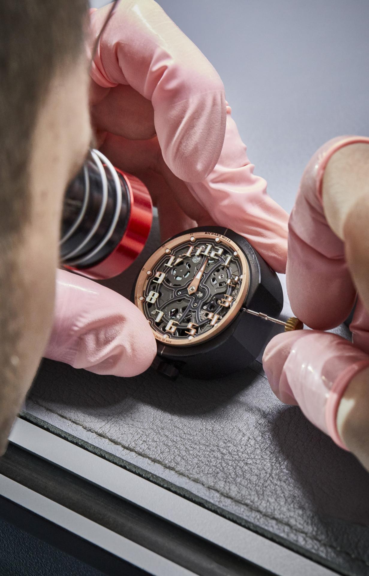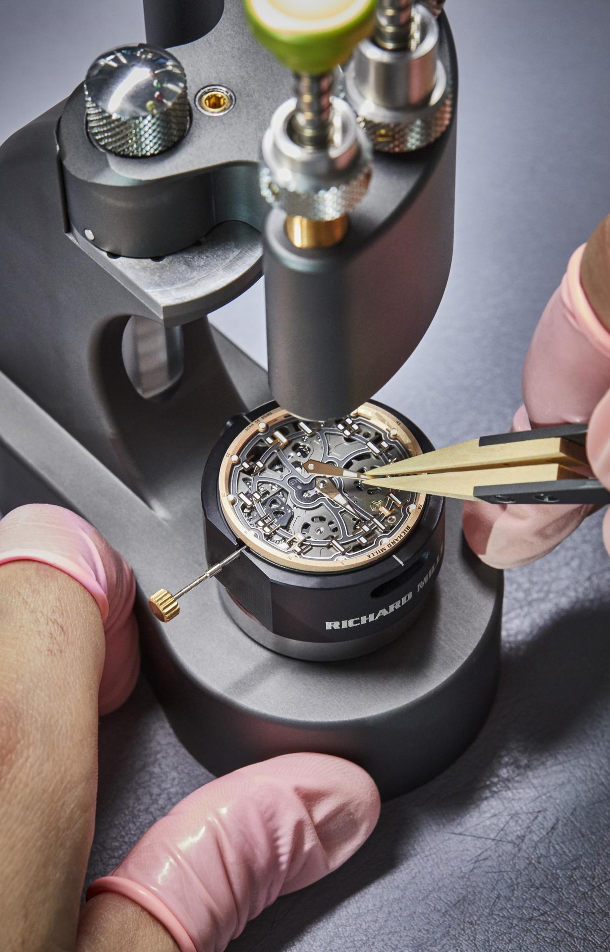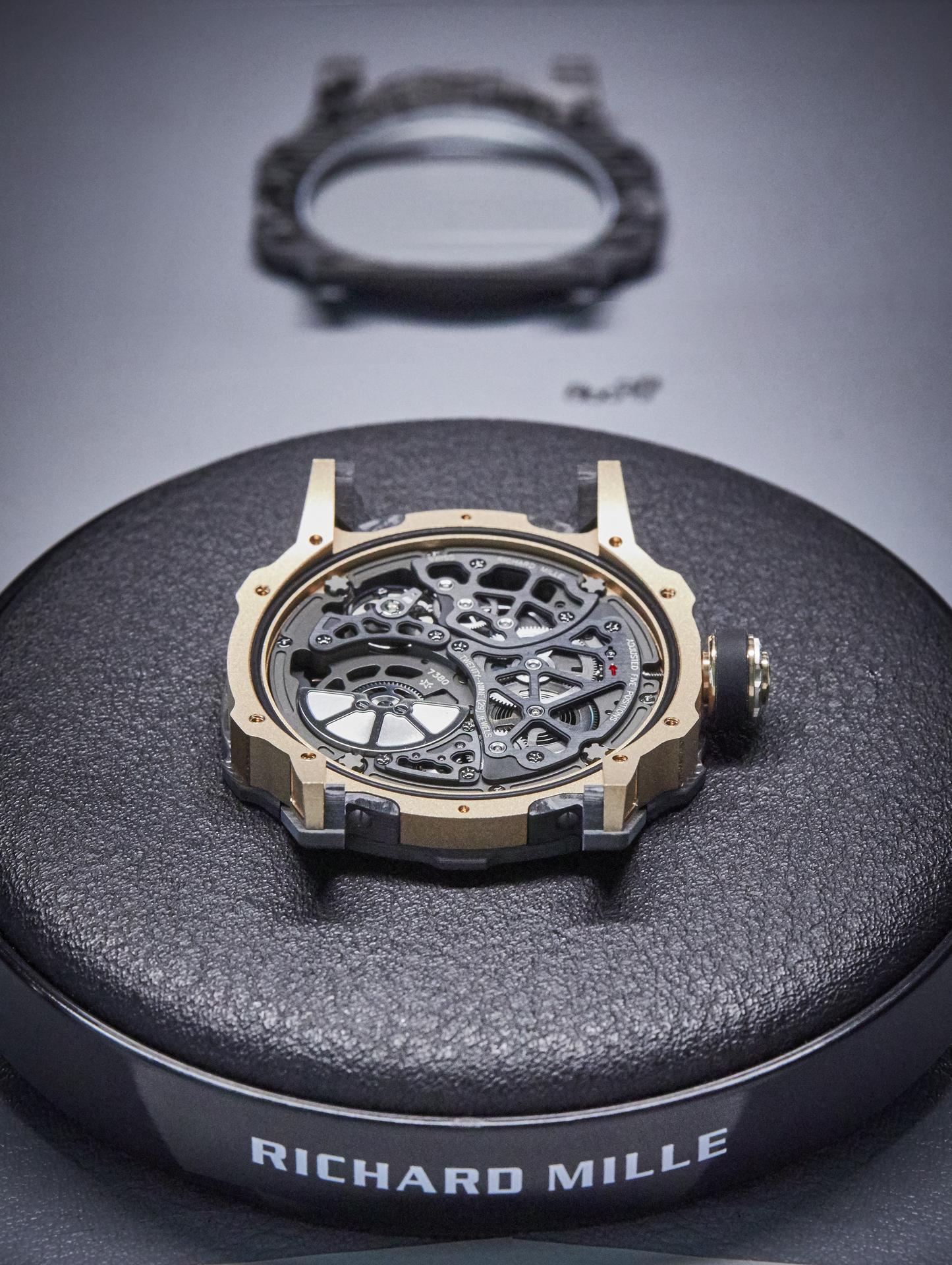Heated to 120 °C in an autoclave similar to those used for aeronautic components, the material is then ready to be machined at Richard Mille. During this phase, the many layers of Carbon TPT® are revealed, creating random patterns that make each piece unique. The caseband is in 5N red gold.