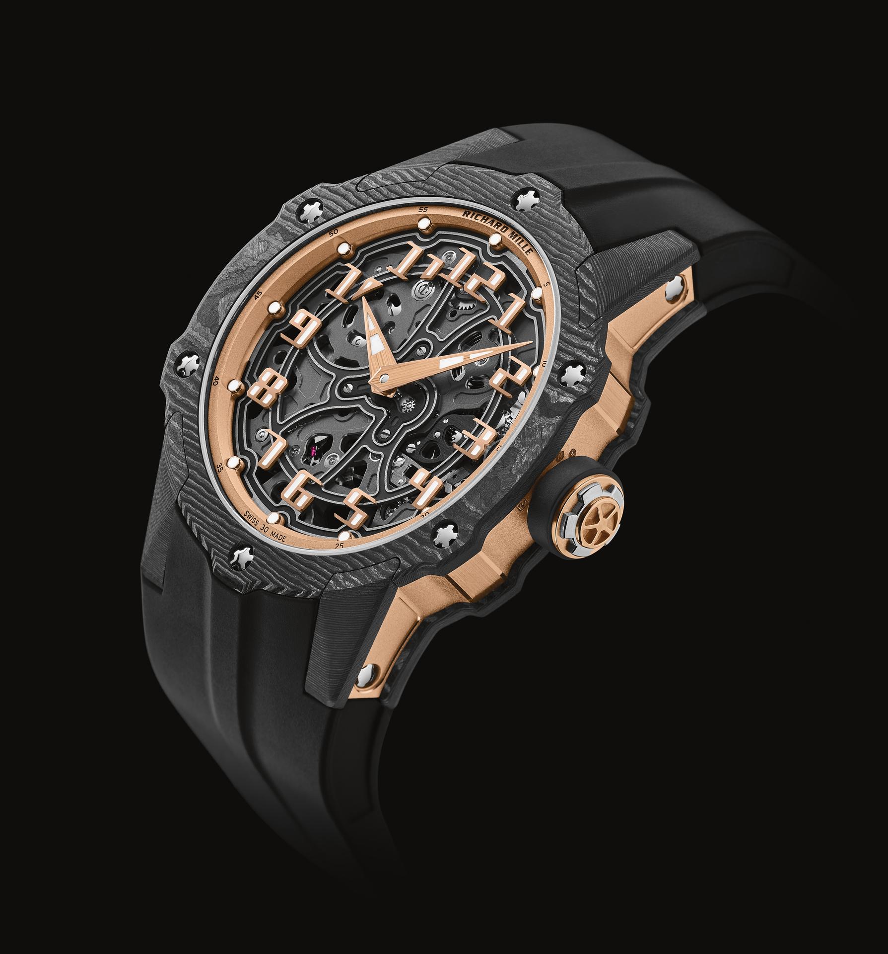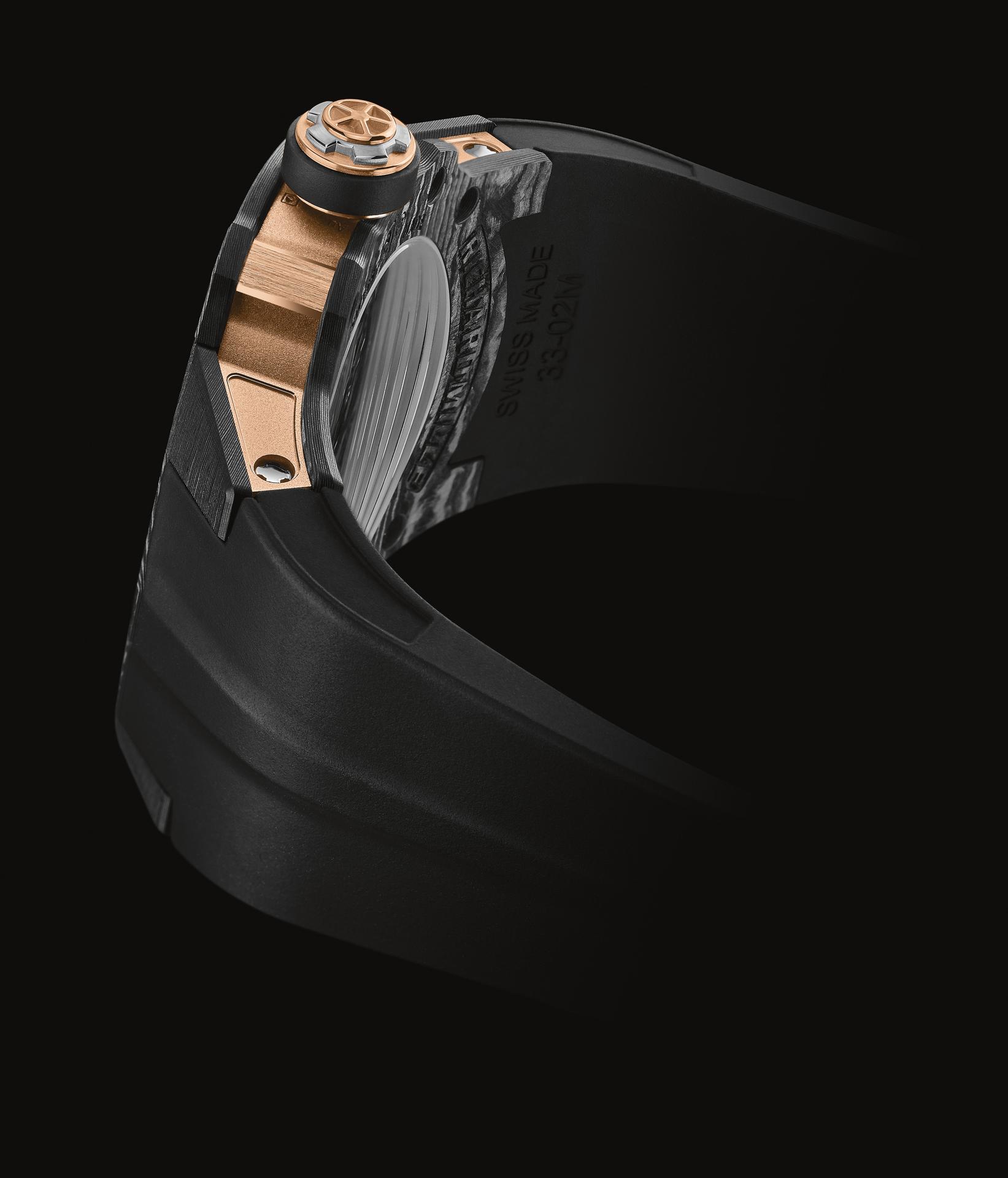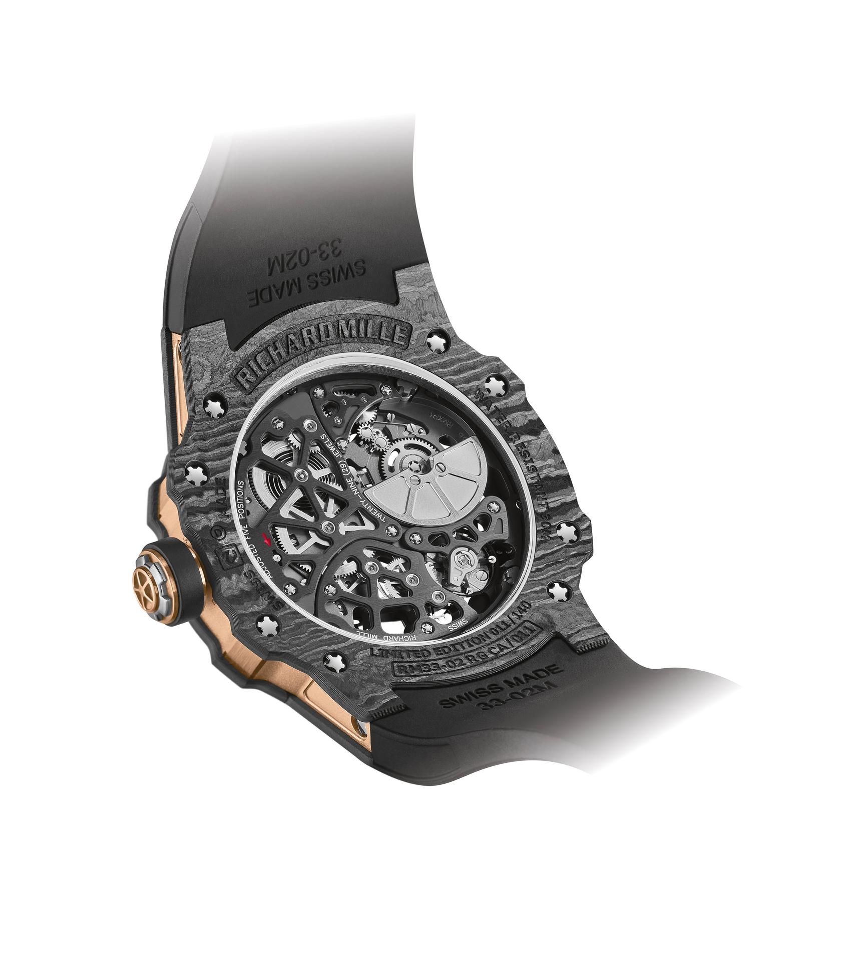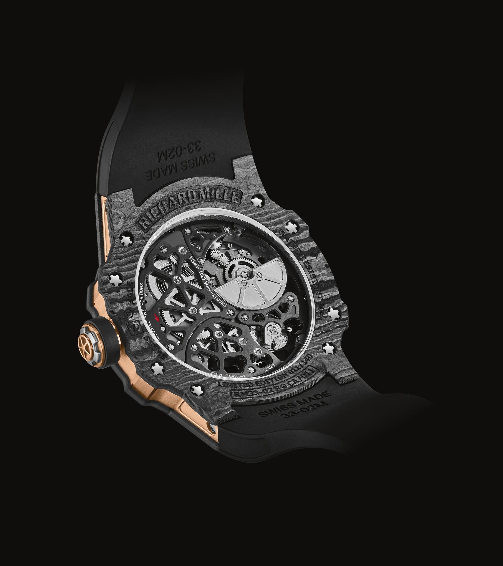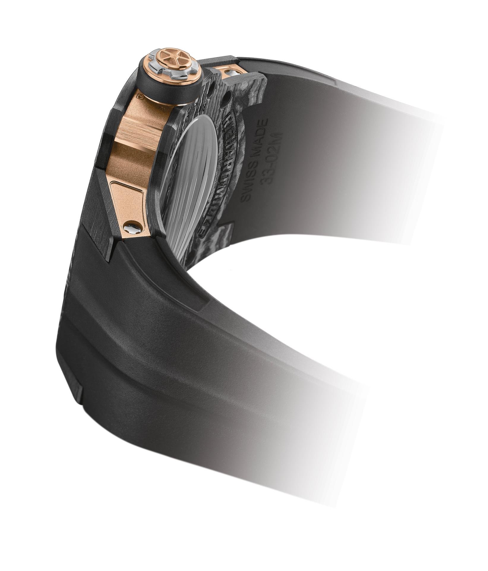 By juxtaposing soft gold with the strength of Carbon TPT®, and by combining the graphic codes of the lifestyle and sports spheres for both males and females, Richard Mille clearly communicates a desire to combine allegedly contradictory worlds within a single watch. The RM 33-02 Automatic is available as a limited edition of 140 timepieces.