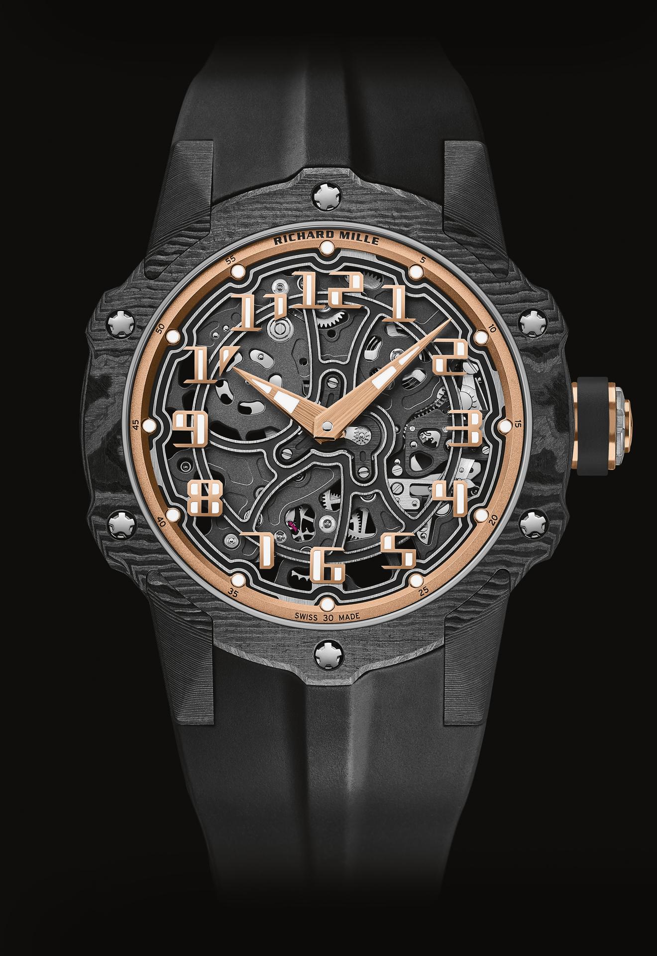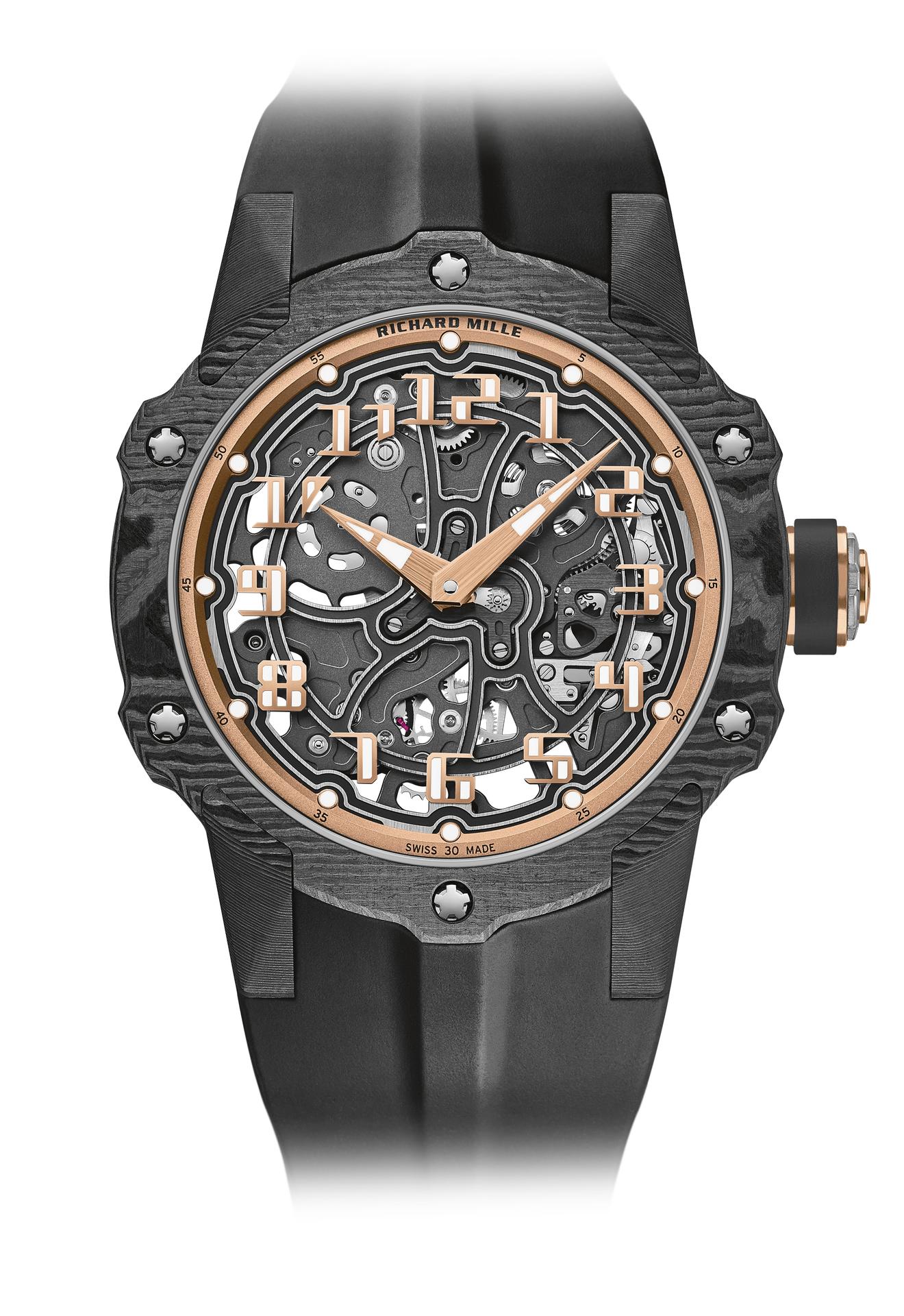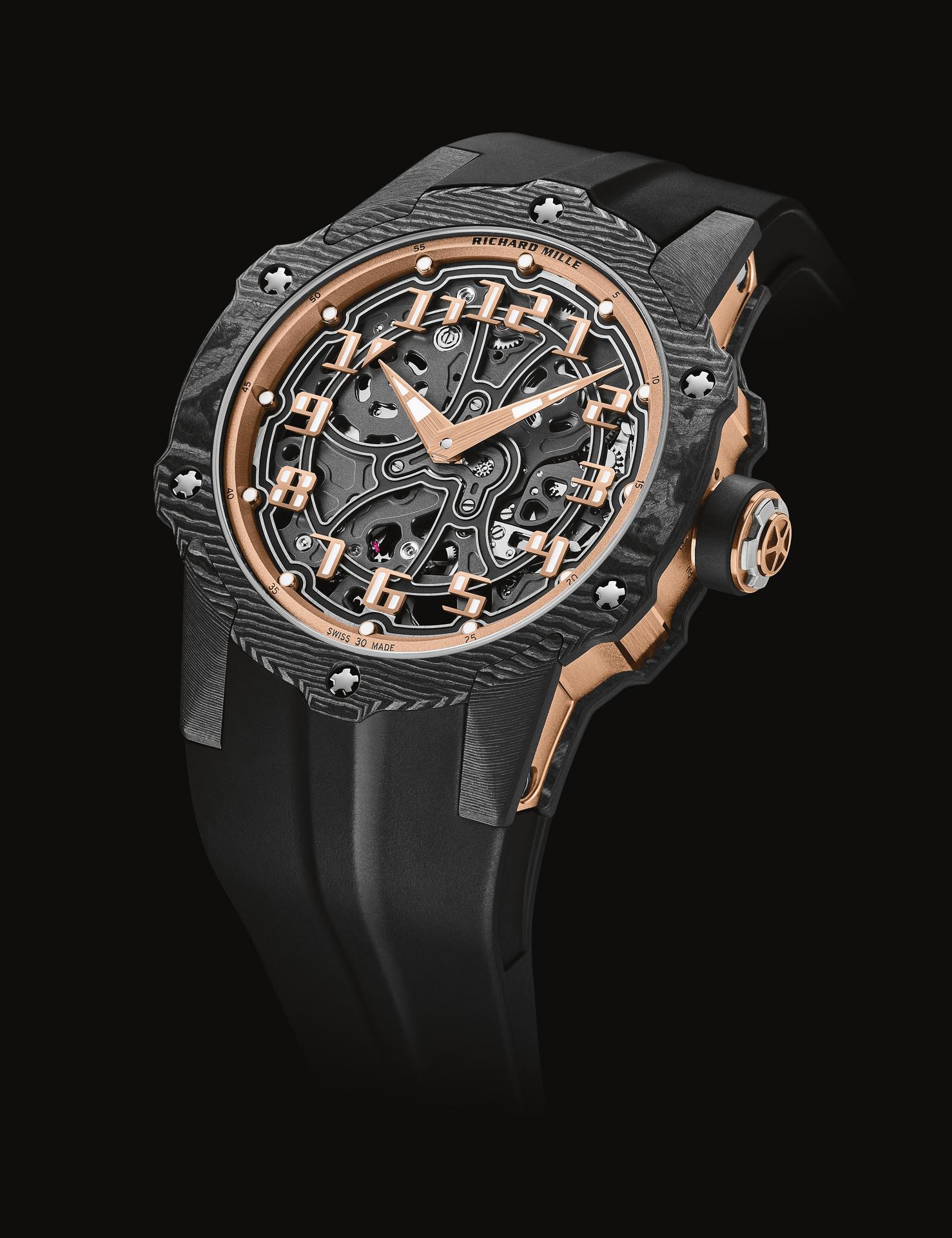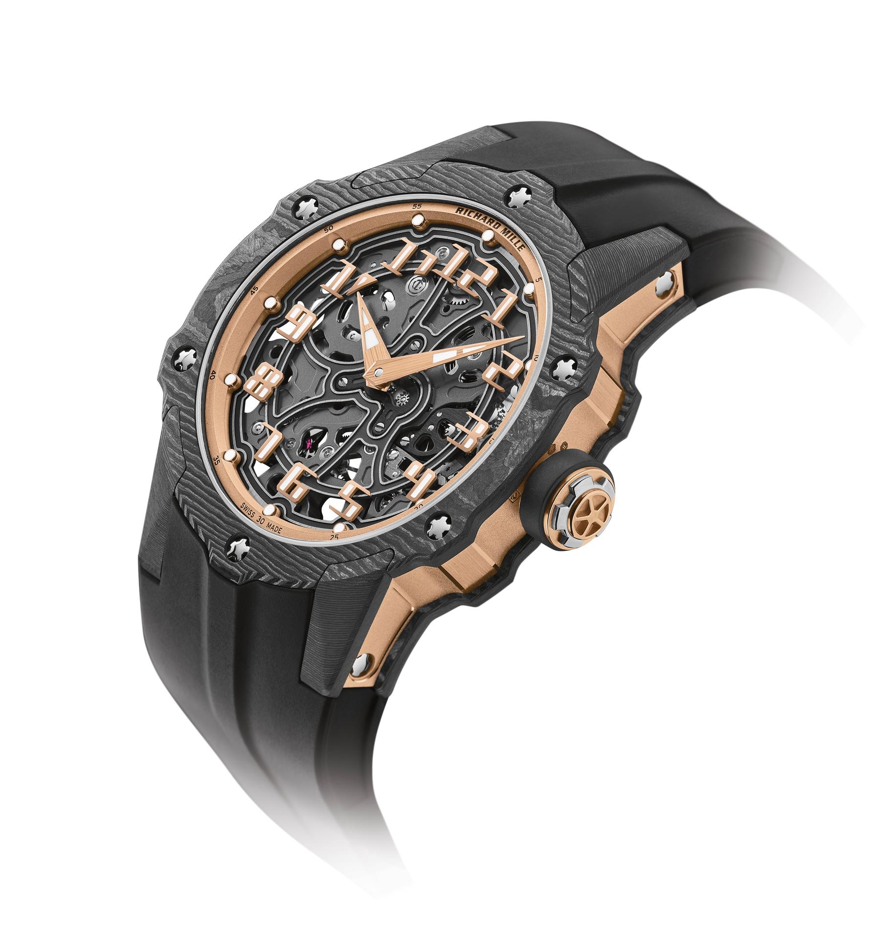 By juxtaposing soft gold with the strength of Carbon TPT®, and by combining the graphic codes of the lifestyle and sports spheres for both males and females, Richard Mille clearly communicates a desire to combine allegedly contradictory worlds within a single watch. The RM 33-02 Automatic is available as a limited edition of 140 timepieces.