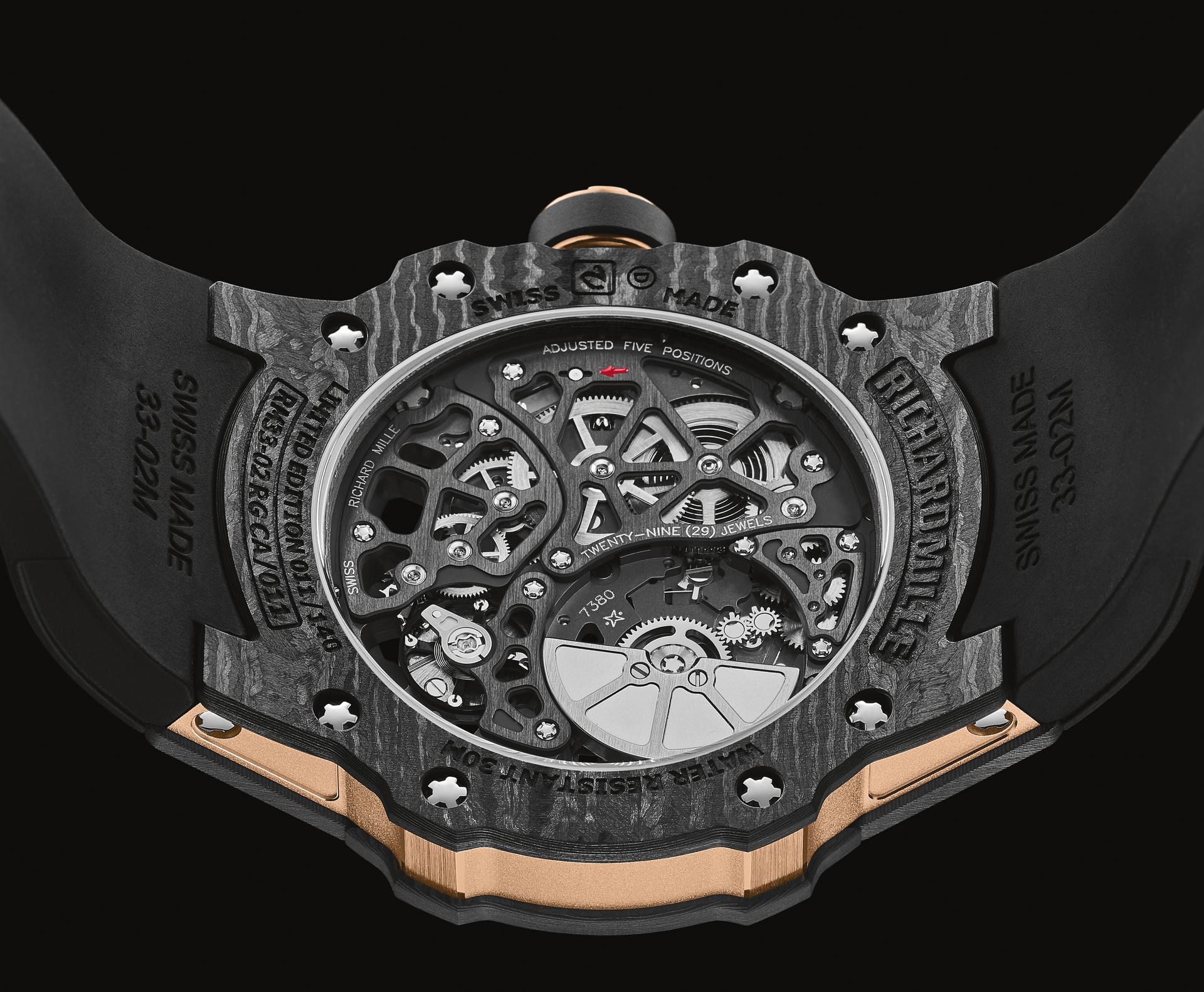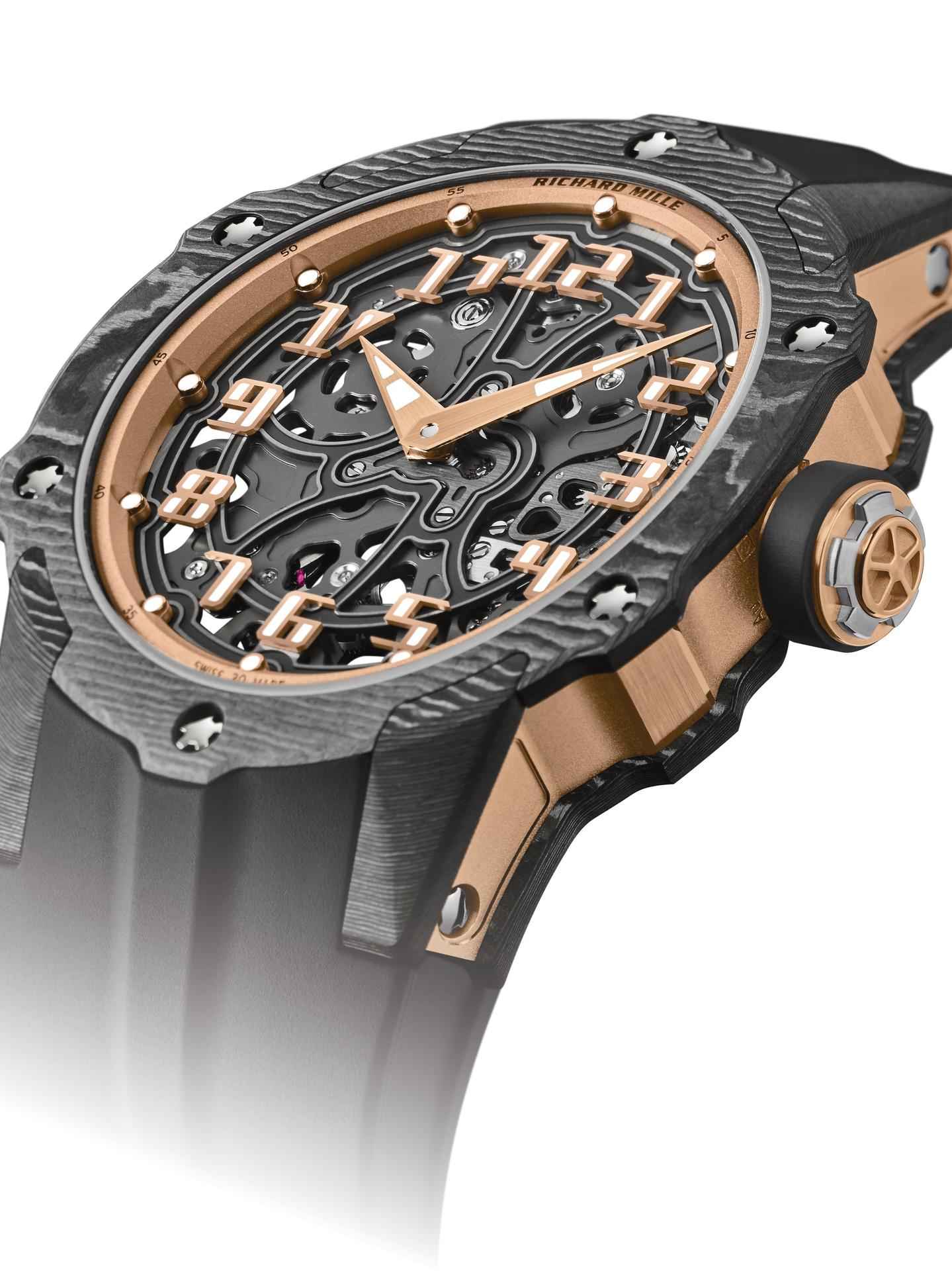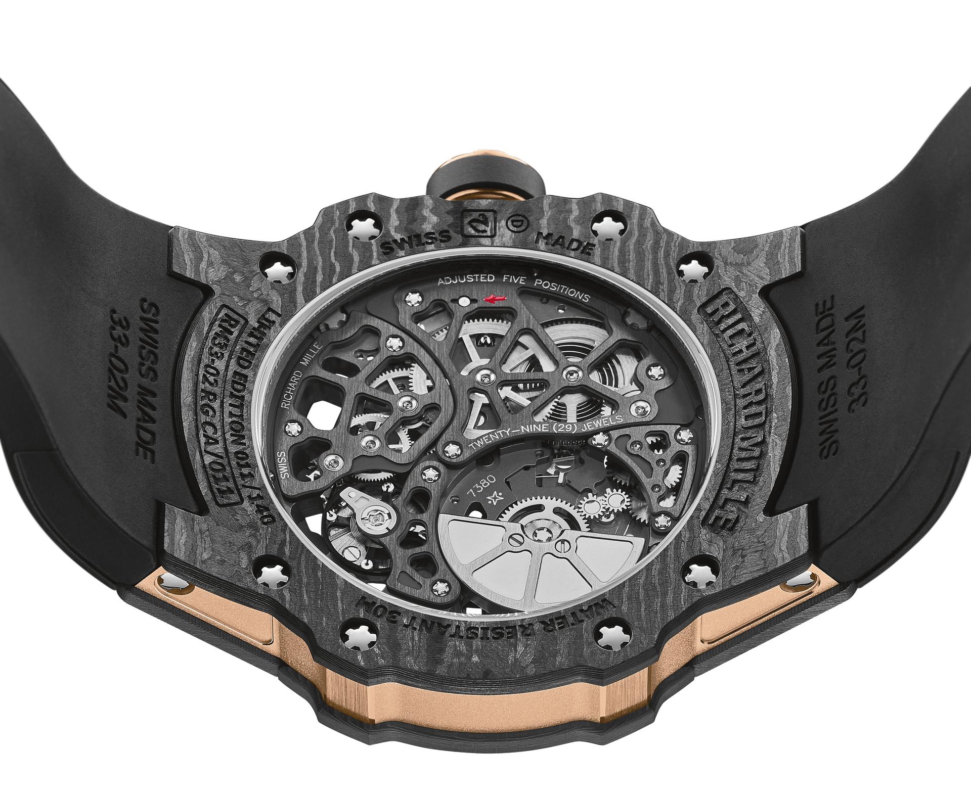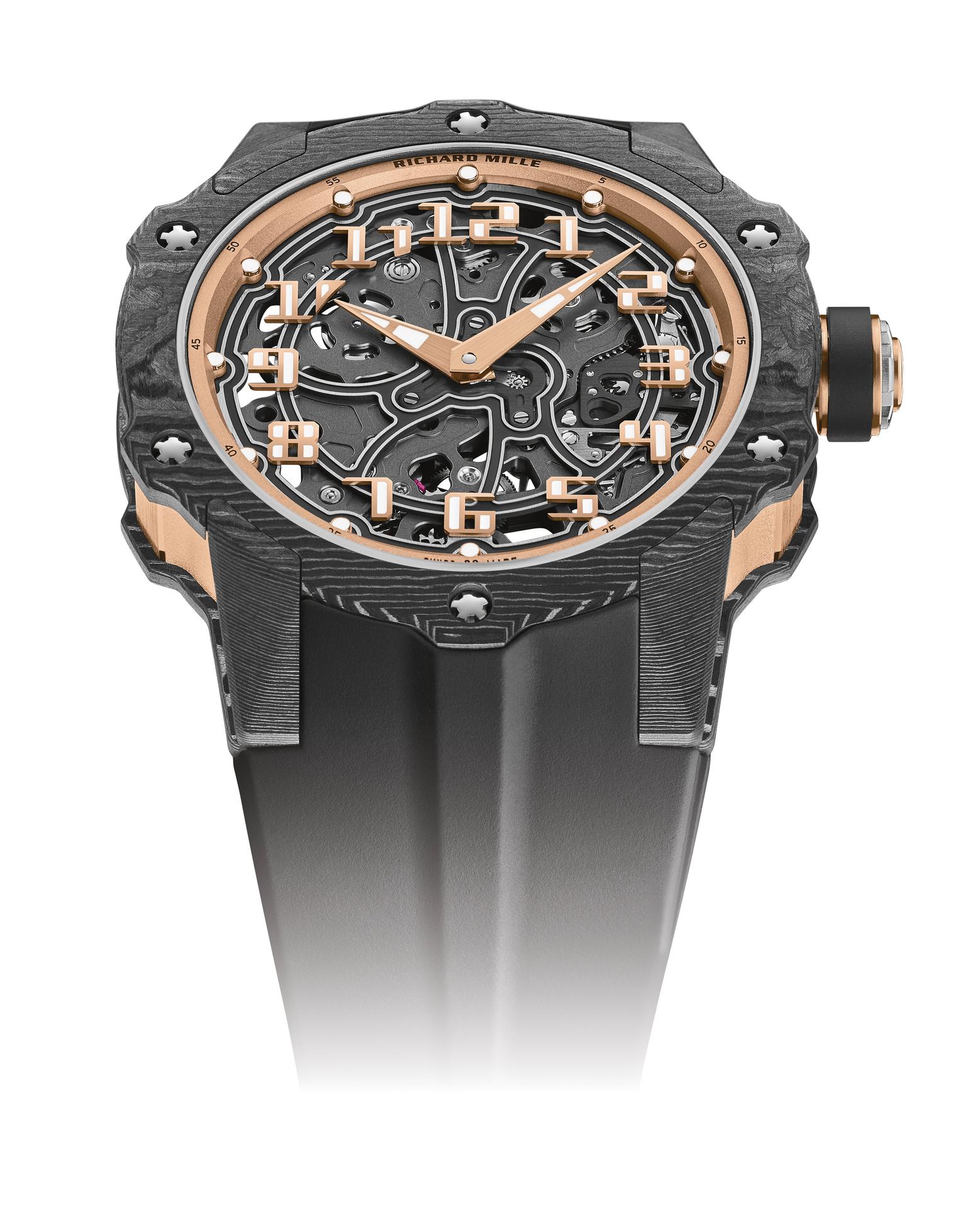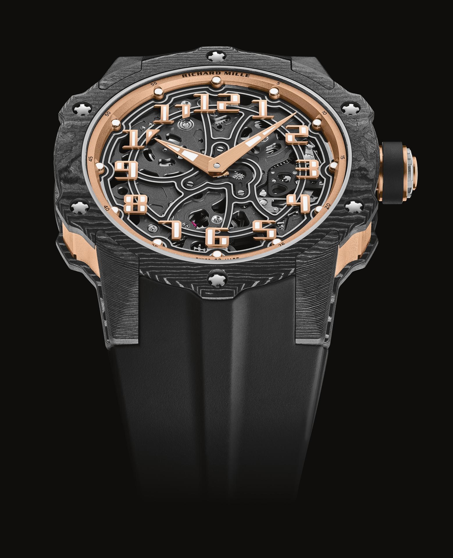By juxtaposing soft gold with the strength of Carbon TPT®, and by combining the graphic codes of the lifestyle and sports spheres for both males and females, Richard Mille clearly communicates a desire to combine allegedly contradictory worlds within a single watch. The RM 33-02 Automatic is available as a limited edition of 140 timepieces.