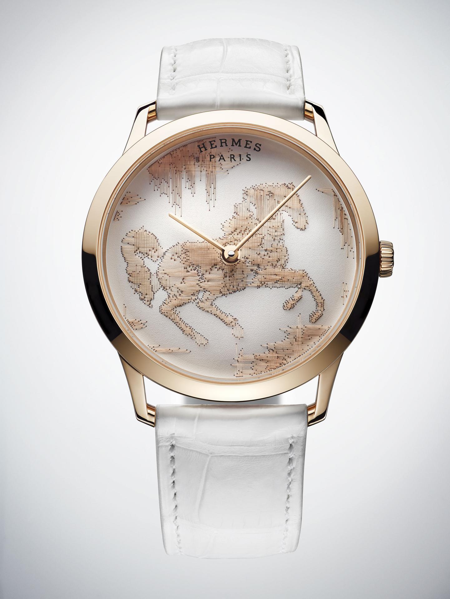 Framed by a fine gold case, the Slim d’Hermès lends its refined design to the art of Ikat weaving. Slim d’Hermès Cheval Ikat: against a white or blue background, its dial embroidered with gold threads reveals the graceful curves of a galloping horse.