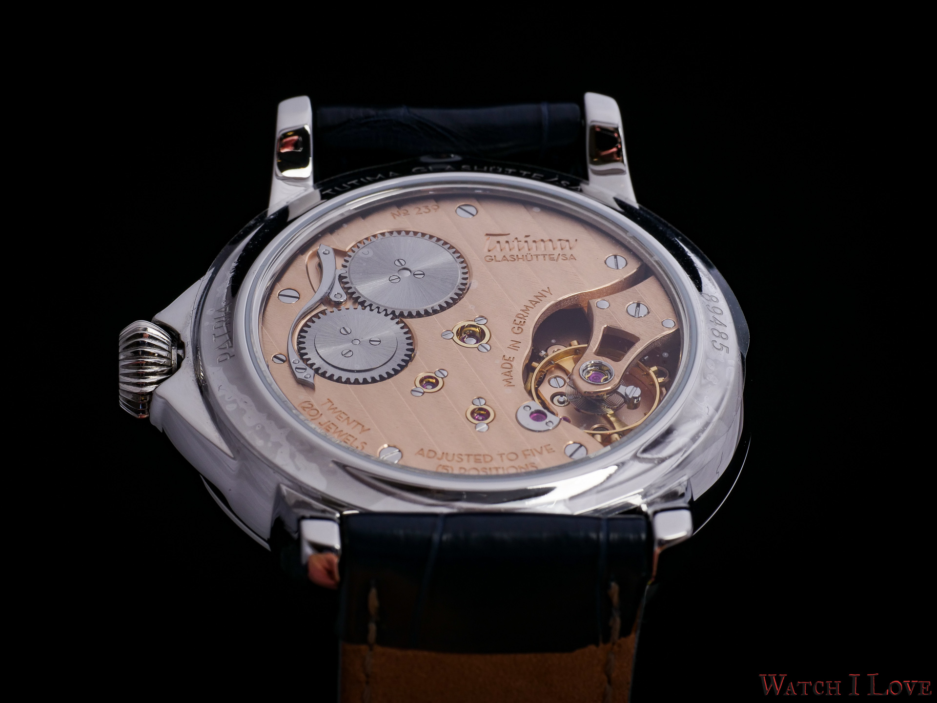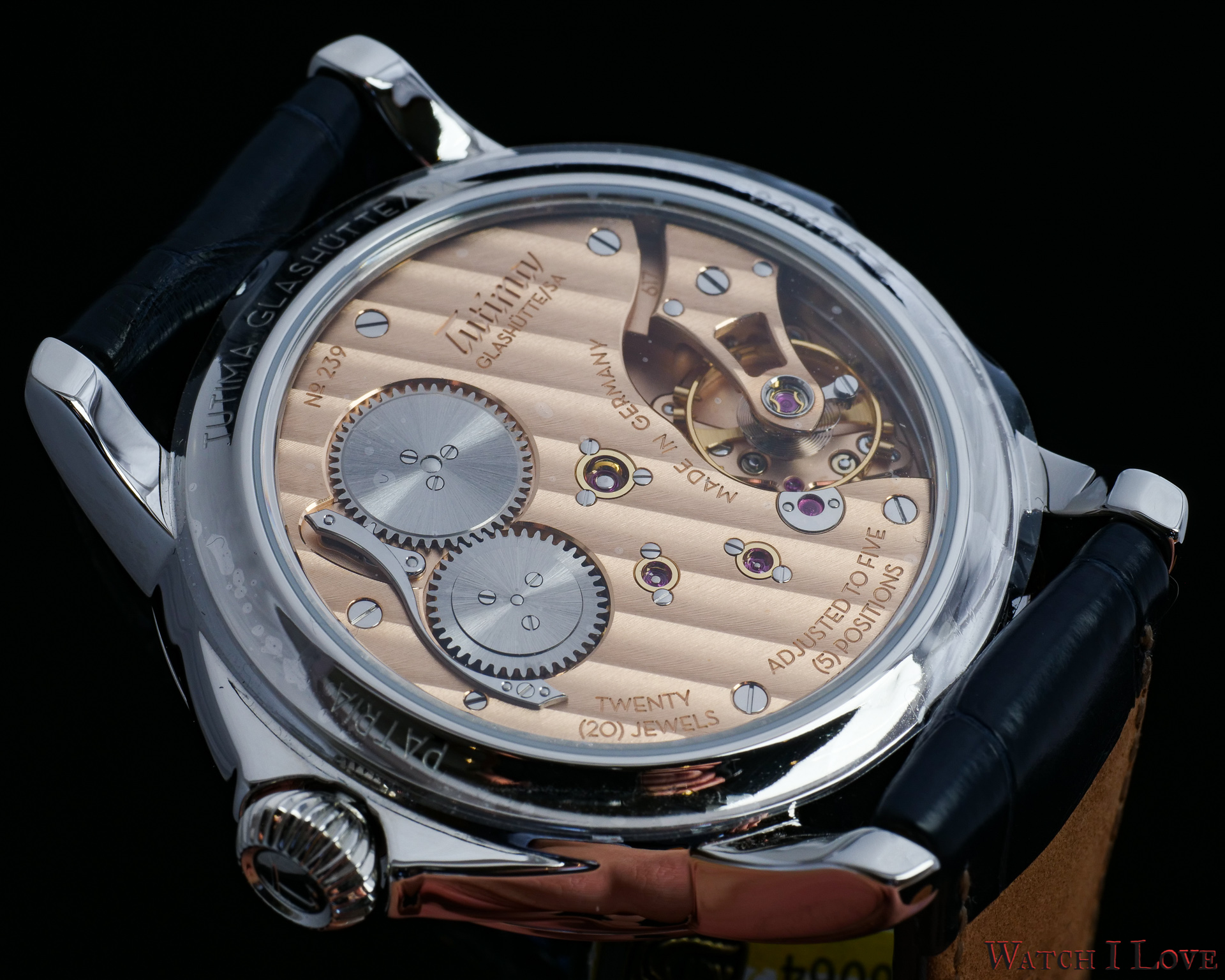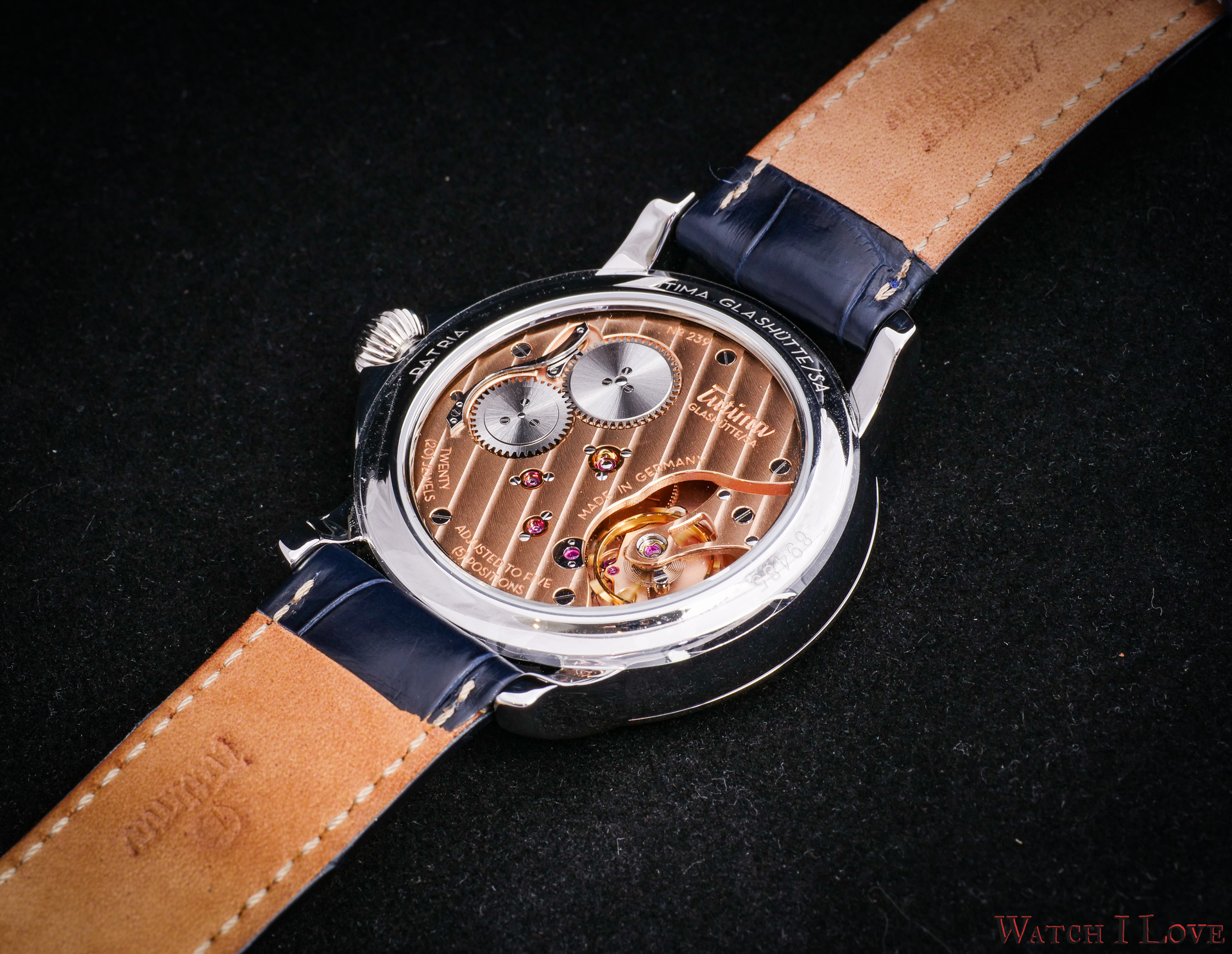 The movement is gold plated, adding a warm contrast to the back view. The Calibre 617 is beautifully decorated. The Glashütte waves (stripes) give a new dimension to the large plate.