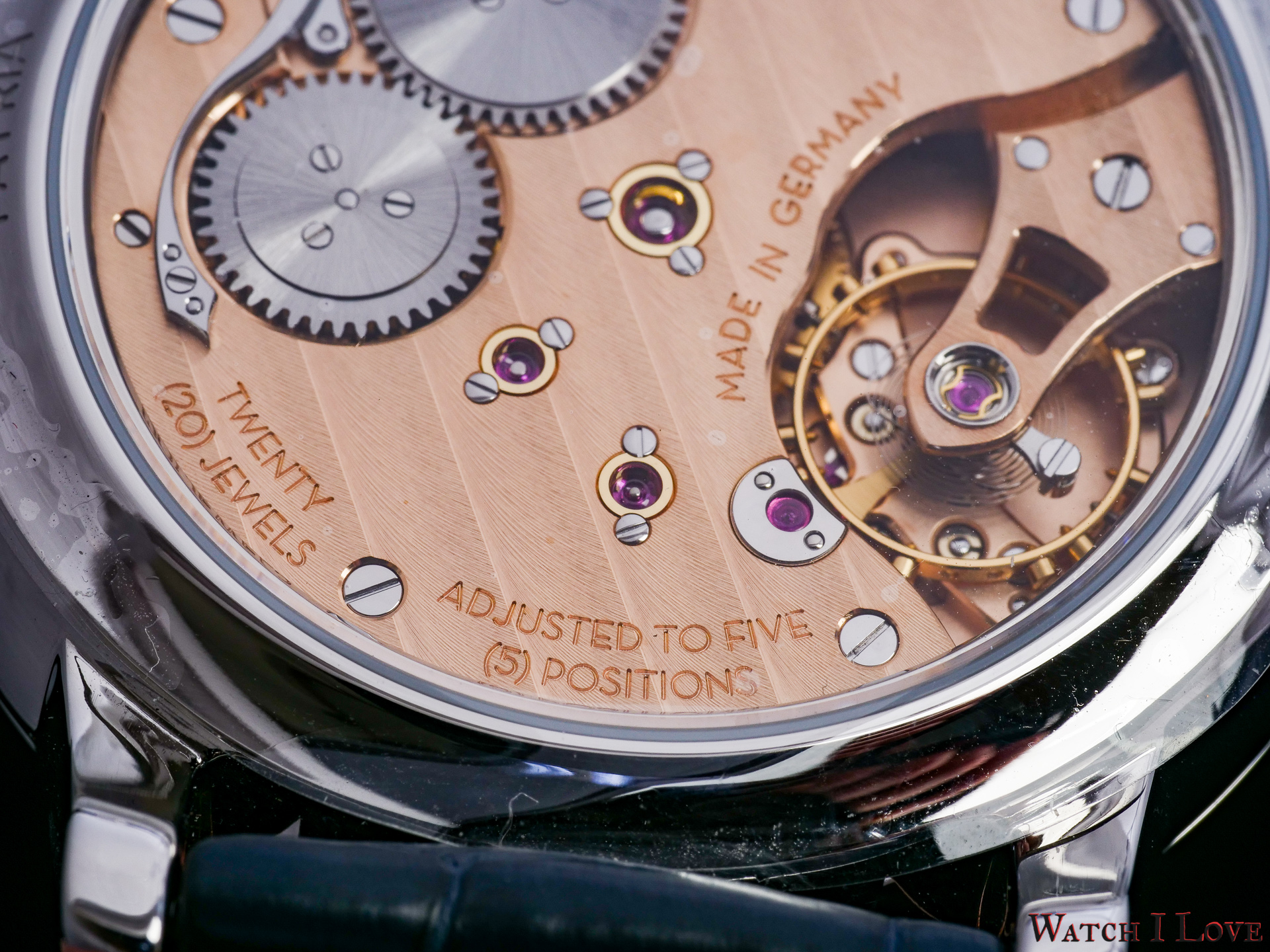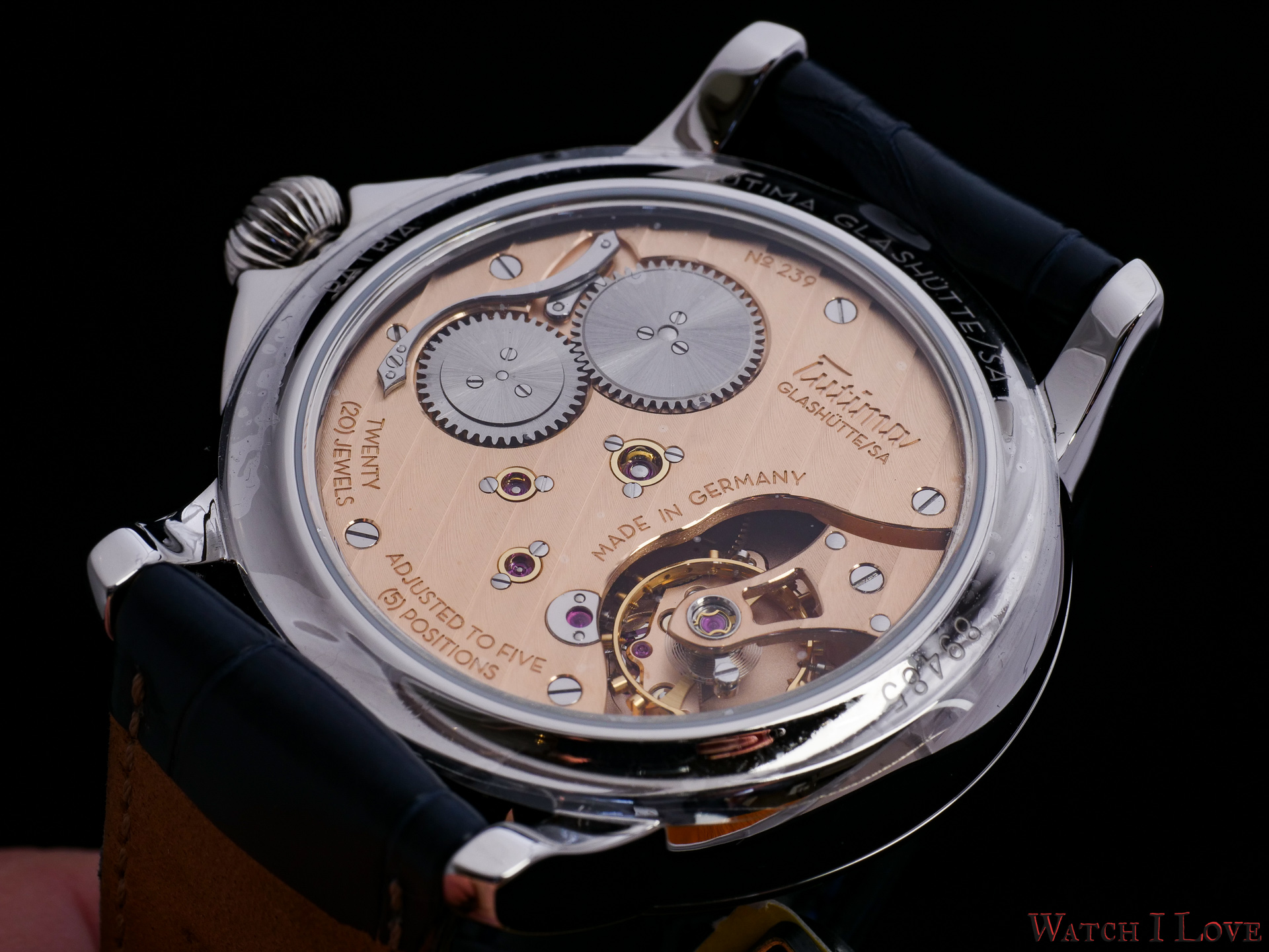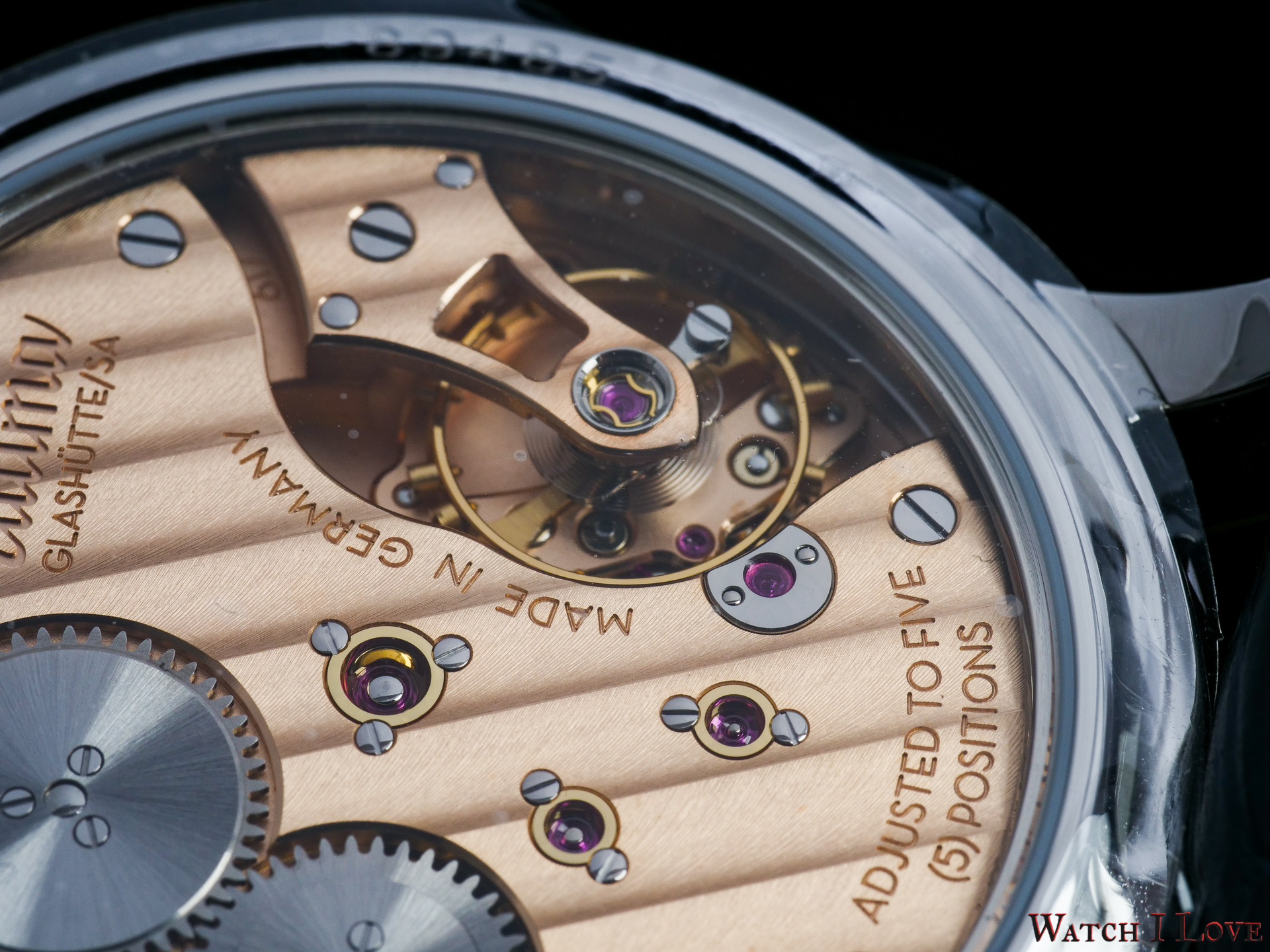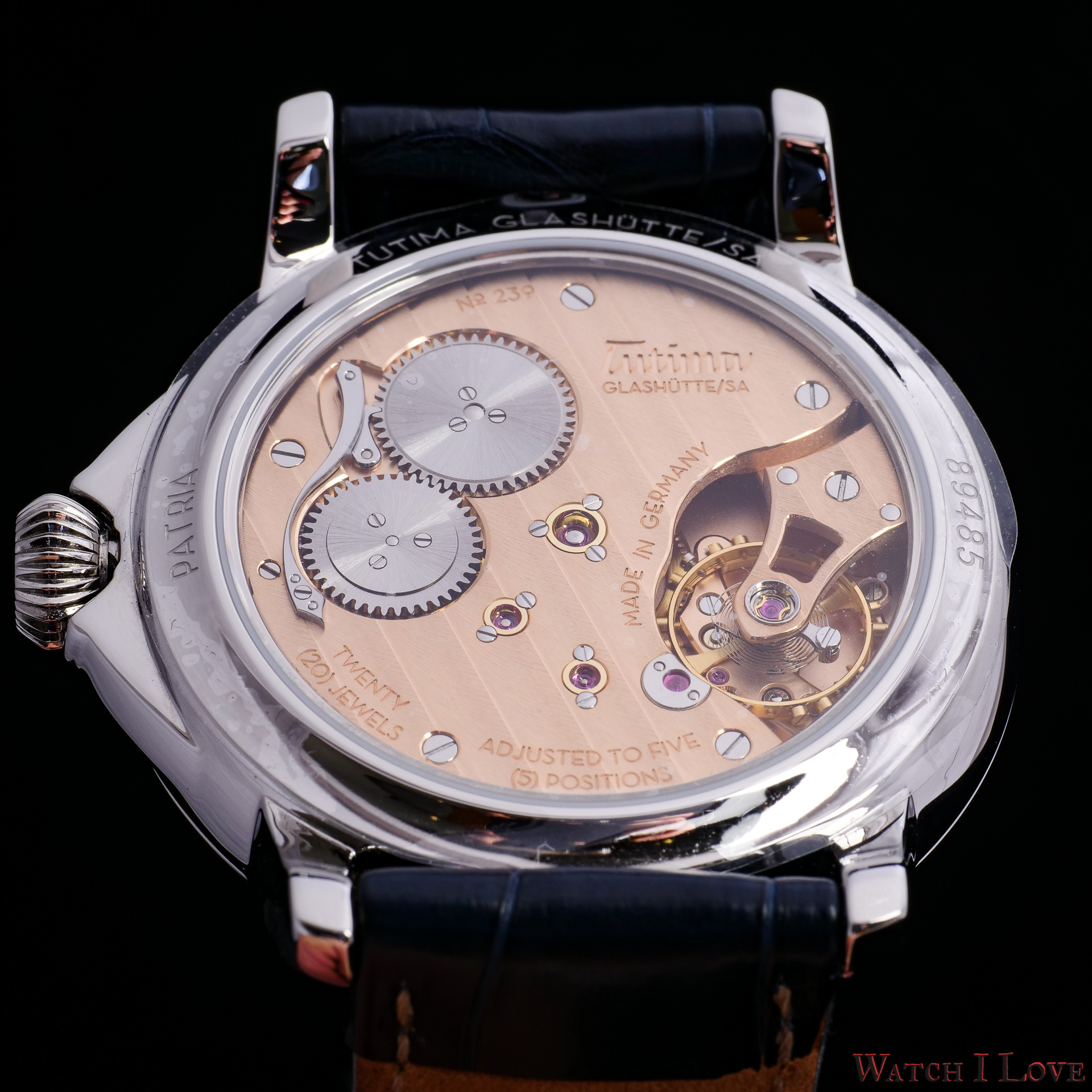 The movement is gold plated, adding a warm contrast to the back view. The Calibre 617 is beautifully decorated. The Glashütte waves (stripes) give a new dimension to the large plate.
