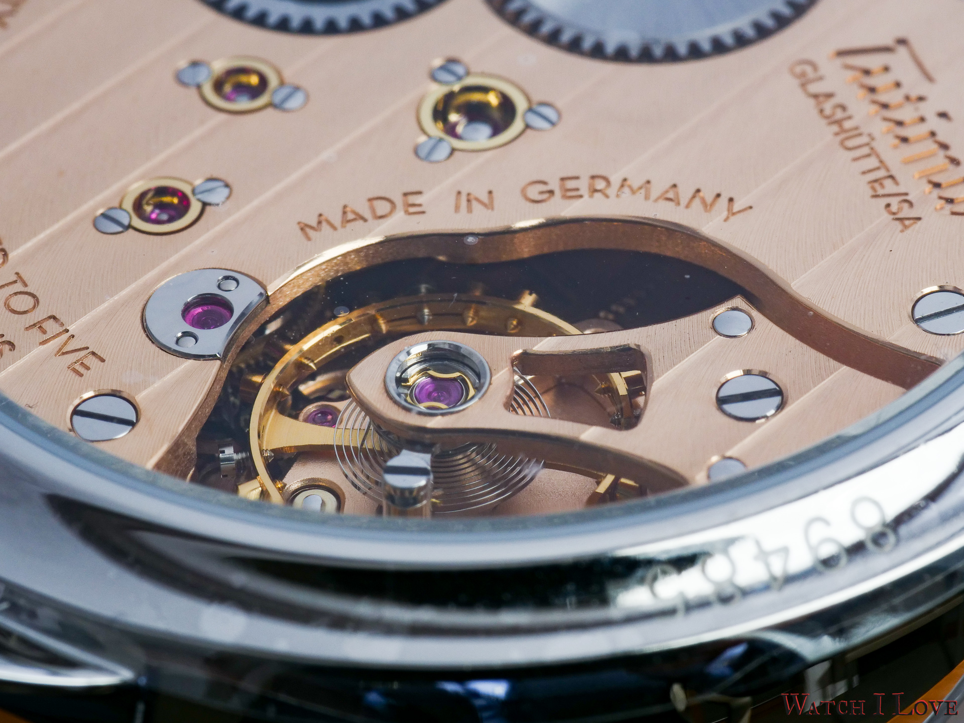 The gold chatons with mirror polish sinks complete the Glashütte specific look. Other ornamental mentions will be the sublime anglage (beveling/chamfering – straight at the barrel gear side, rounded on the balance wheel side), polished screws, satin-finished mainplate.