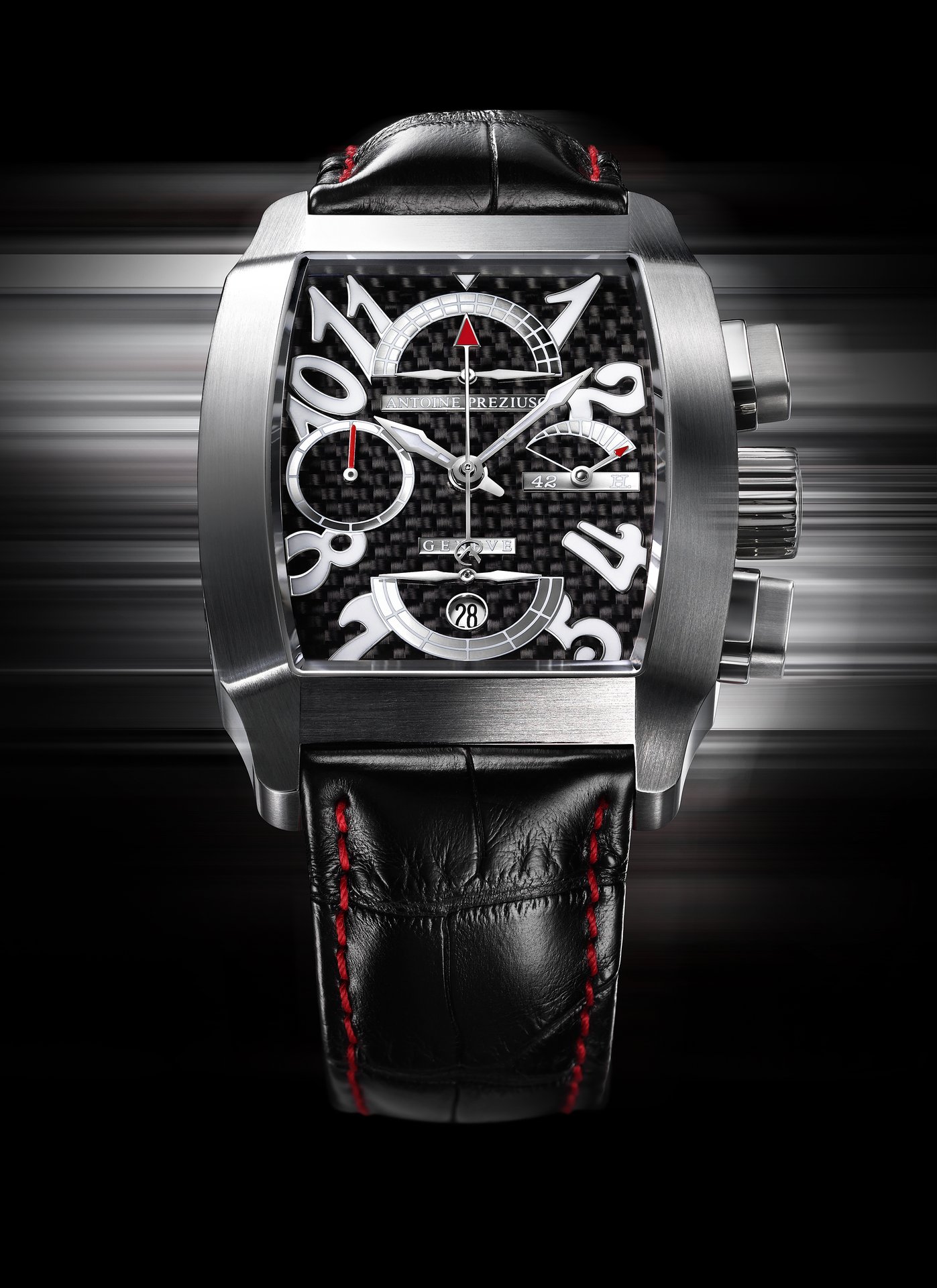Framed by a rugged cambered rectangular steel case the distinctive black carbon fibre dial forms the ideal backdrop for staging an astonishing set of features. The applied oversized, sloping Arabic numerals have become a trademark on certain models by Antoine Preziuso Genève. In this configuration, they are replaced at 12, 3, 6 and 9 o’clock by four “displays with a difference”. Along the horizontal axis, the small seconds sub dial at 9 o’clock is counterbalanced by the 42-hour power-reserve indicator with its pointer moving steadily across a segment to keep track of the state of winding of the watch.