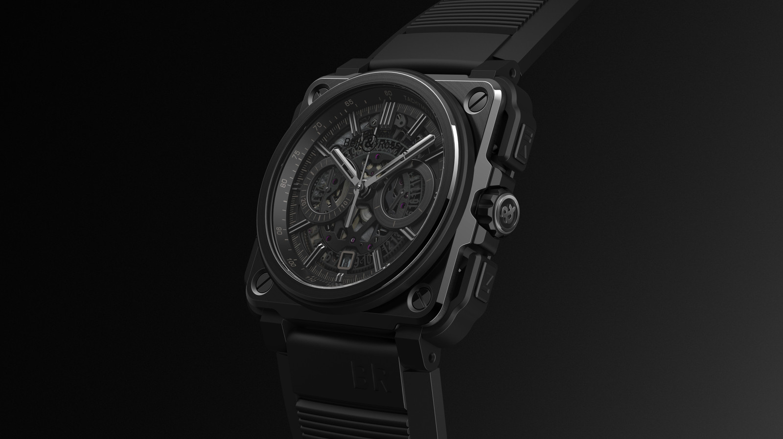 The black-themed Bell & Ross BR-X1 Phantom comes in a light 45 mm diameter brushed titanium case that was treated with a ceramic layer. Using PVD – physical vapour deposition, the resistance to scratches and any other chemical influences is increased.