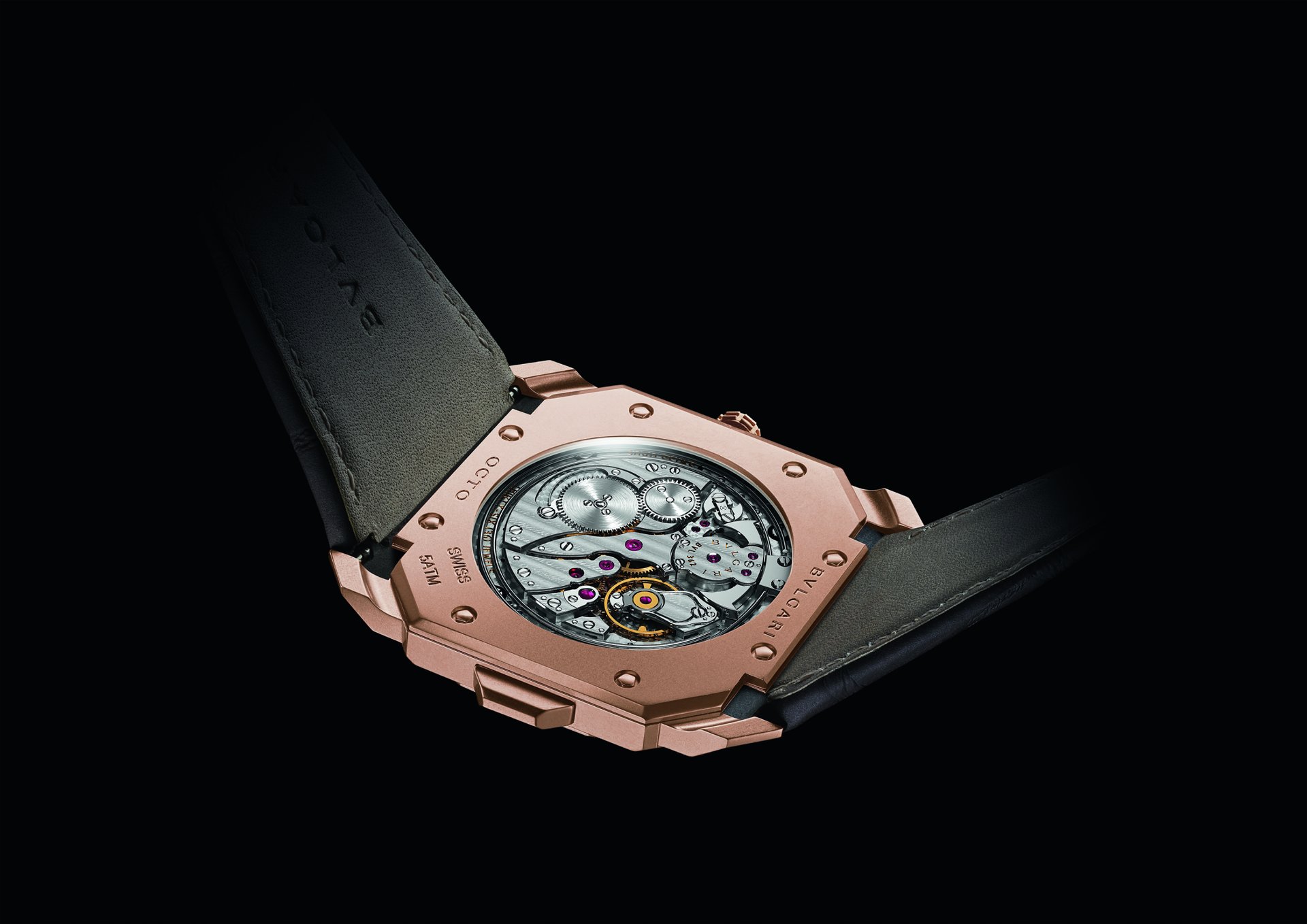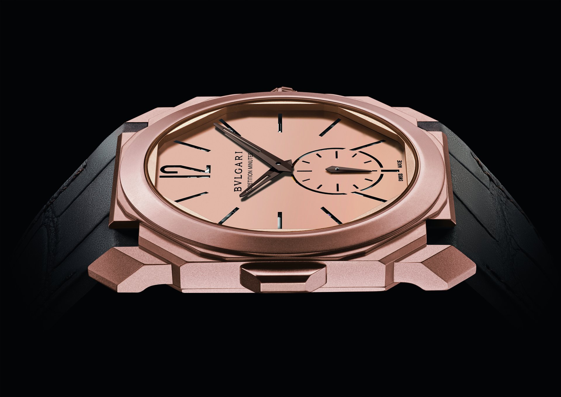 One highlight of Dubai 2020 is the new Octo Finissimo Minute Repeater in rose gold, powered by the ultra-thin 3.12mm Mechanical Manufacture Minute Repeater movement with manual winding, BVL 362 caliber. A new edition of the record-breaking Octo Finissimo Minute Repeater in titanium that first debuted in 2016, the original embodied a paradigm shift in terms of slenderness and laid the foundations of a new approach to mechanics and to classic complications, while preserving the legendary status of Bvlgari watches, and cultivating the finest watchmaking traditions. The minute repeater is indeed the most complex of all horological complications — and this model in sandblasted rose gold is an impeccable feat of technical and aesthetic expertise; the dial’s hour-markers have an incised, cut-out design as too does the small seconds counter at 6 o’clock: the openings serve to amplify resonance inside the case and thereby optimize the sound effect. The pusher activating the striking mechanism, fitted with an “all or nothing” safety device, is positioned on the case middle at 9 o’clock. This exceptional in-house developed and produced movement delivers a 42-hour power reserve once fully wound.