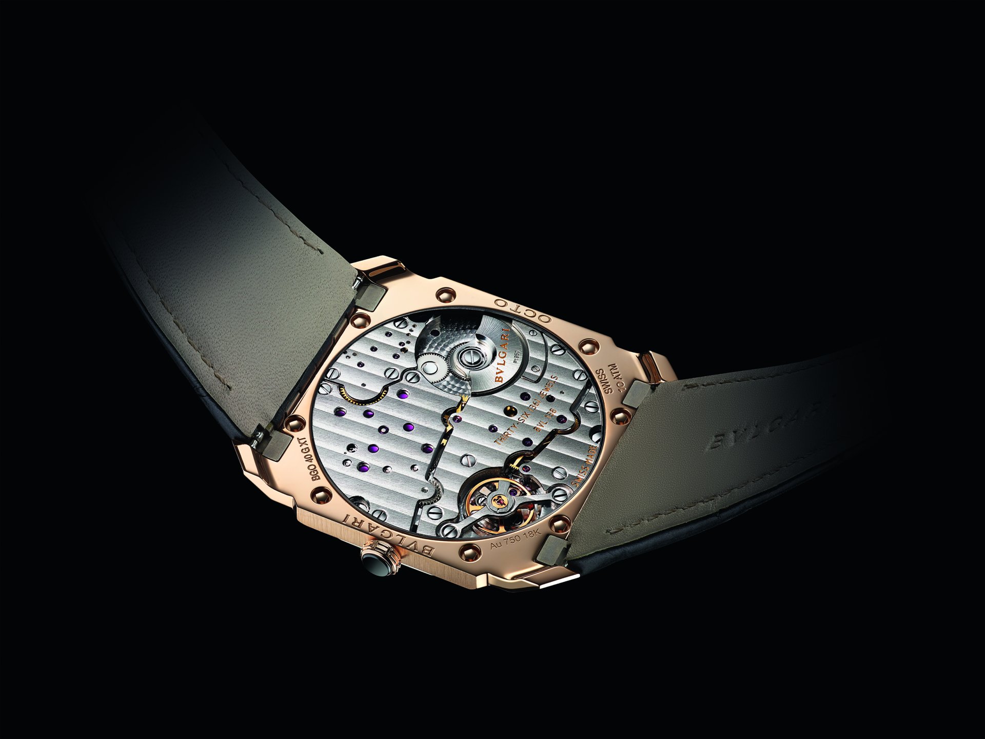 Mechanical Manufacture movement with automatic winding via a platinum micro-rotor, hours, minutes and small seconds indications. BVL138 Finissimo caliber adorned with Côtes de Genève motif, chamfered bridges and circular-grained baseplate, 60-hour power reserve, 21,600 vph, diameter: 36.60 mm, thickness: 2.23mm.