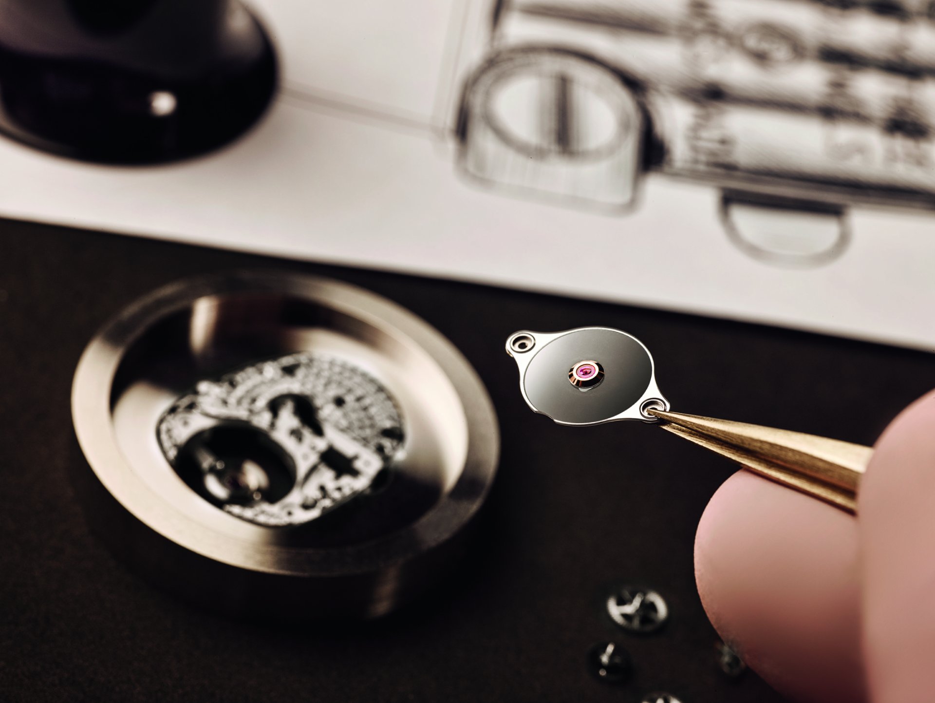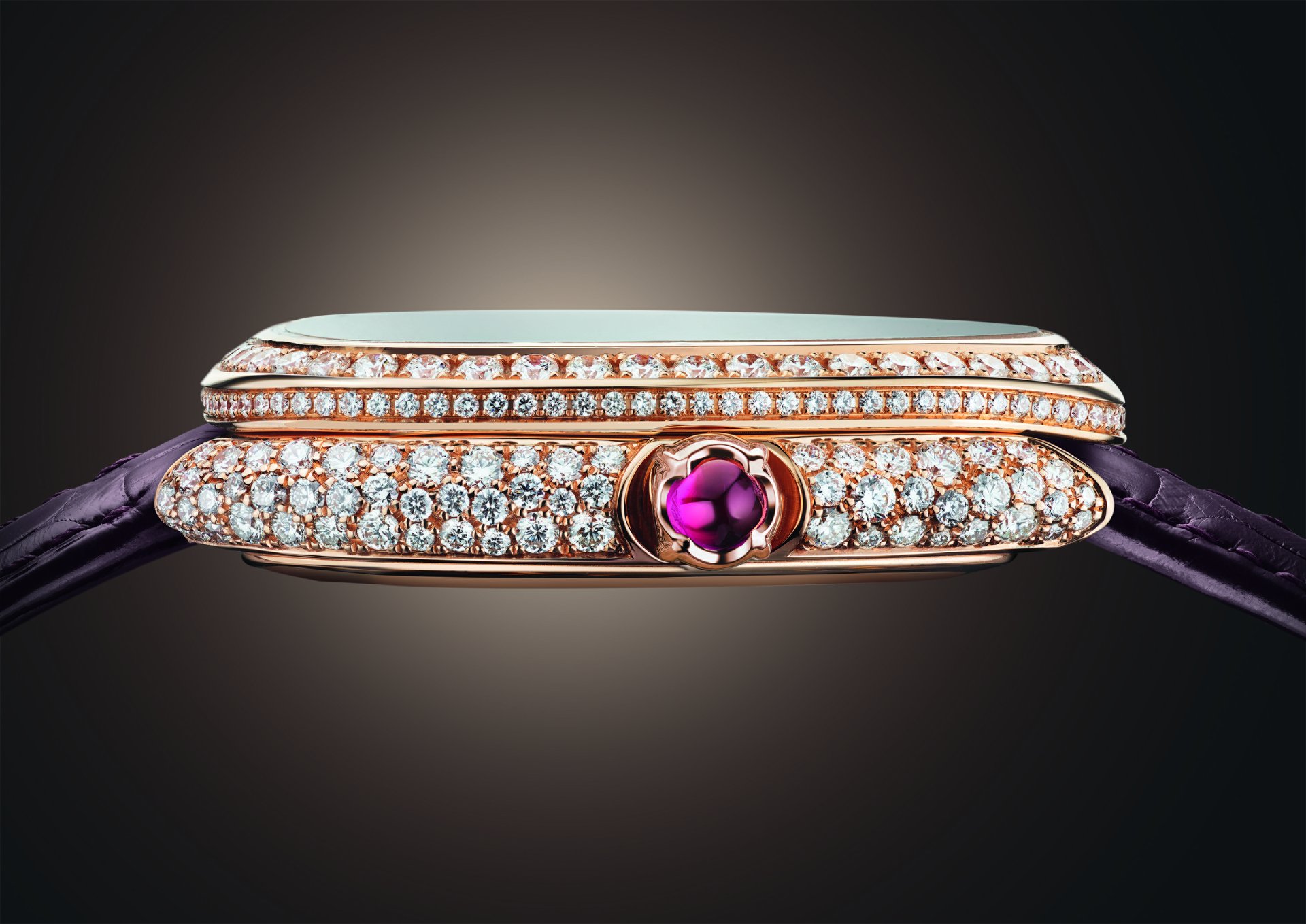 34mm 18kt rose gold case, full snow set with round brilliant-cut diamonds. 18kt rose gold crown set with a cabochon-cut ruby (~0.28 ct). Case thickness: 8.90mm. Water-resistant up to 30m. Dial full snow set with round brilliant-cut diamonds.
