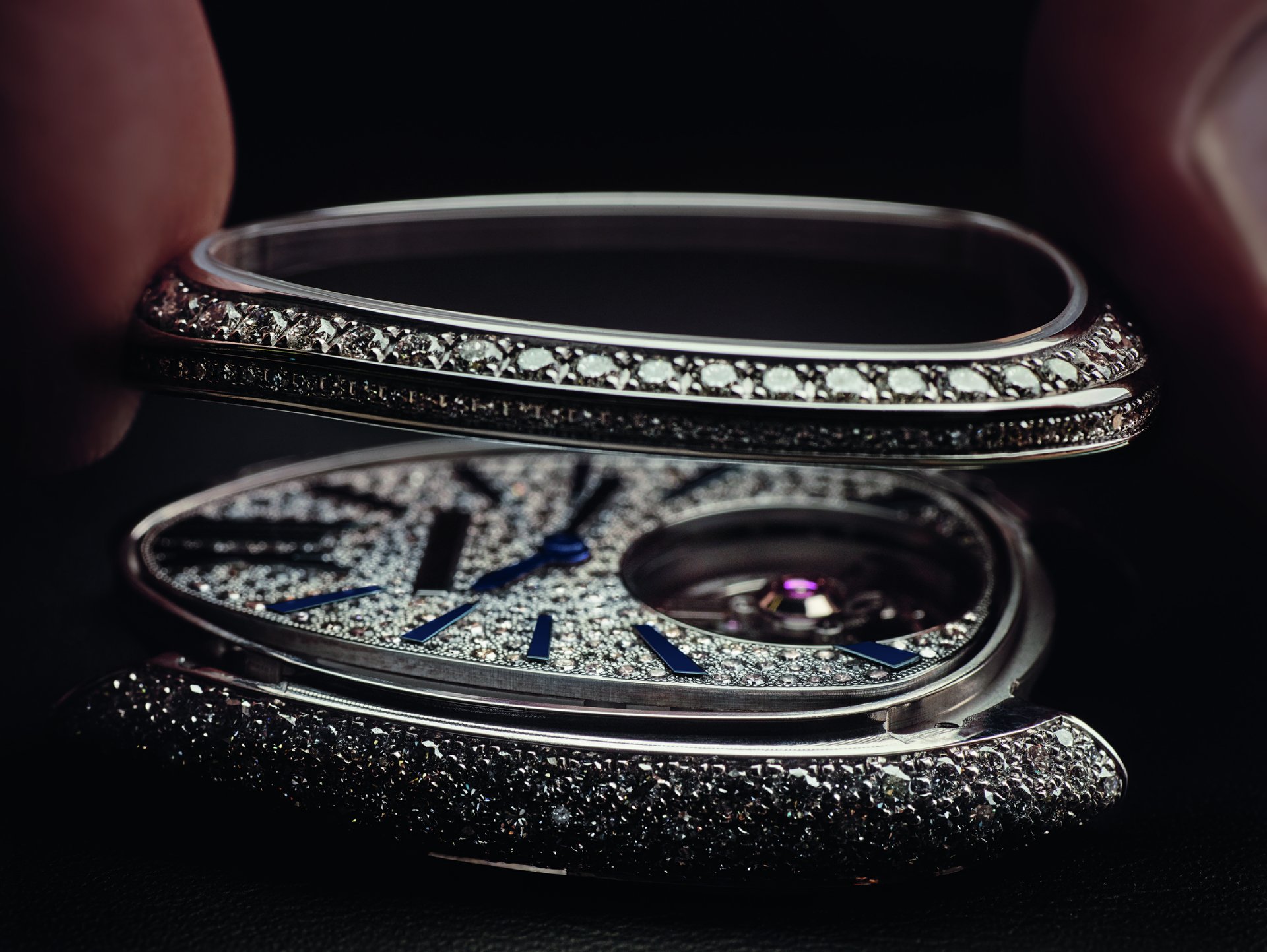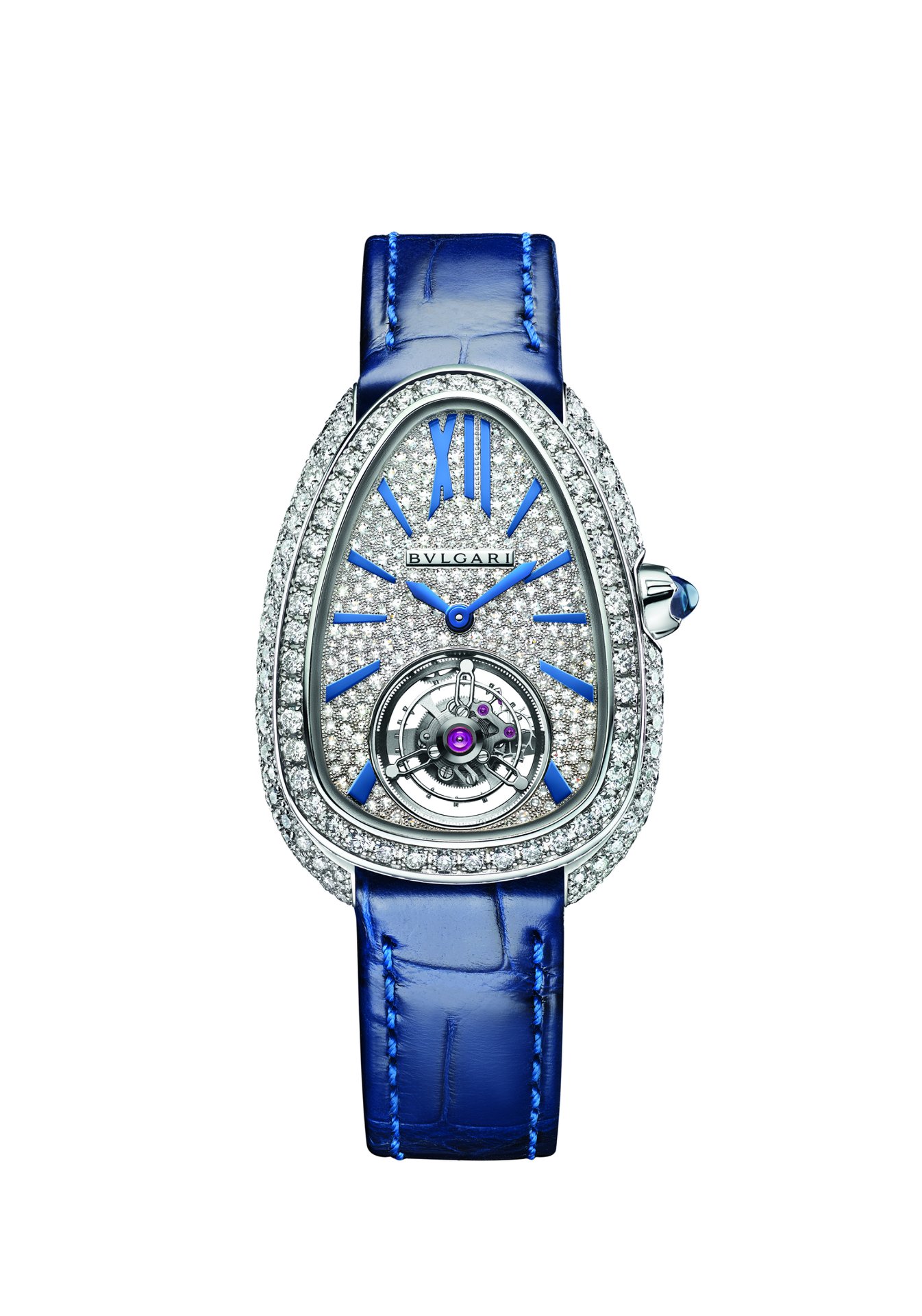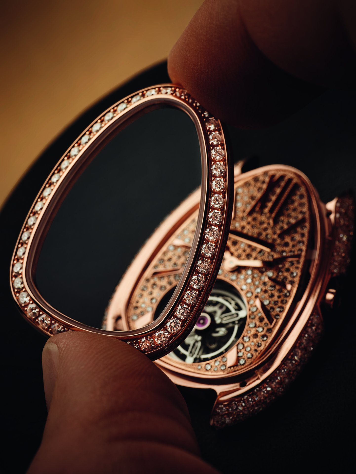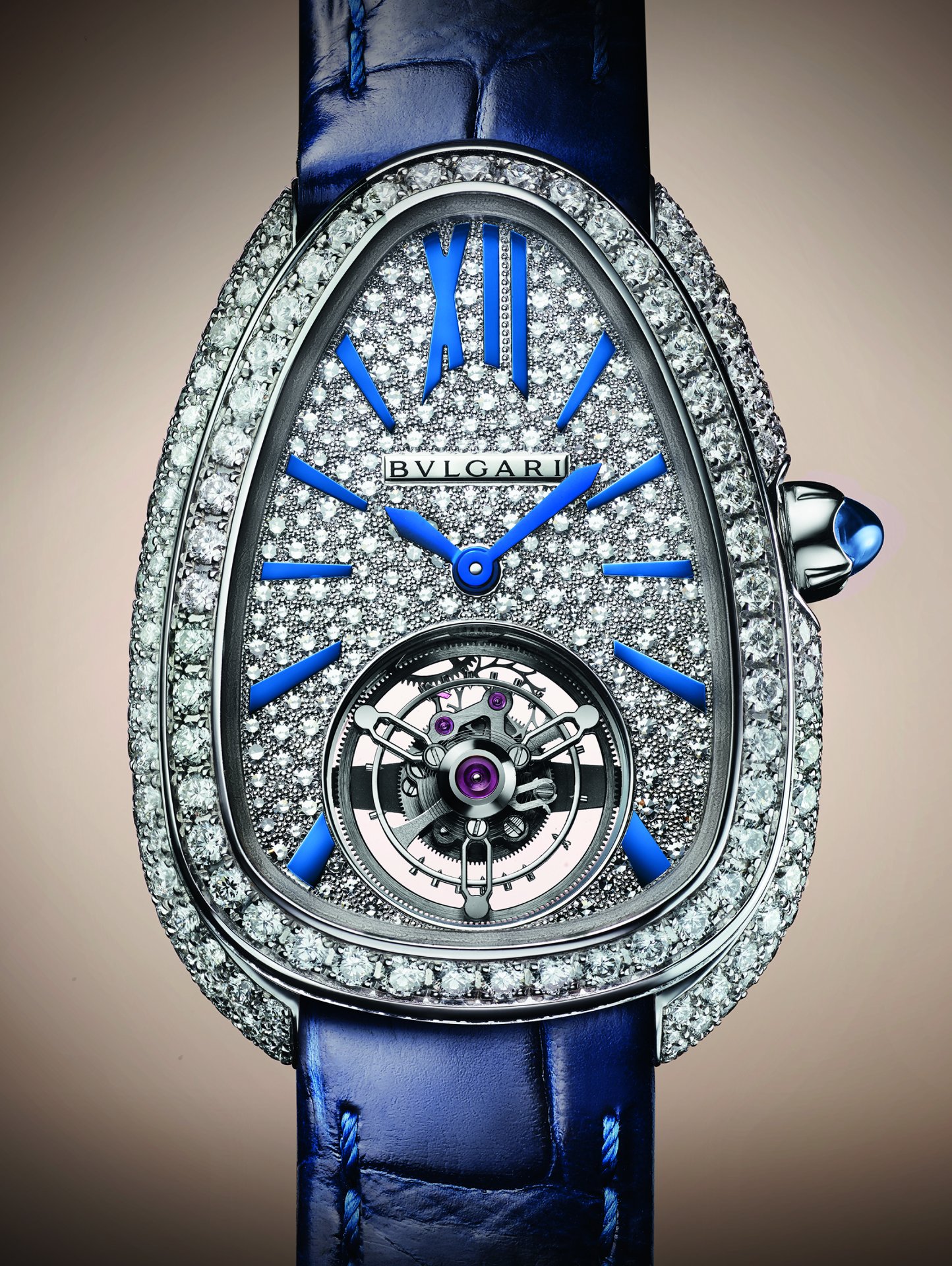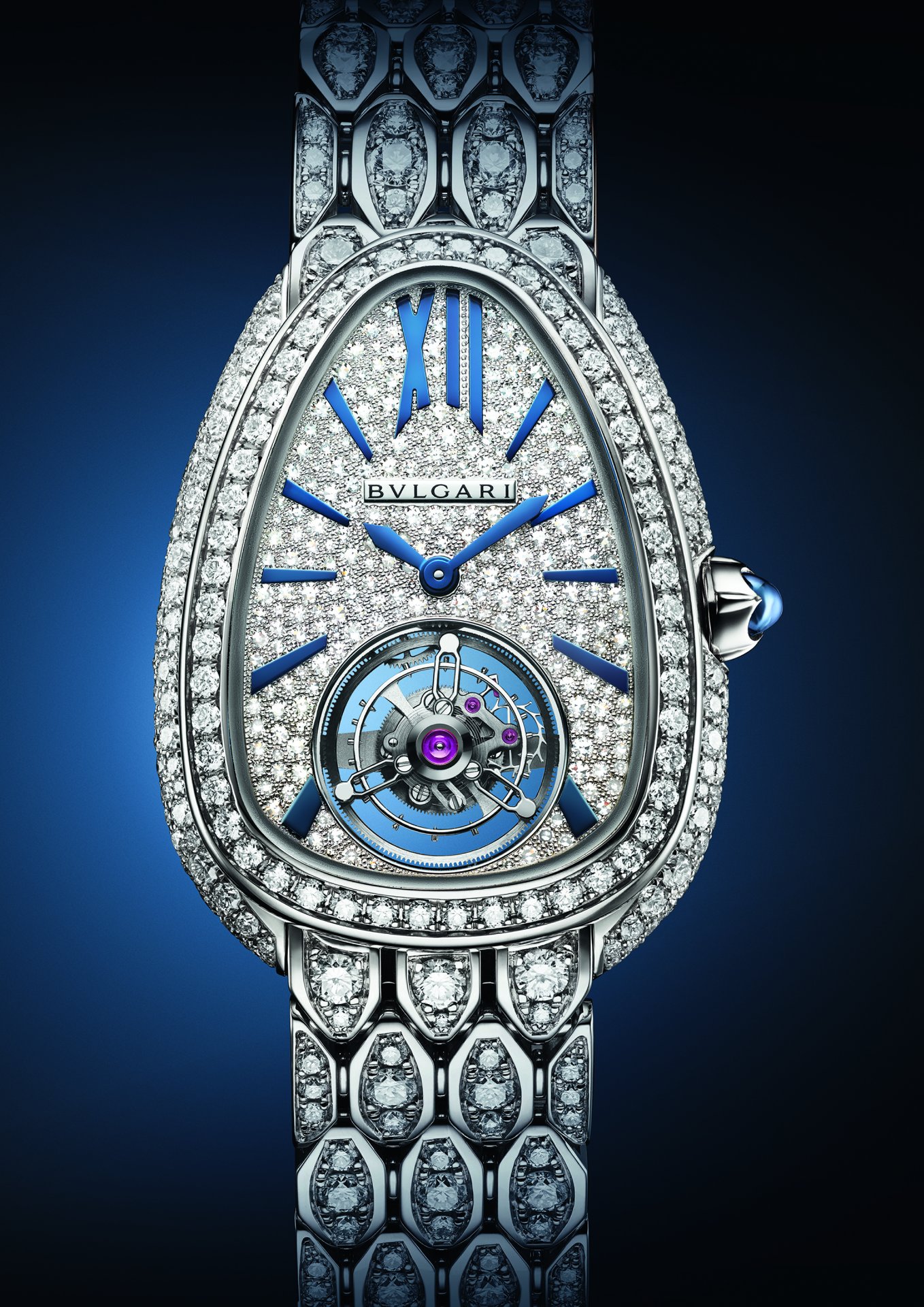 Designed to fit the Serpenti-shaped case, this small-sized shaped Haute Horlogerie movement is rhodium-plated, hand-decorated with Côtes de Genève, perlage and beveling, and features one sapphire bridge. Unlike other watchmakers, Bvlgari adapts the technical considerations to suit the aesthetics, and thus chose a transparent sapphire backcase at the level of the tourbillon to highlight the movement and decoration work, a winding stem inclined of 6 degrees, located between 2h and 3h, and special pavé setting to achieve as thin a case as possible.