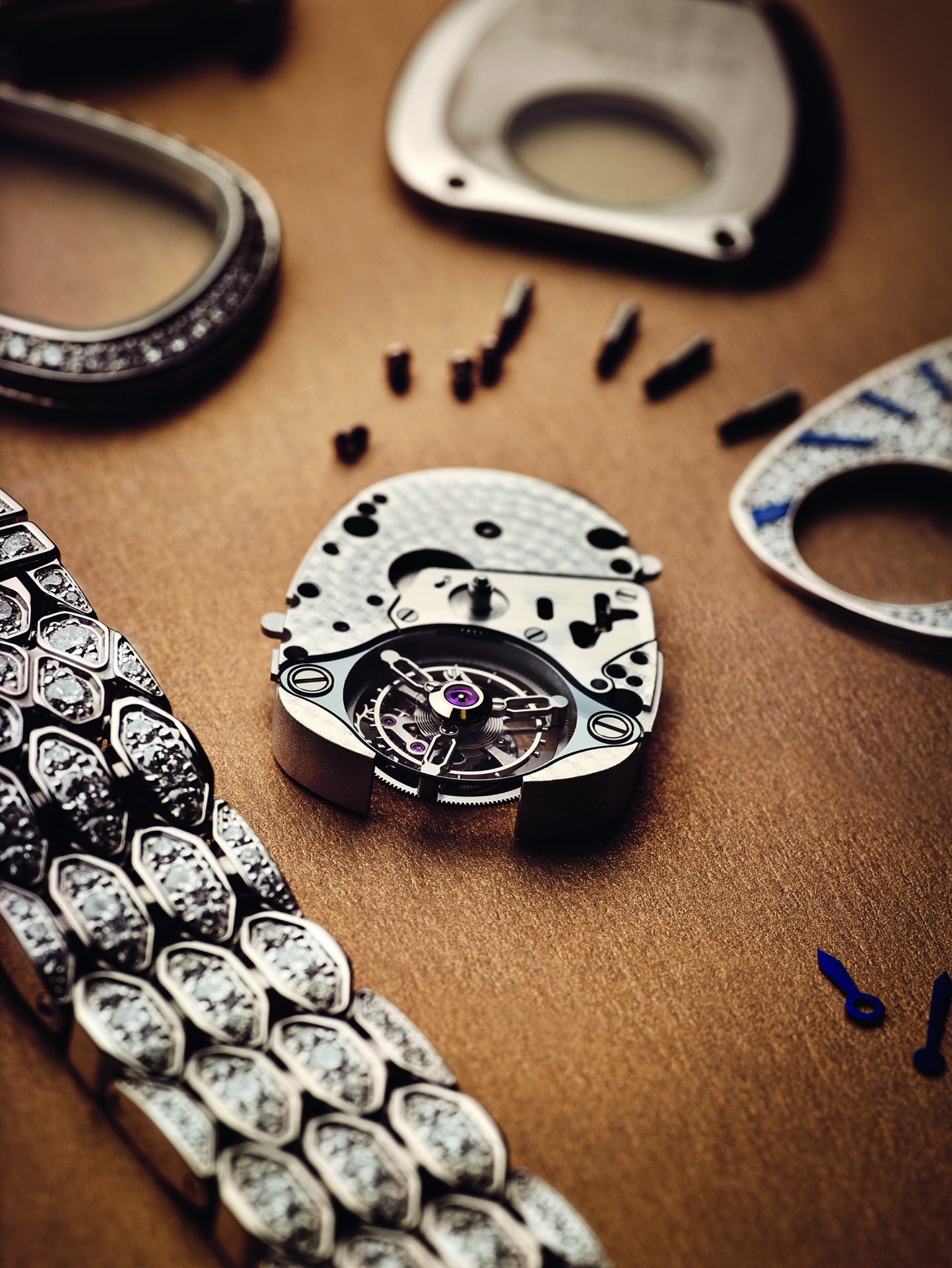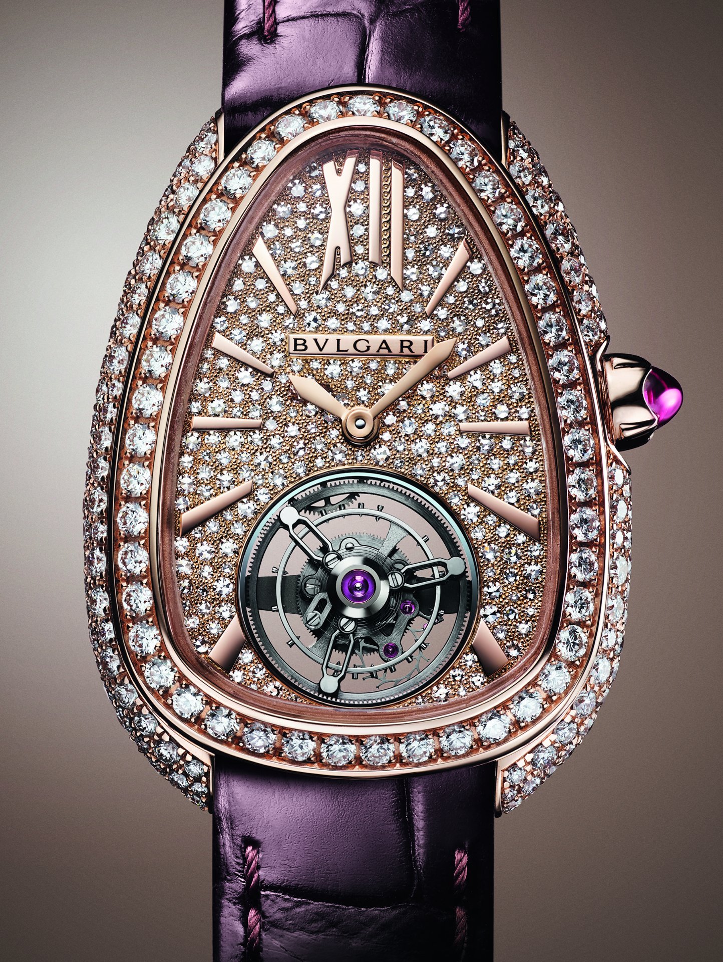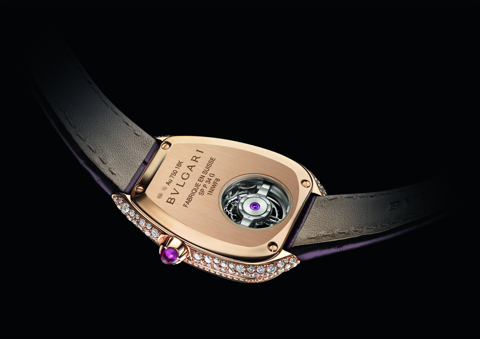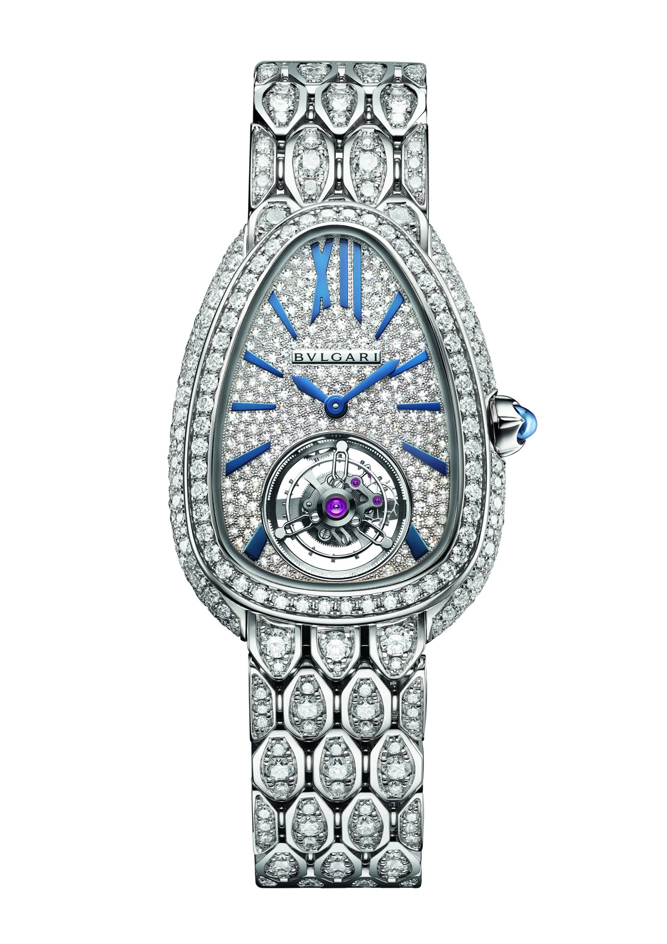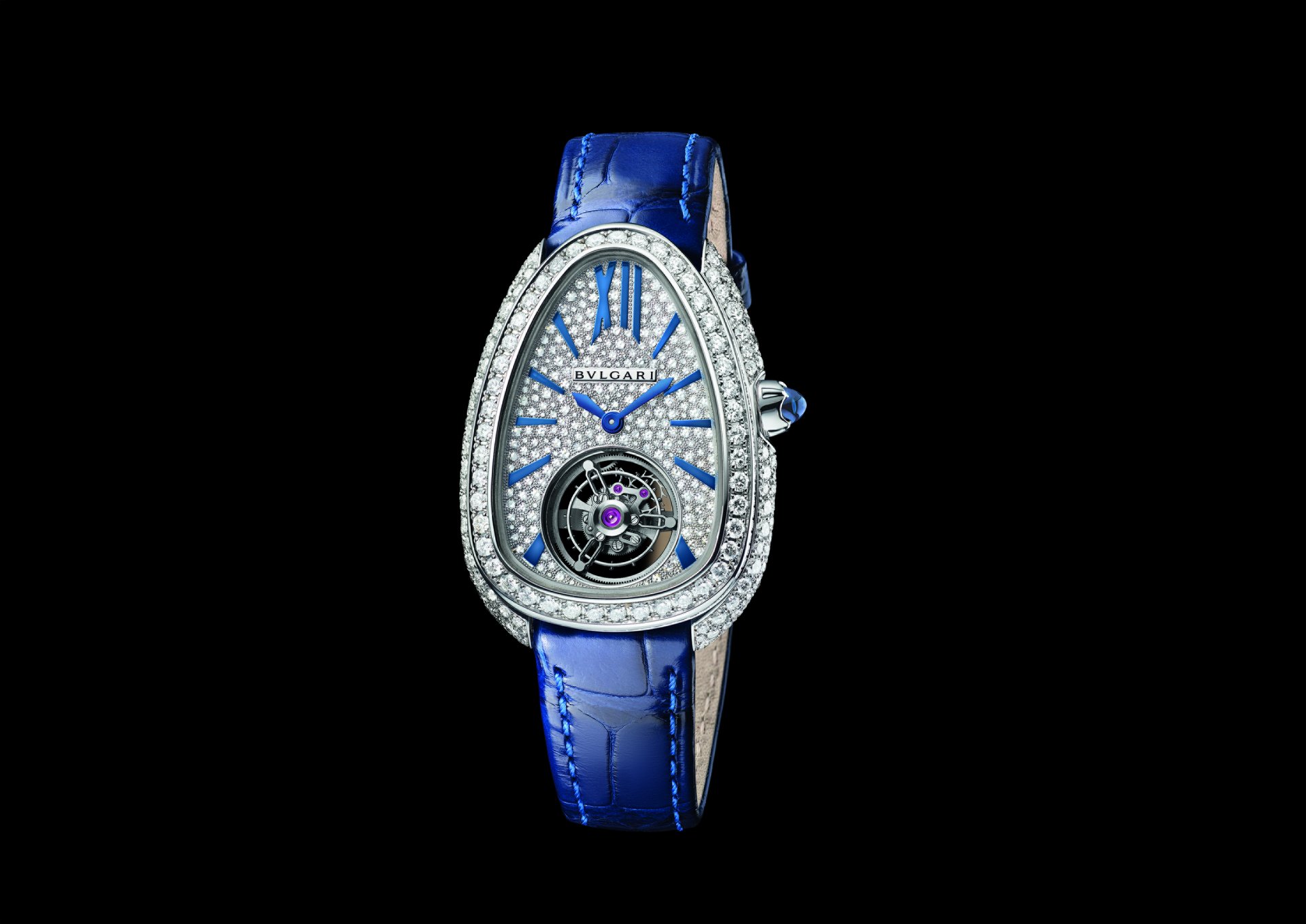Designed to fit the Serpenti-shaped case, this small-sized shaped Haute Horlogerie movement is rhodium-plated, hand-decorated with Côtes de Genève, perlage and beveling, and features one sapphire bridge. Unlike other watchmakers, Bvlgari adapts the technical considerations to suit the aesthetics, and thus chose a transparent sapphire backcase at the level of the tourbillon to highlight the movement and decoration work, a winding stem inclined of 6 degrees, located between 2h and 3h, and special pavé setting to achieve as thin a case as possible.